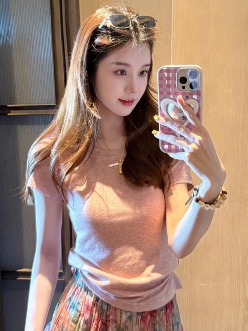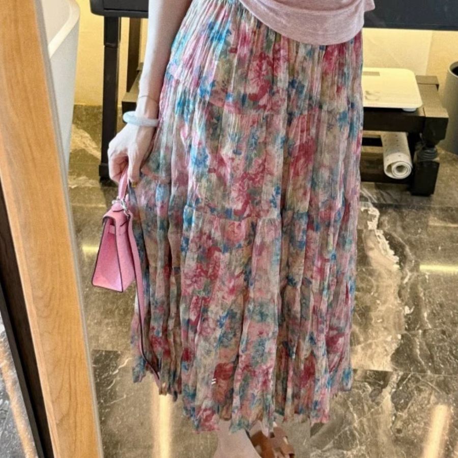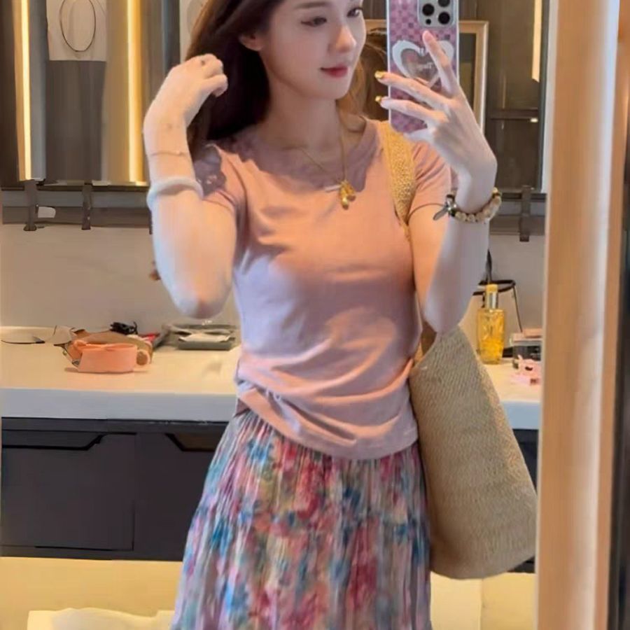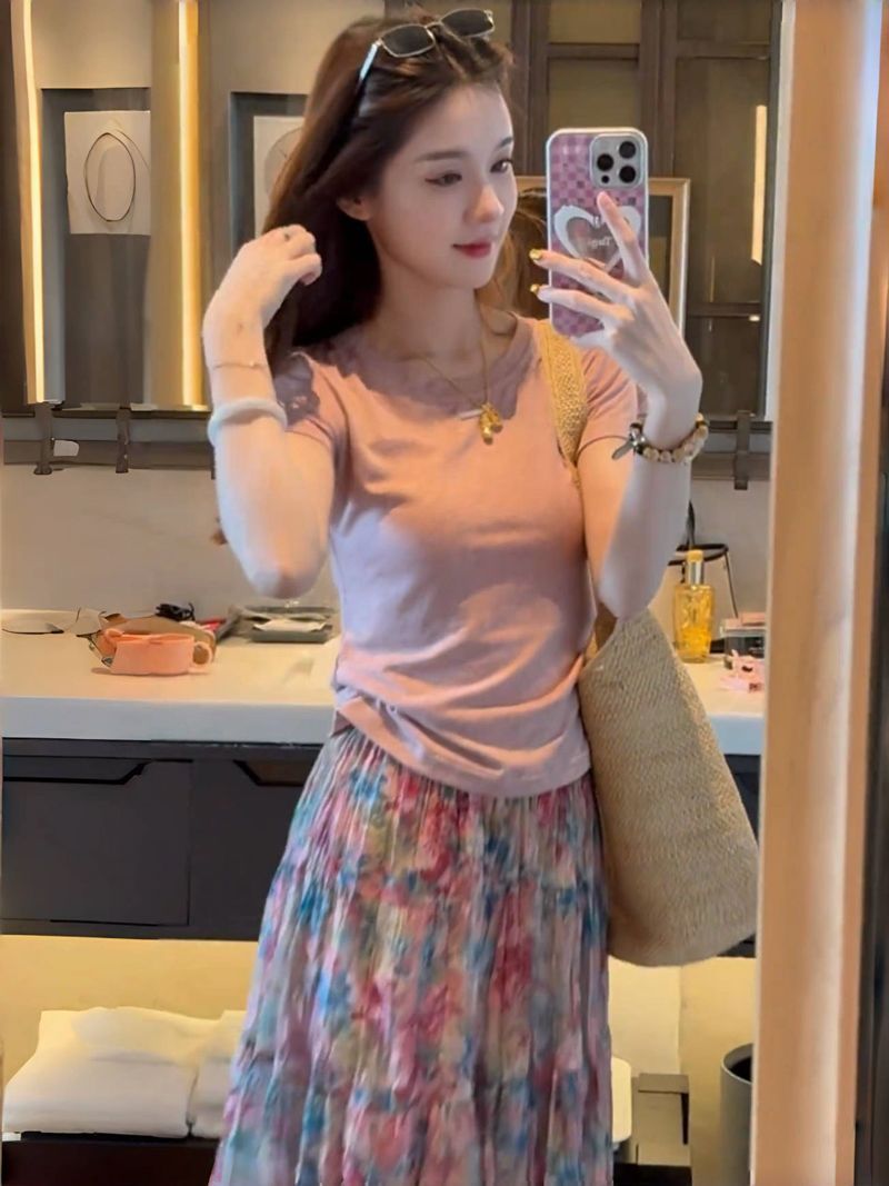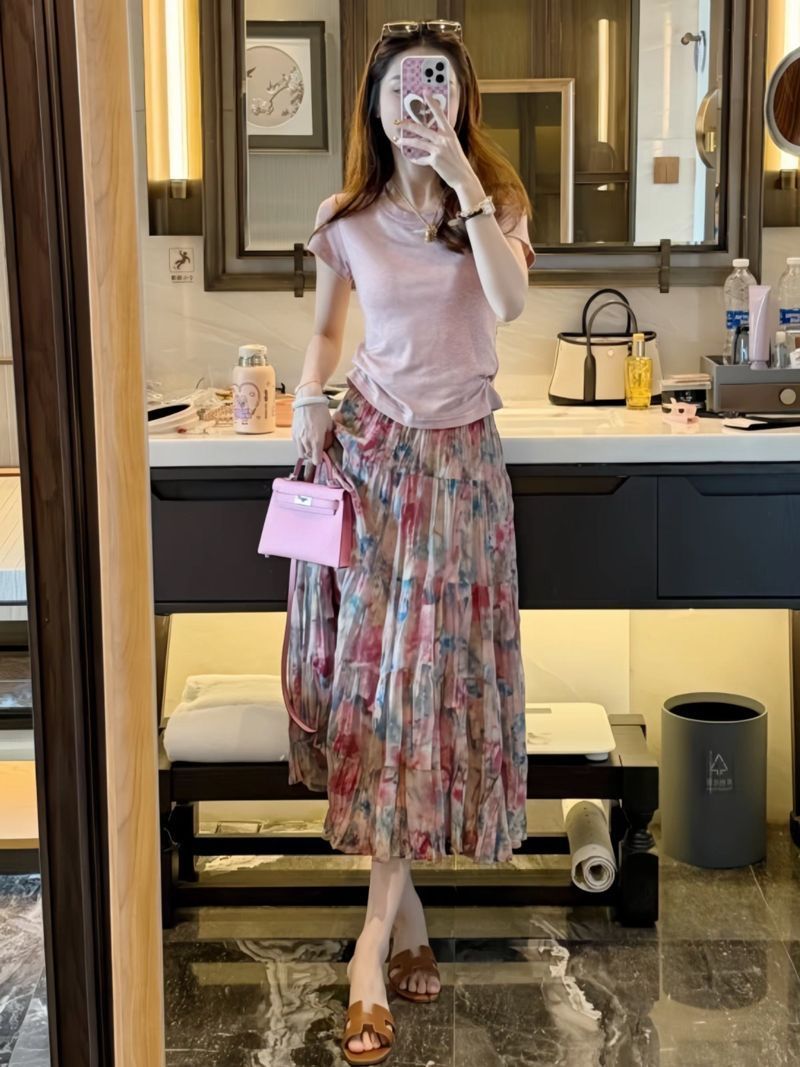 Красивый летний костюм для женщин 2025, новый стиль, нежный стиль, модная футболка с коротким рукавом, юбка с цветочным принтом, комплект из двух предметов