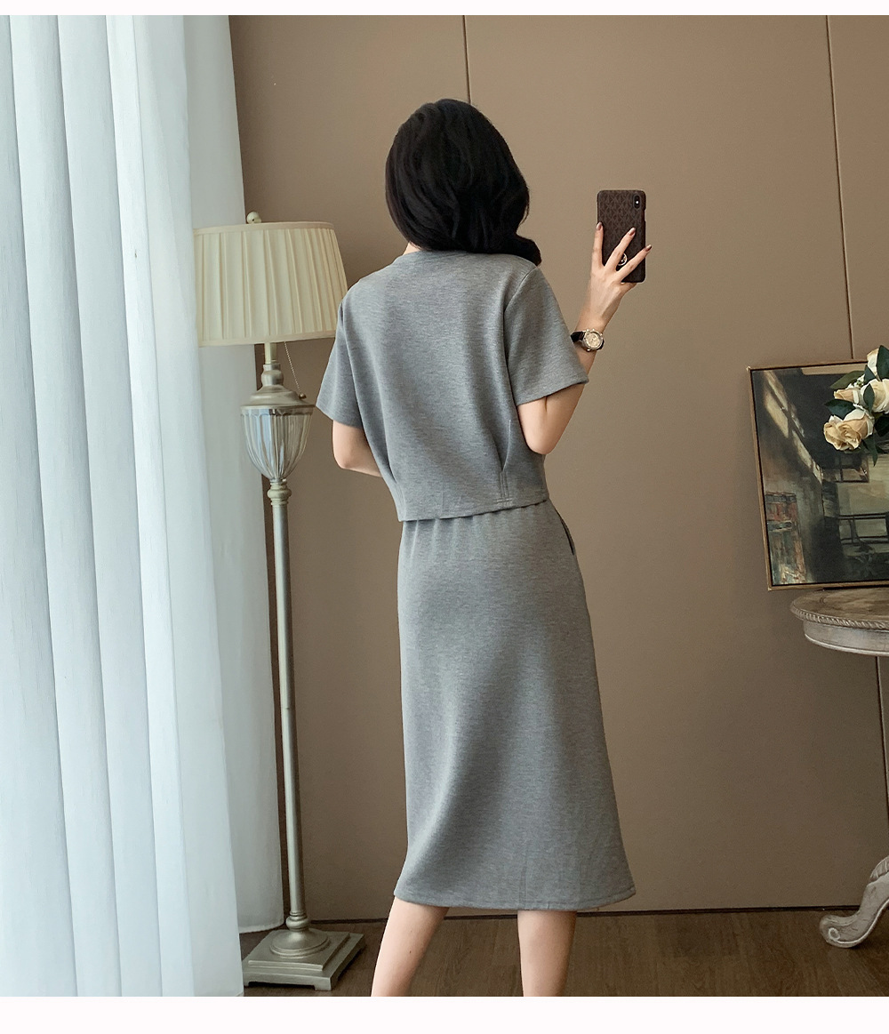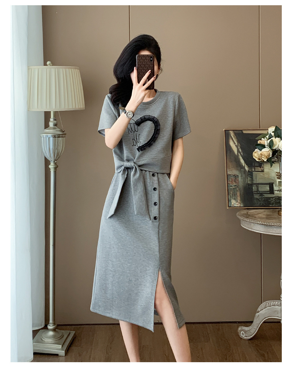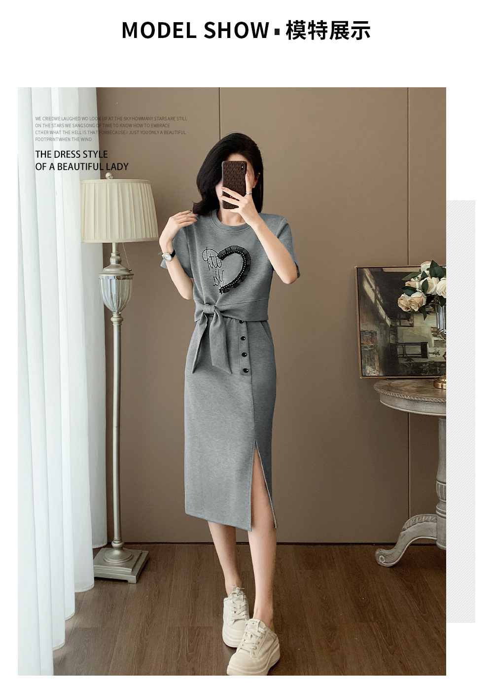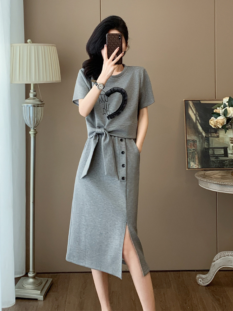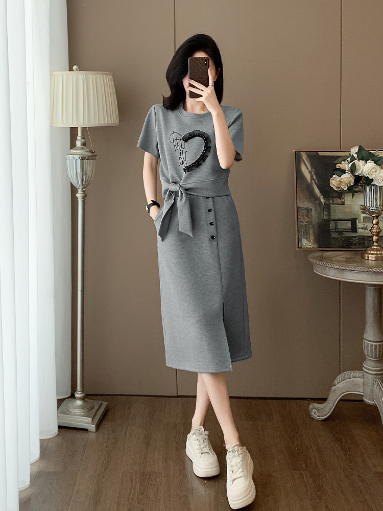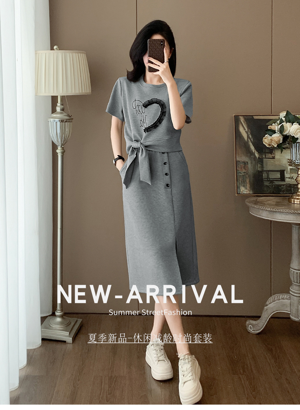 Летний костюм-двойка для женщин 2025 года, серый, молодежный стиль, модный, повседневный, стройнящий, короткий рукав, юбка