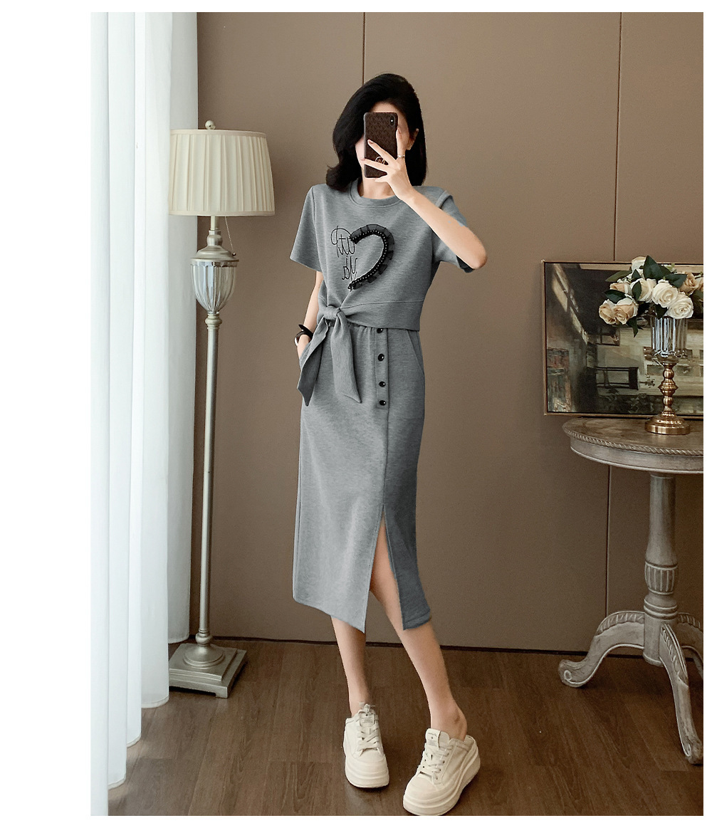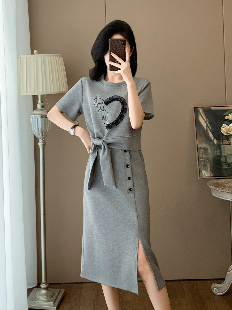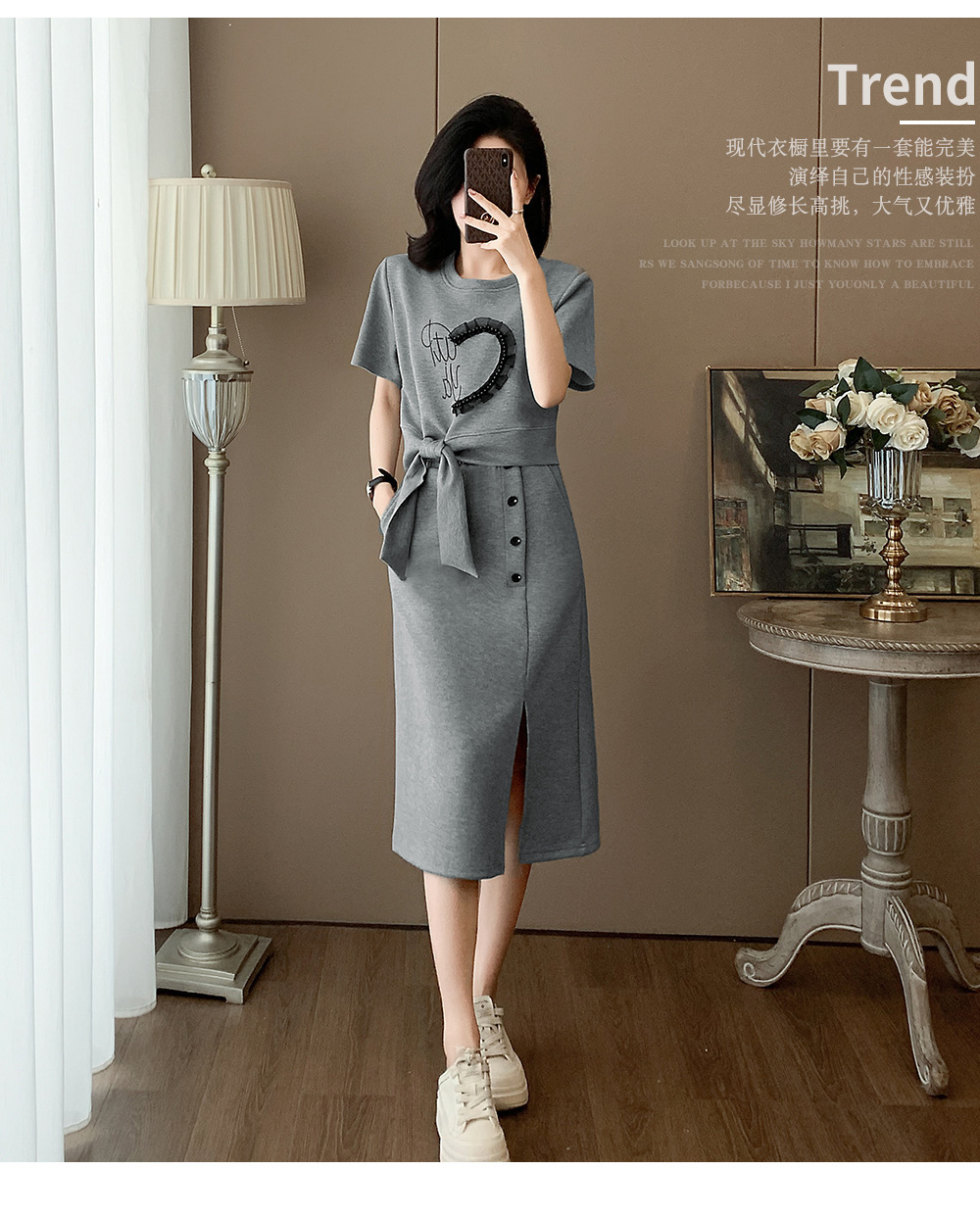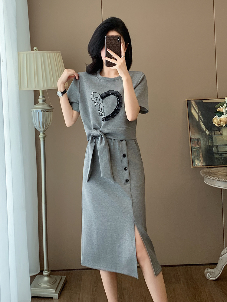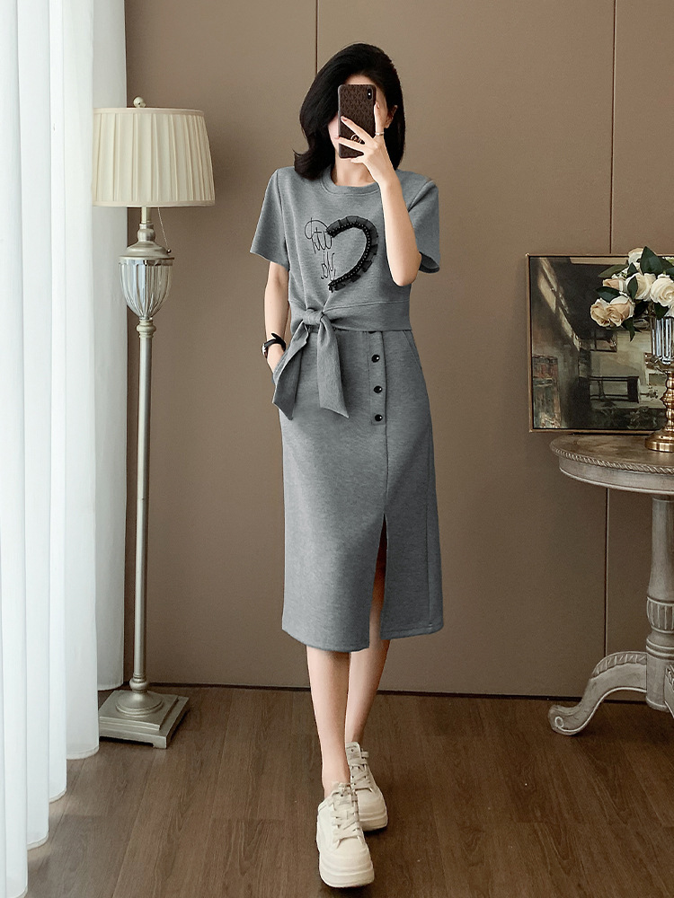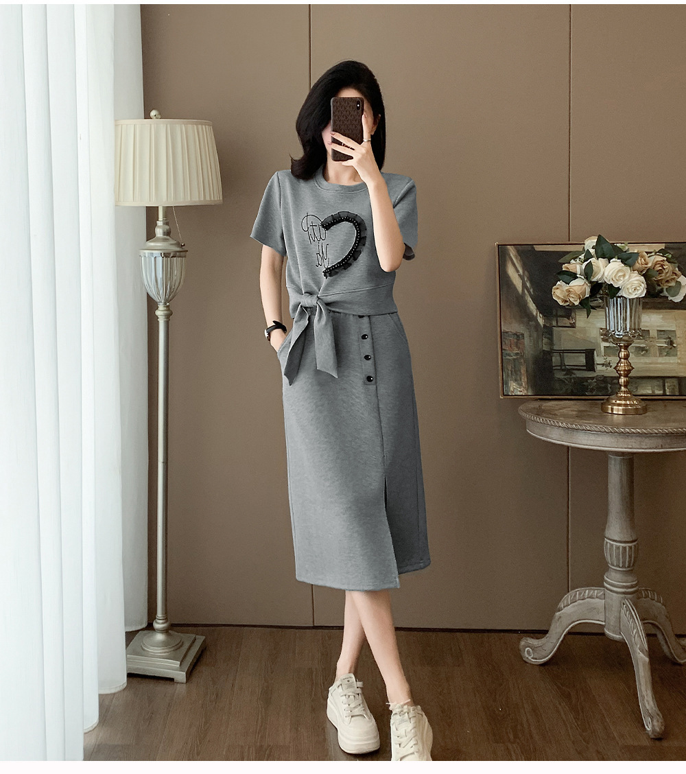 Летний костюм-двойка для женщин 2025 года, серый, молодежный стиль, модный, повседневный, стройнящий, короткий рукав, юбка