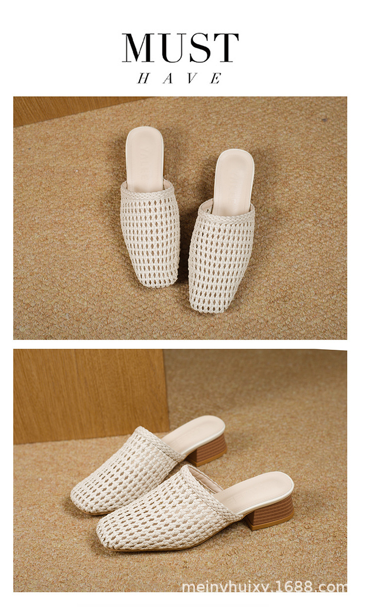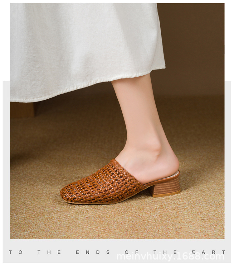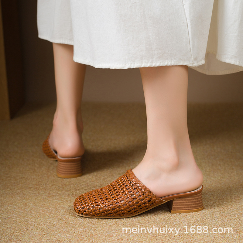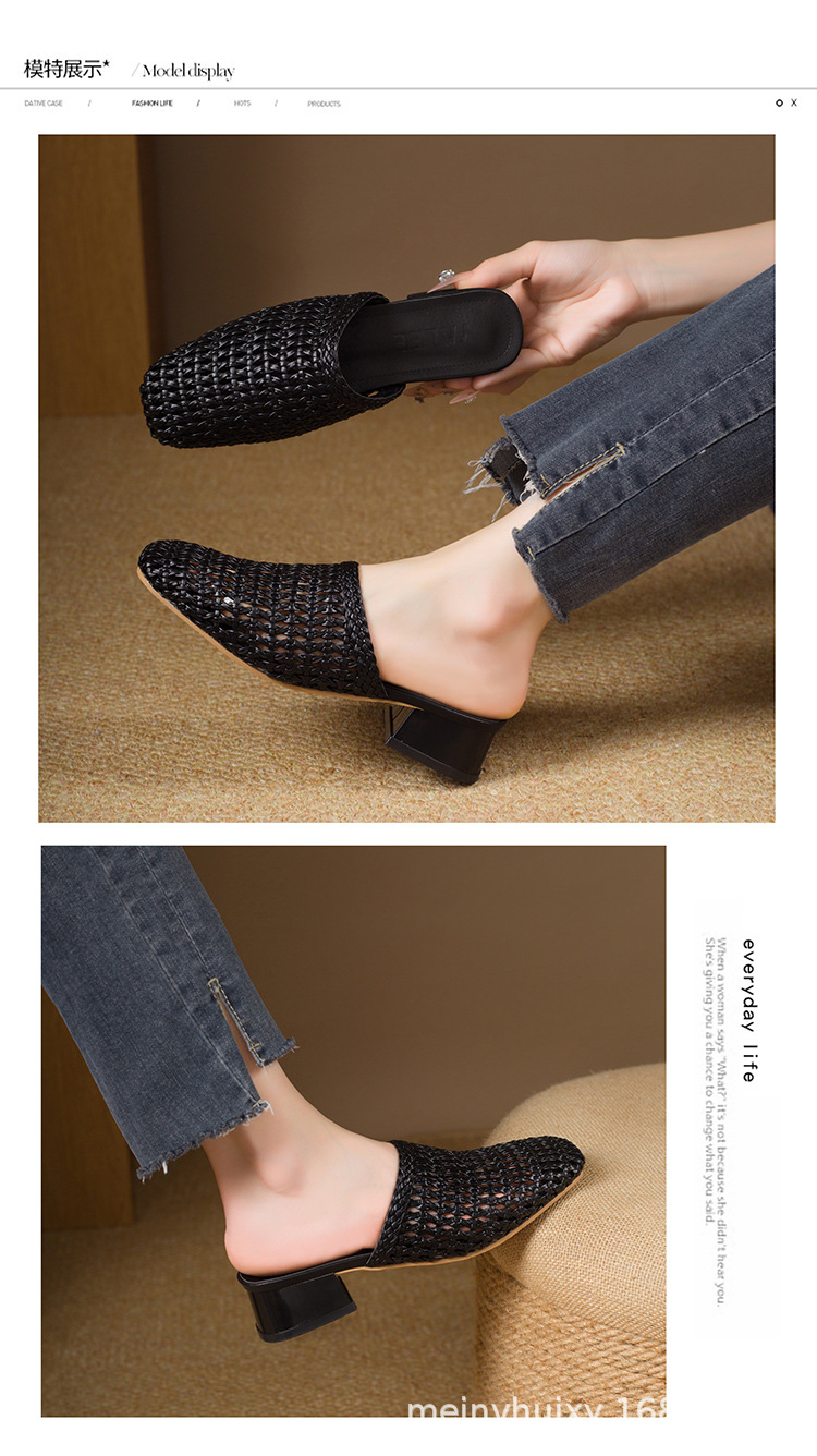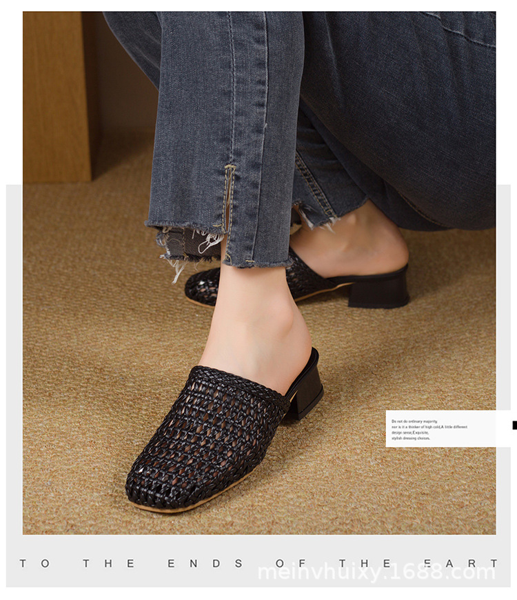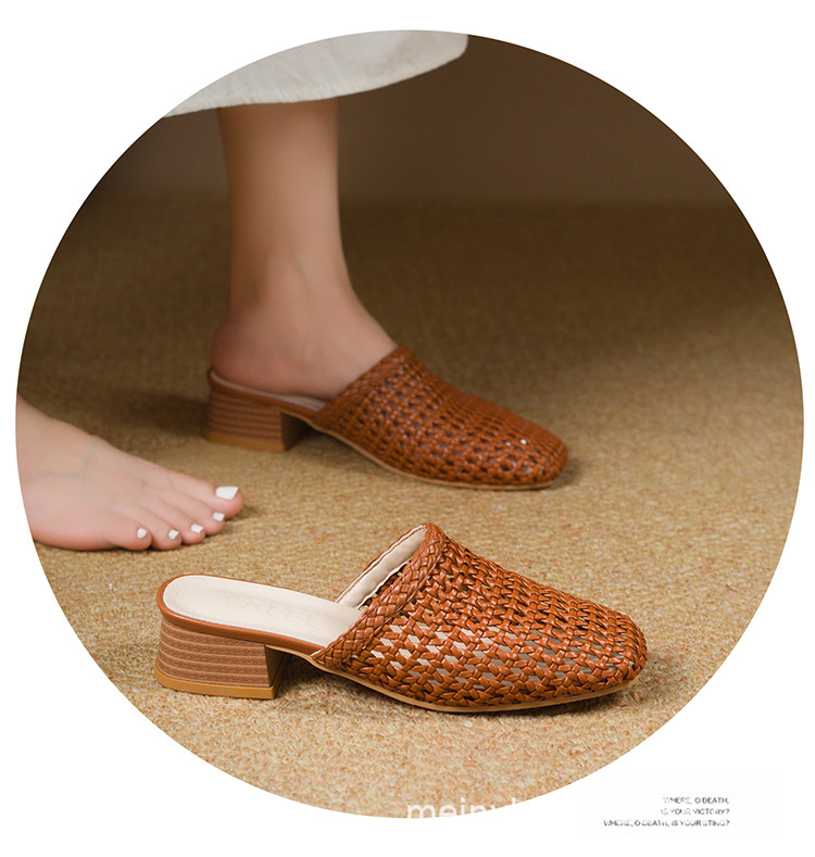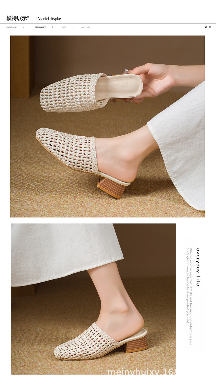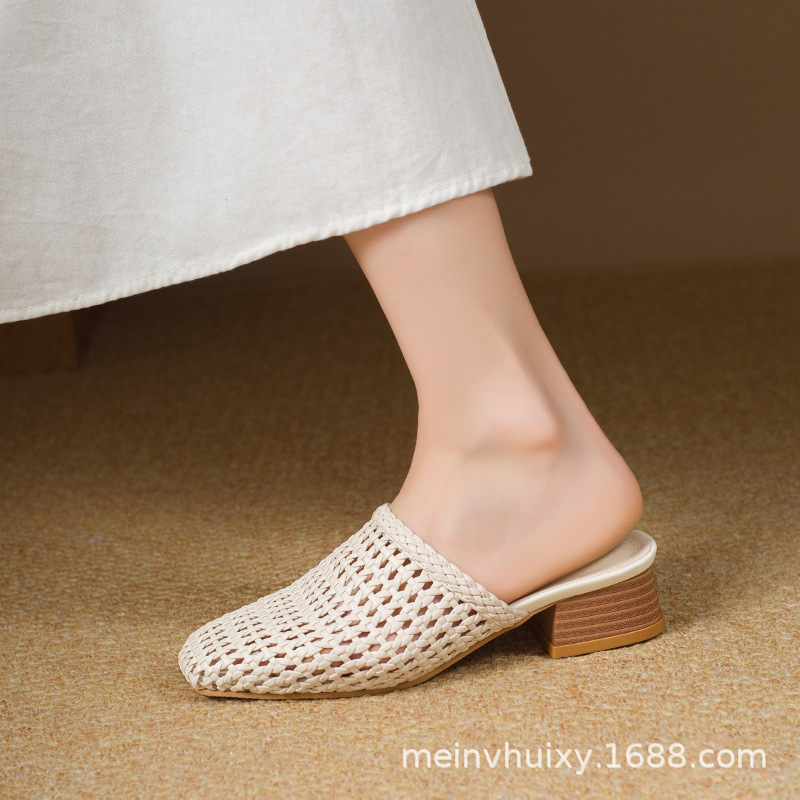 Женские плетеные сандалии с открытым носком, лето 2025, новая мода, дышащие, квадратный носок, средний толстый каблук, ажурные шлепанцы, кросс-граничная торговля