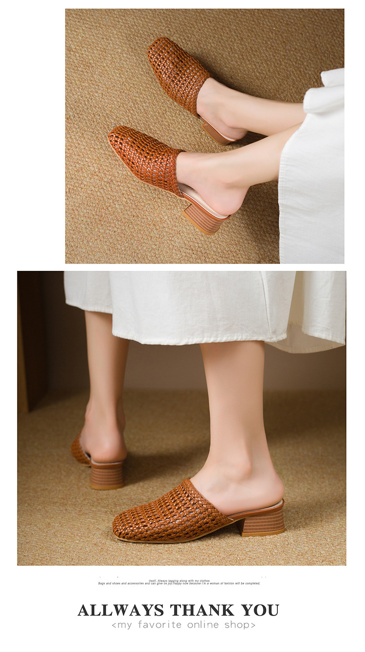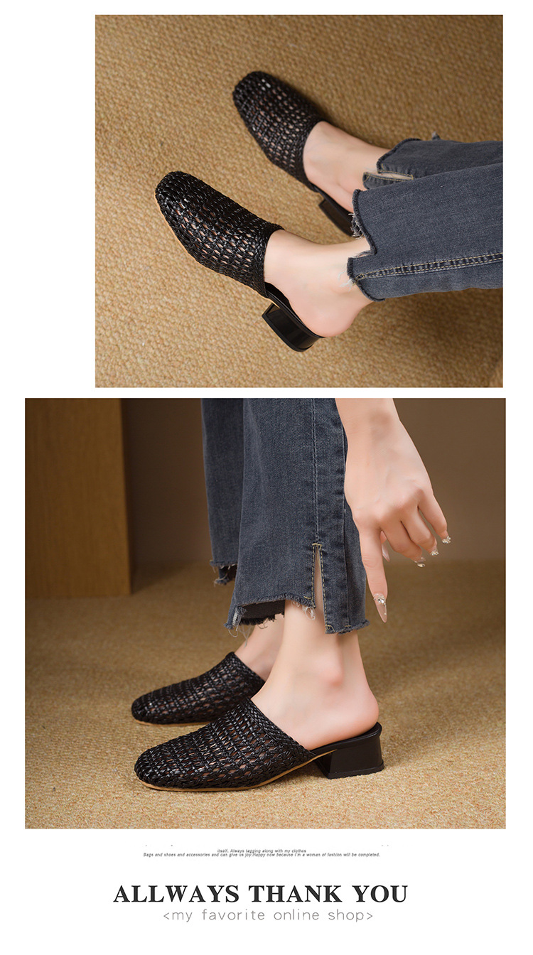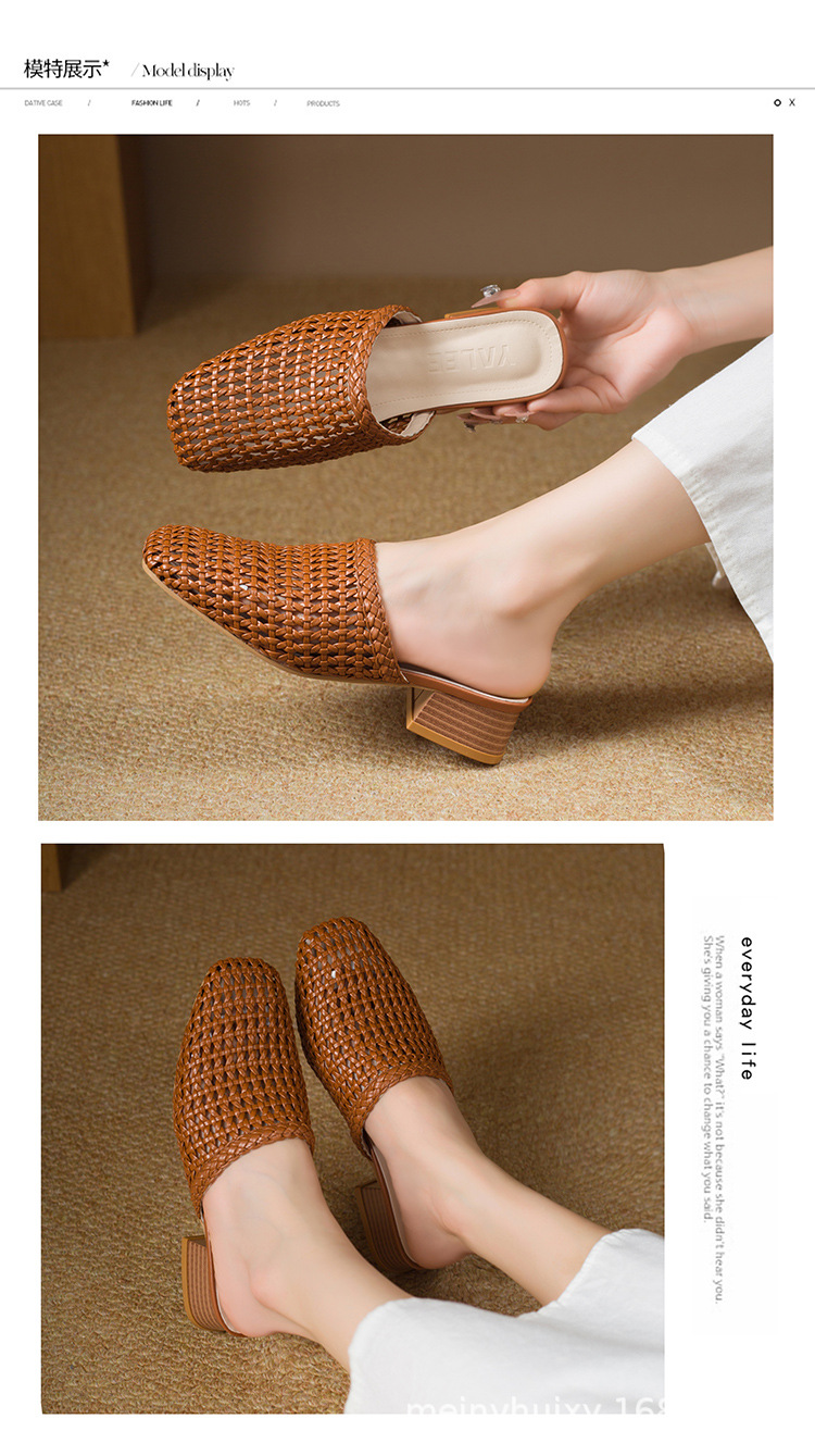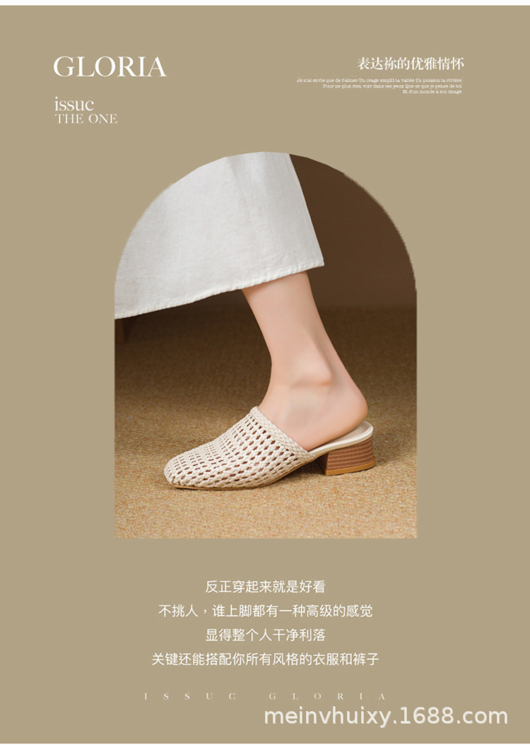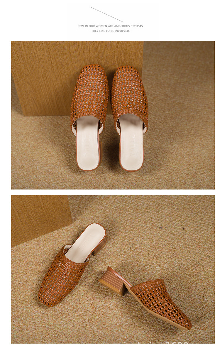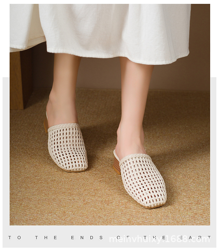 Женские плетеные сандалии с открытым носком, лето 2025, новая мода, дышащие, квадратный носок, средний толстый каблук, ажурные шлепанцы, кросс-граничная торговля