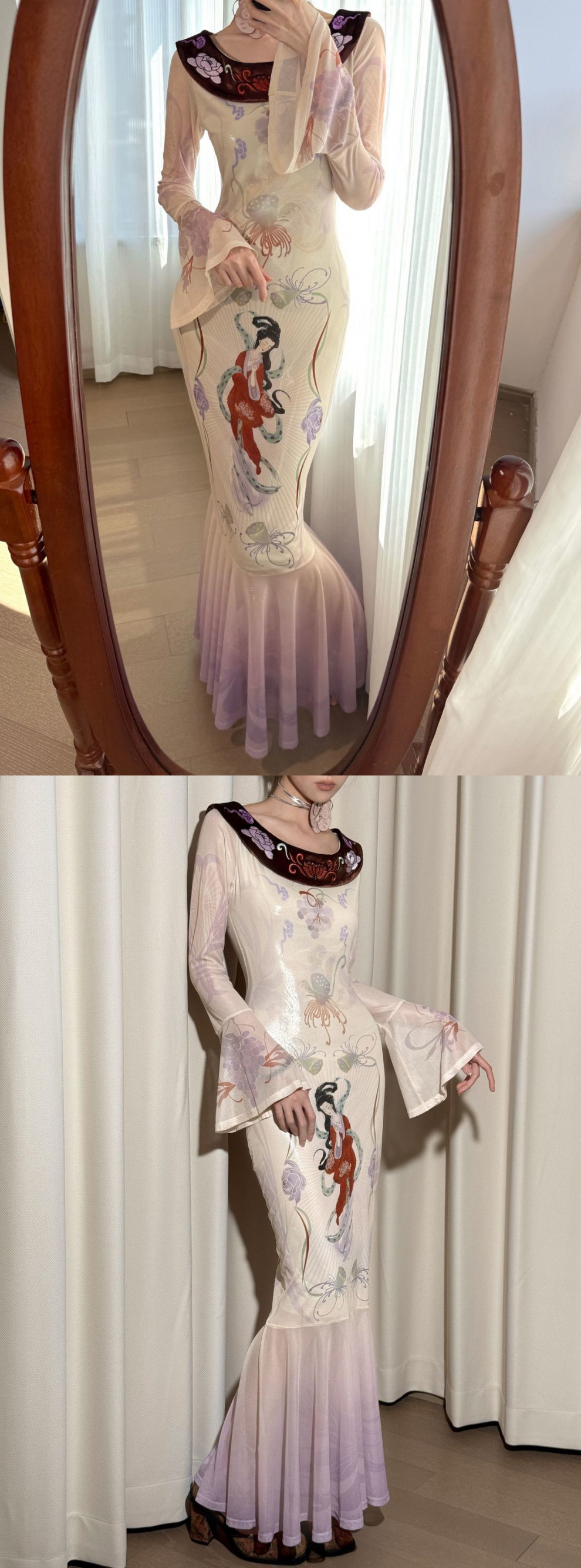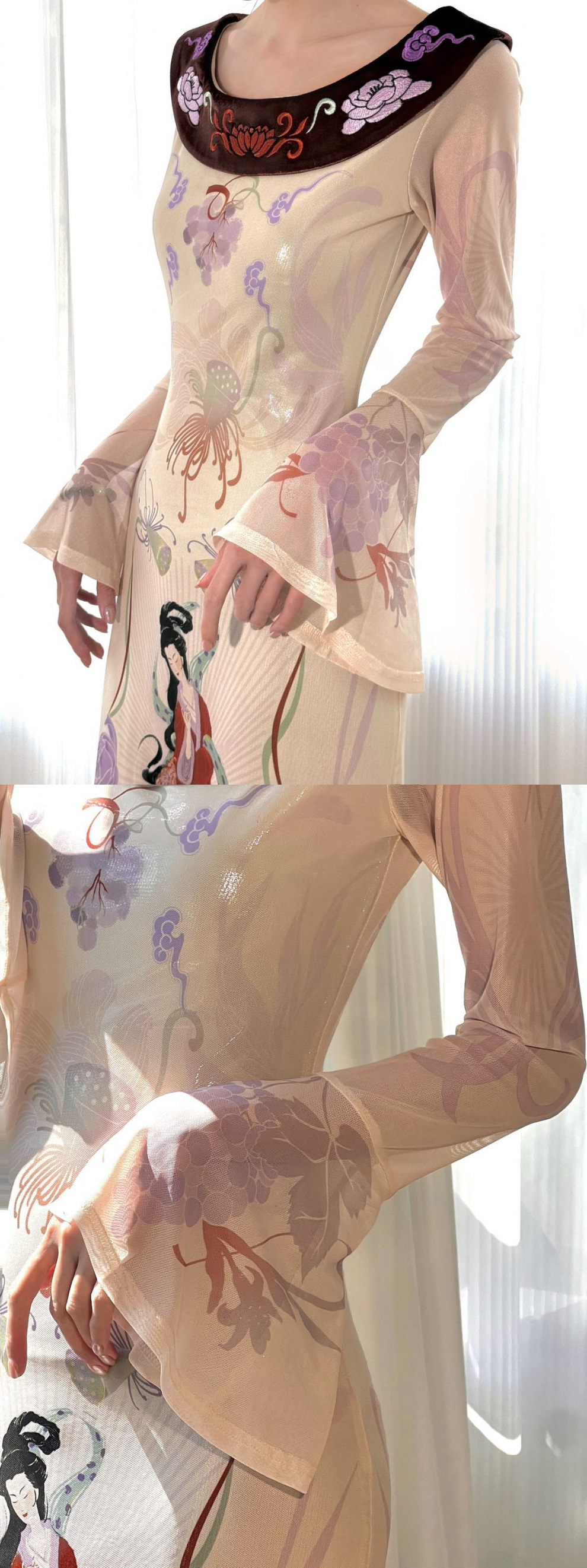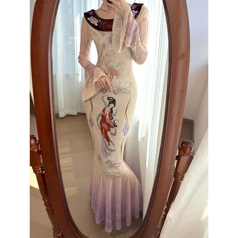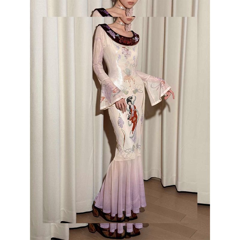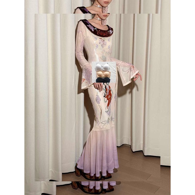 Летнее платье 2025 года с принтом в стиле феи, новый китайский стиль, микро-клеш, вышитый воротник, нюдово-розовый цвет, для женщин