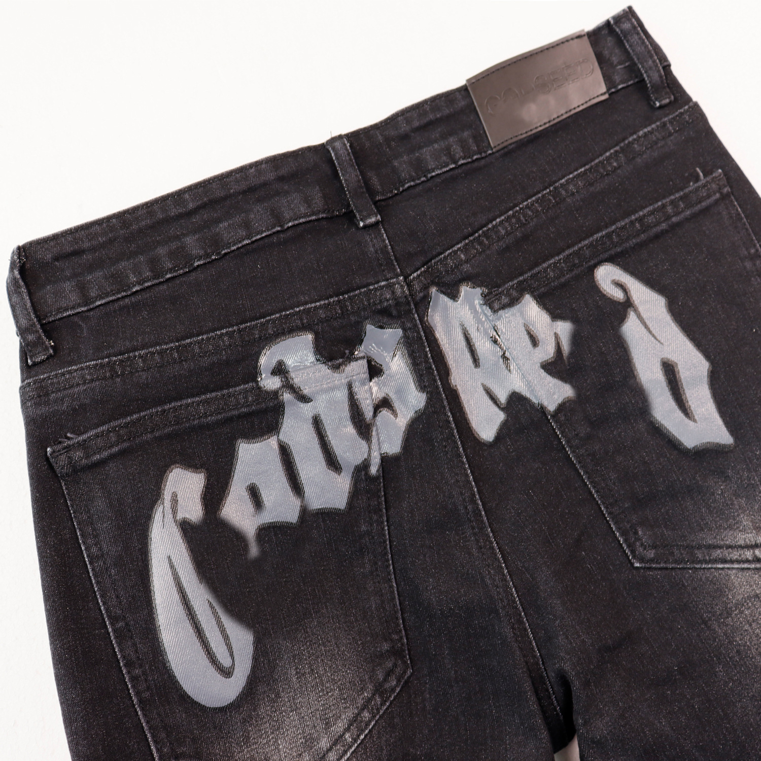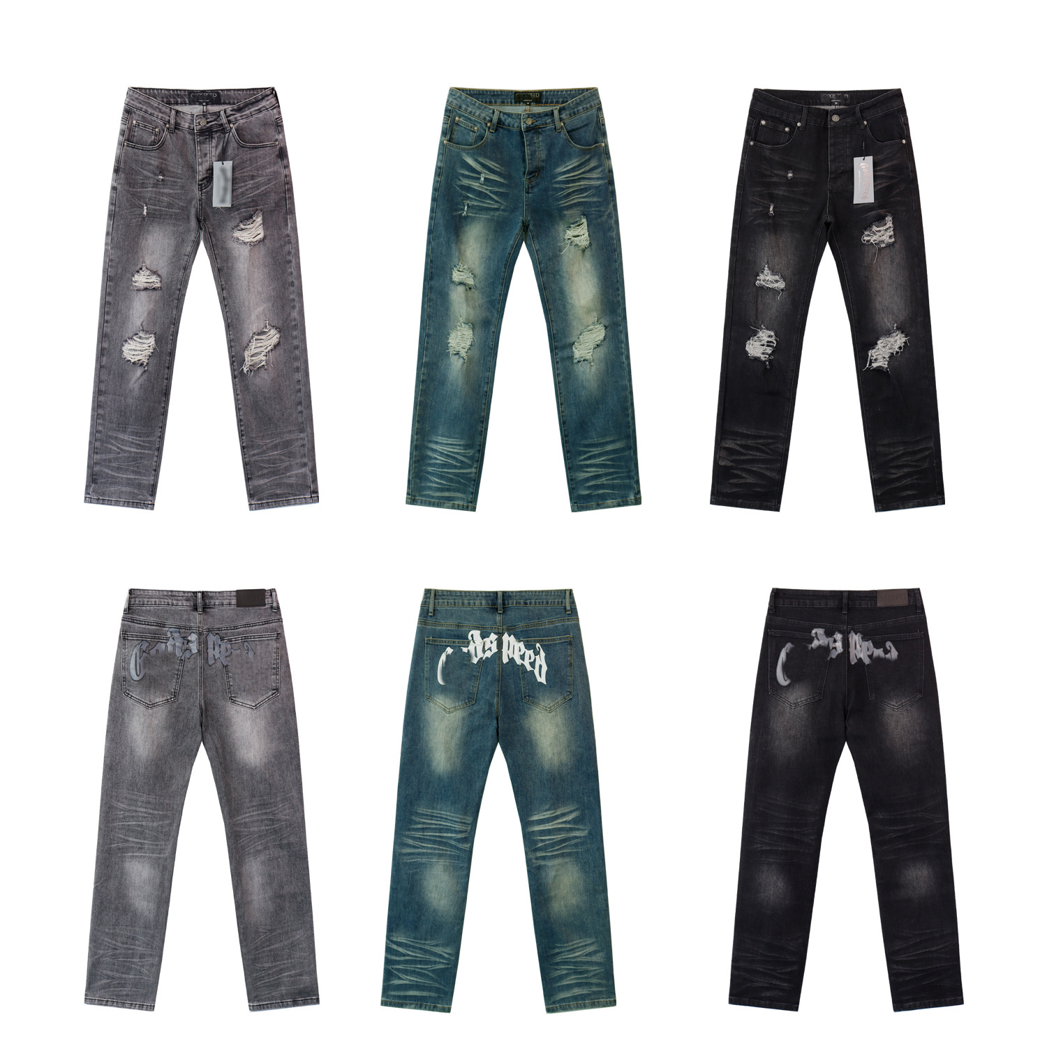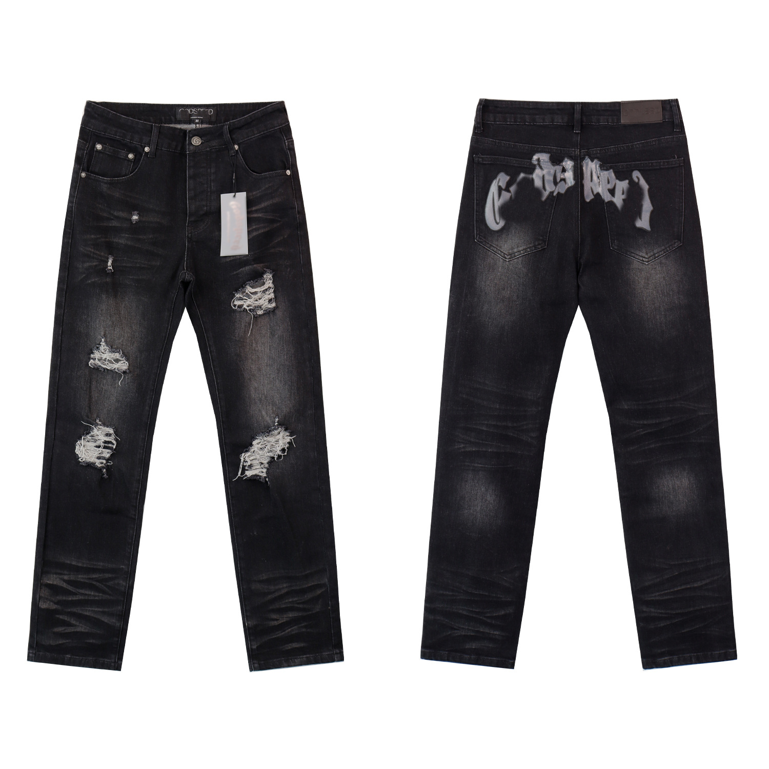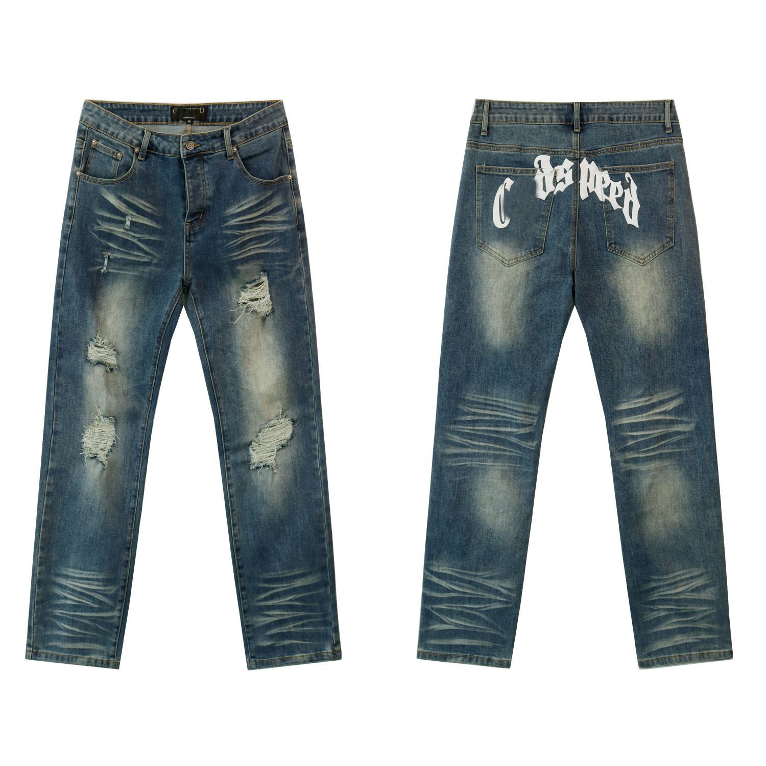 Американские модные джинсы Godsp в ретро стиле с потертостями, принтом на спине и рваными деталями, узкие мужские брюки для повседневной носки в стиле хай-стрит.