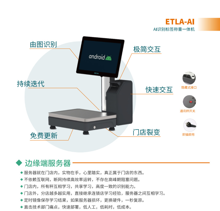 识别快,0.08秒完成识别,学习快,新增产品类1秒学习,上手快,极简交互设计,交付快,到店就能用。裂变快,新店继续学习成果