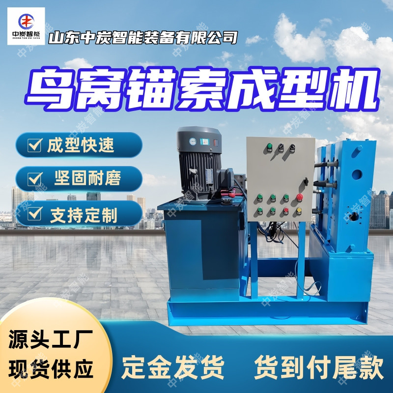 鸟巢锚索成型机是专门用于矿用锚索鸟巢的加工。本设备操作简单、效率高,且大大的节省了人力节约了成本。近几年我国采准巷道锚网支护迅速发展,鸟巢锚索成型机已被矿山广泛使用。鸟巢式锚索是加拿大、澳大利亚、美国等发达国家80年代以后广泛应用的一种新型锚索。该锚索的特点是在锚索的锚固段添加了3-4个鸟巢形的笼起。
