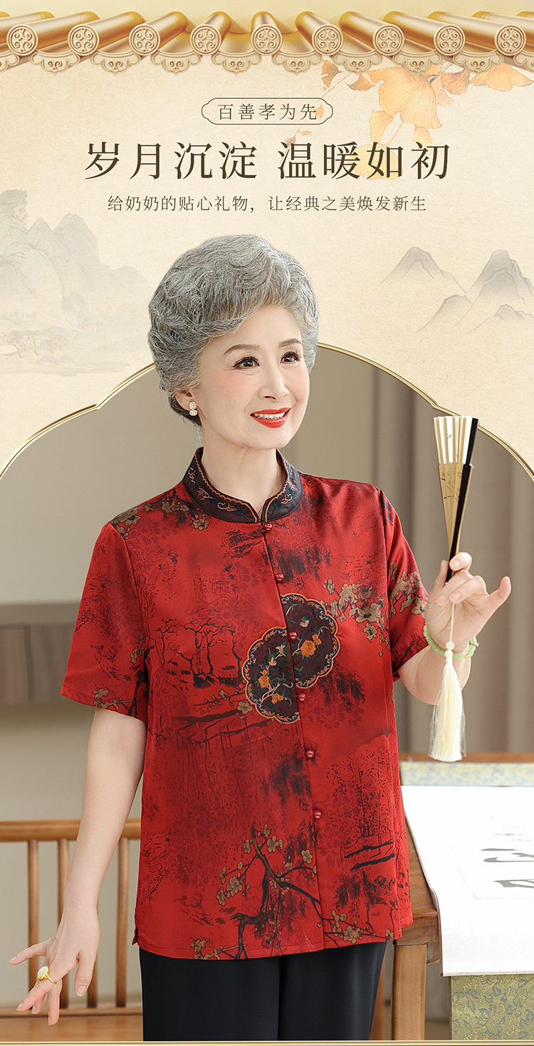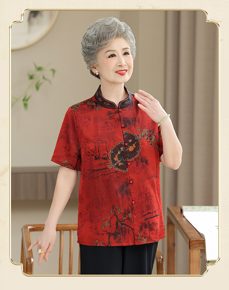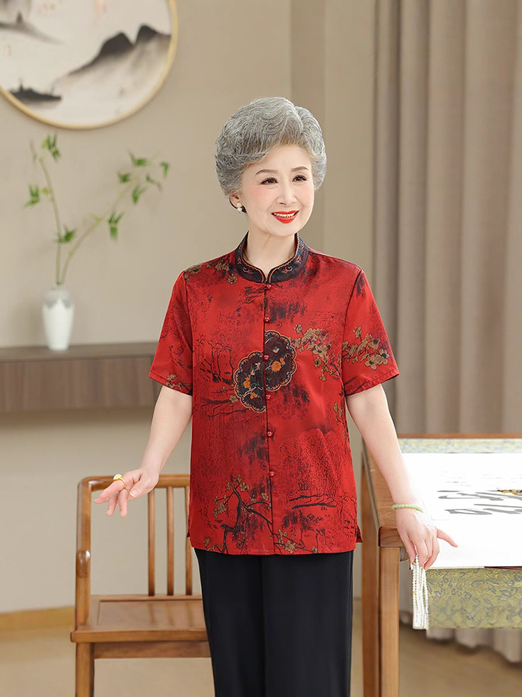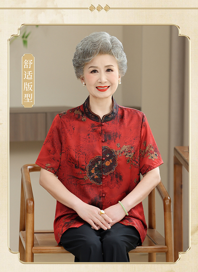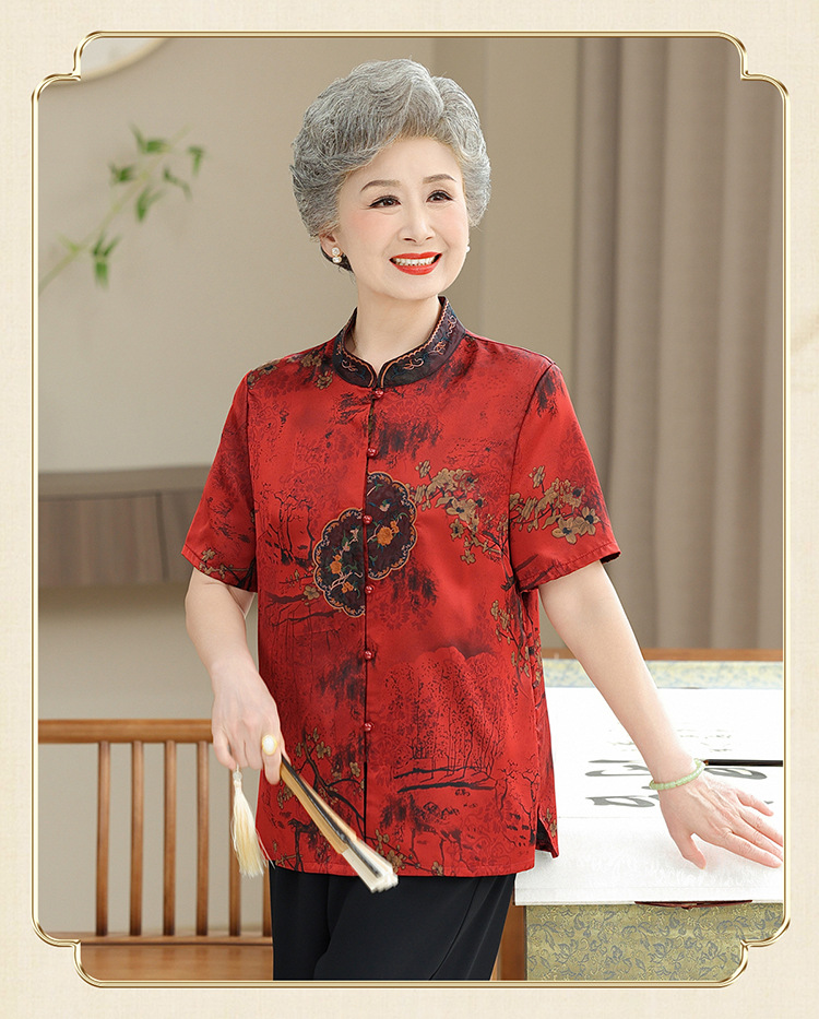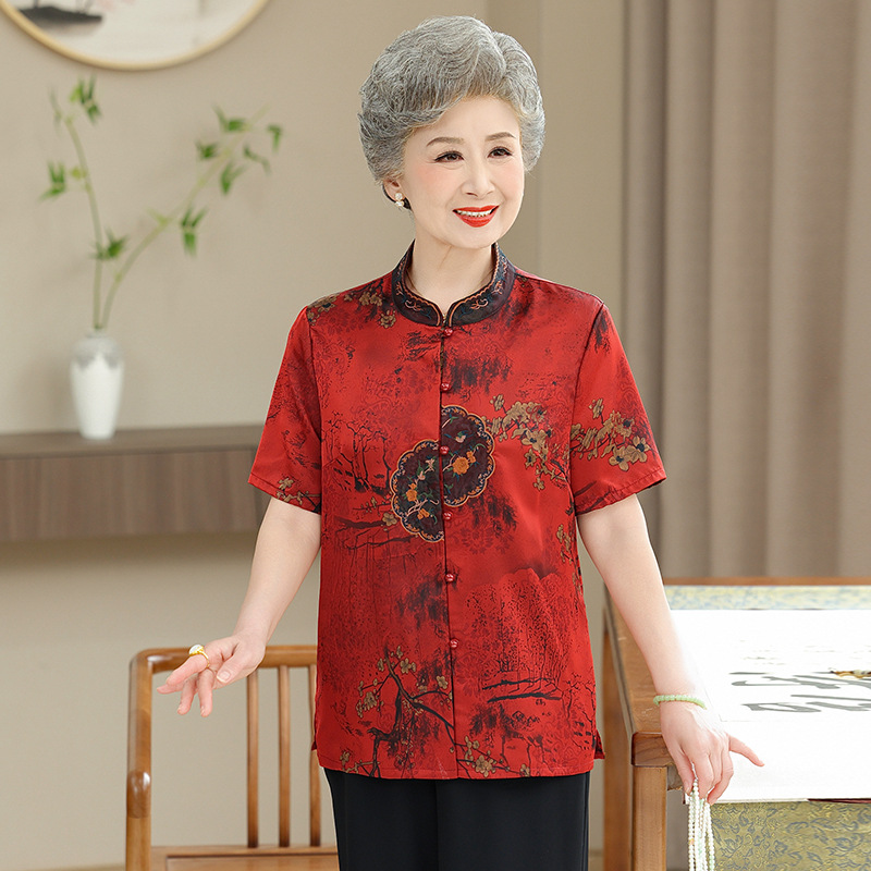 Элегантный летний наряд для пожилых женщин, рубашка с короткими рукавами для свадебного банкета, традиционный китайский костюм Тан для бабушек среднего и пожилого возраста, топ с воротником-стойкой.