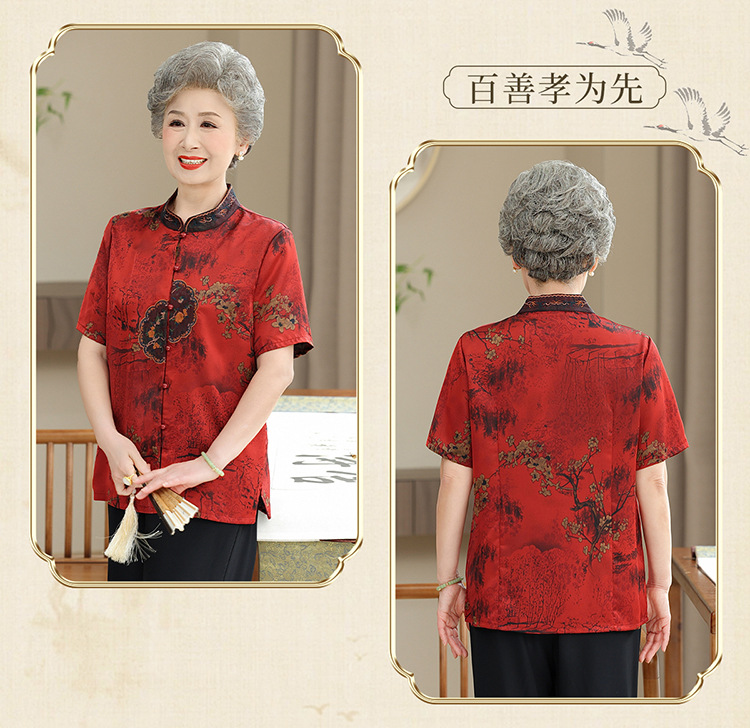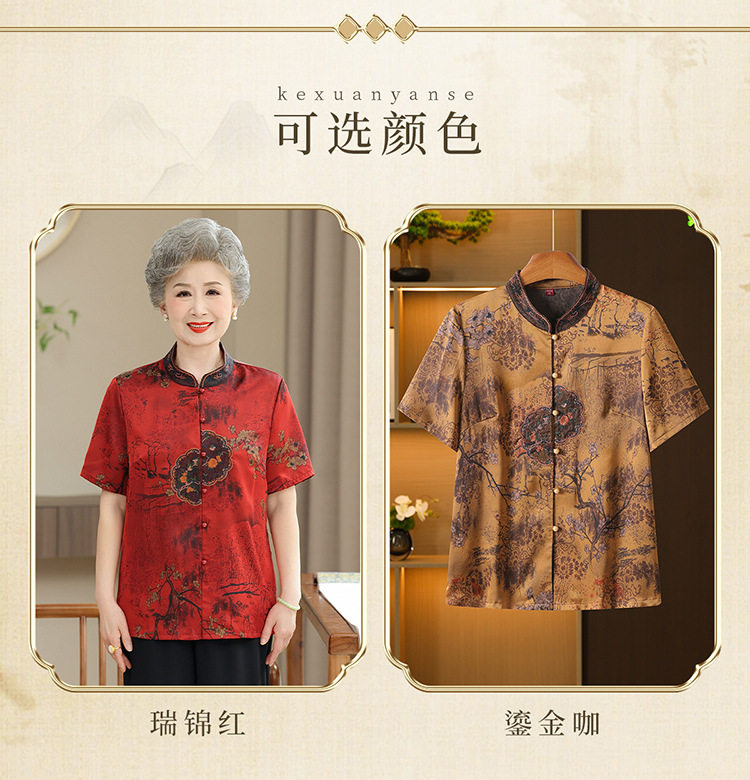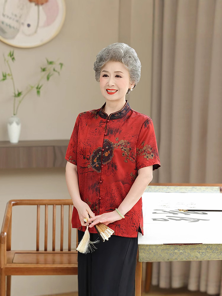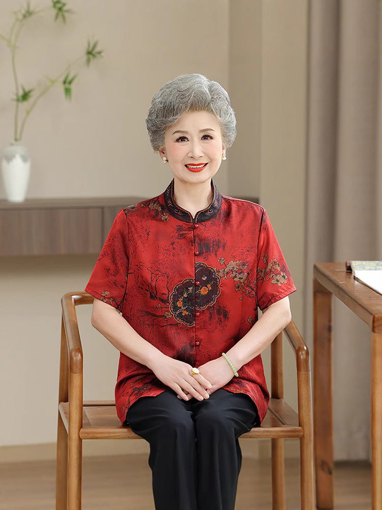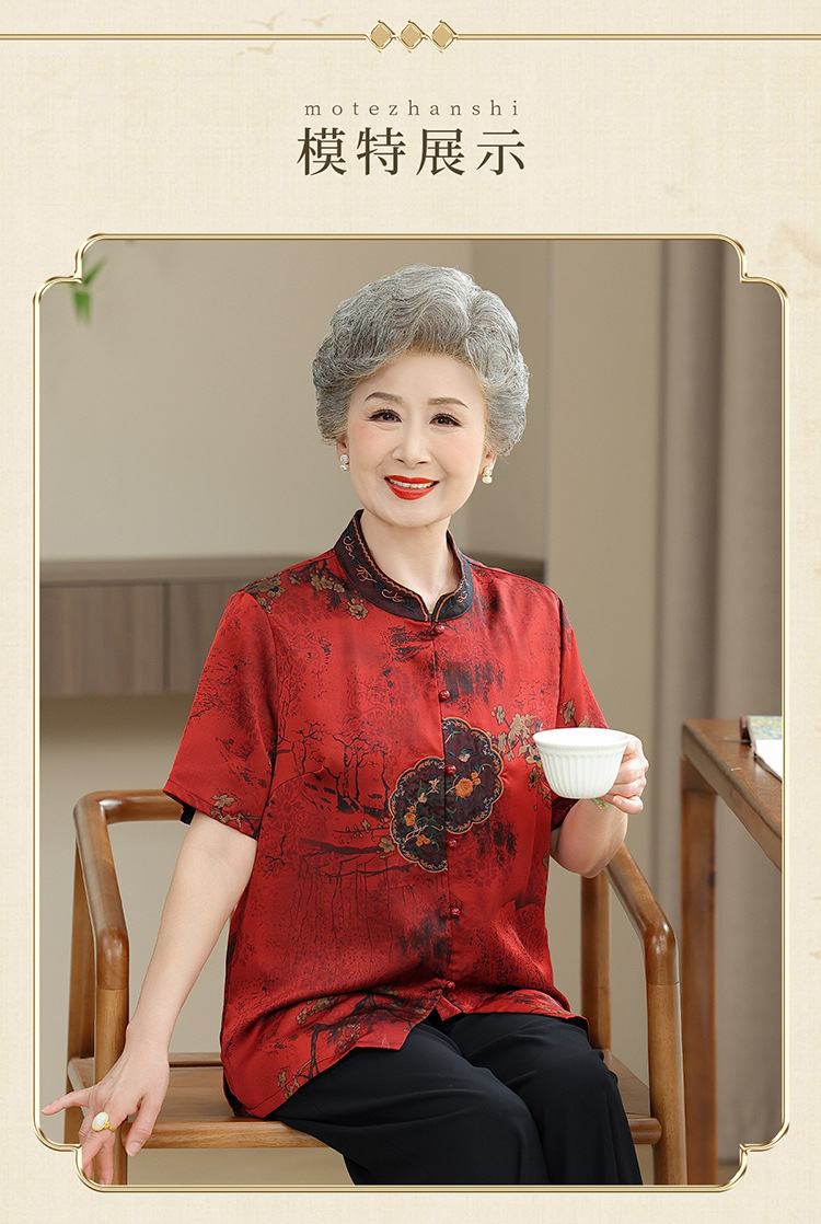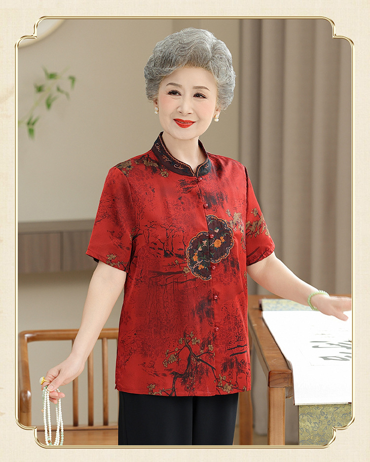 Элегантный летний наряд для пожилых женщин, рубашка с короткими рукавами для свадебного банкета, традиционный китайский костюм Тан для бабушек среднего и пожилого возраста, топ с воротником-стойкой.