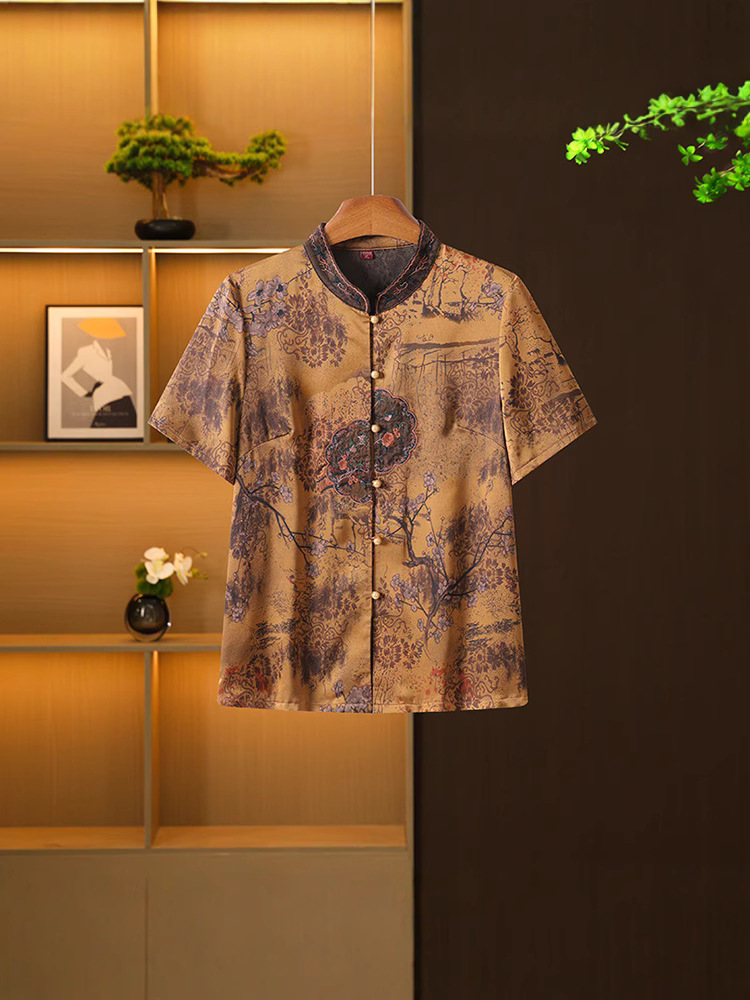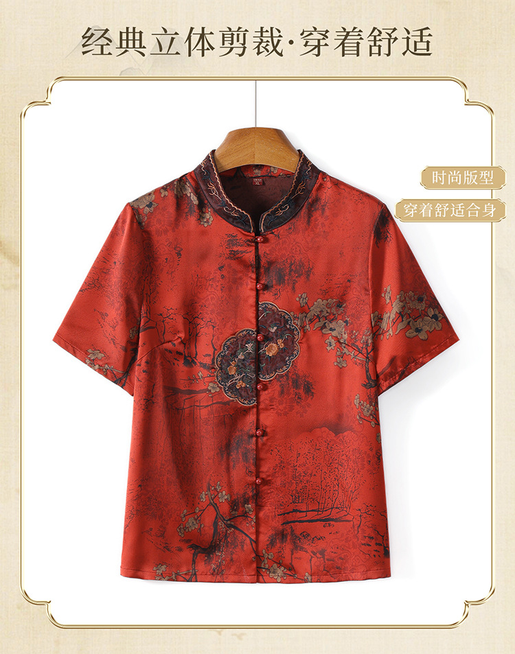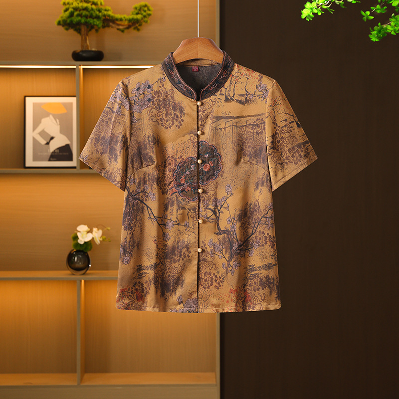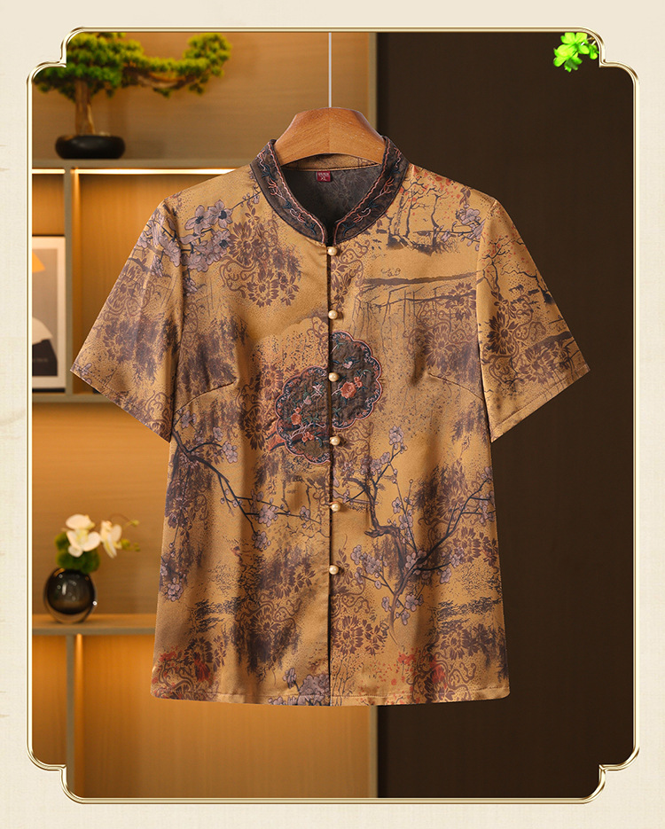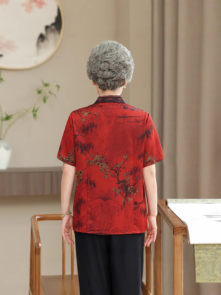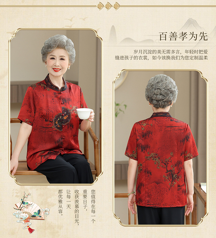 Элегантный летний наряд для пожилых женщин, рубашка с короткими рукавами для свадебного банкета, традиционный китайский костюм Тан для бабушек среднего и пожилого возраста, топ с воротником-стойкой.