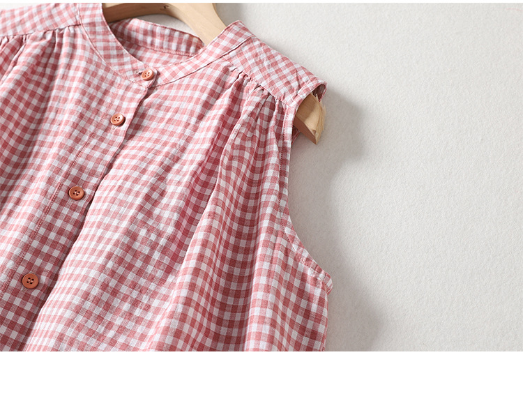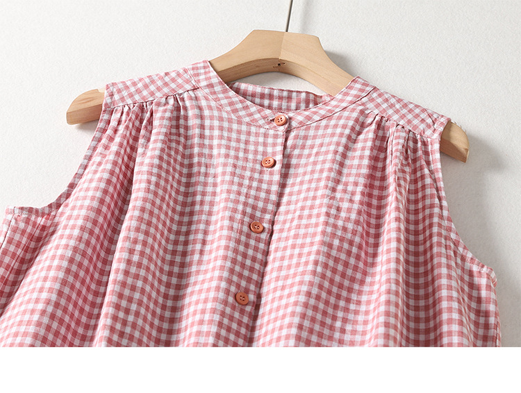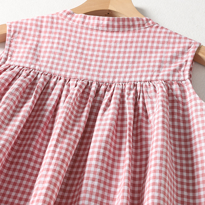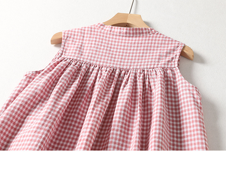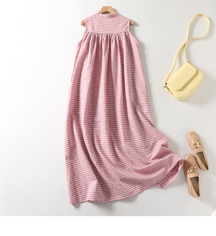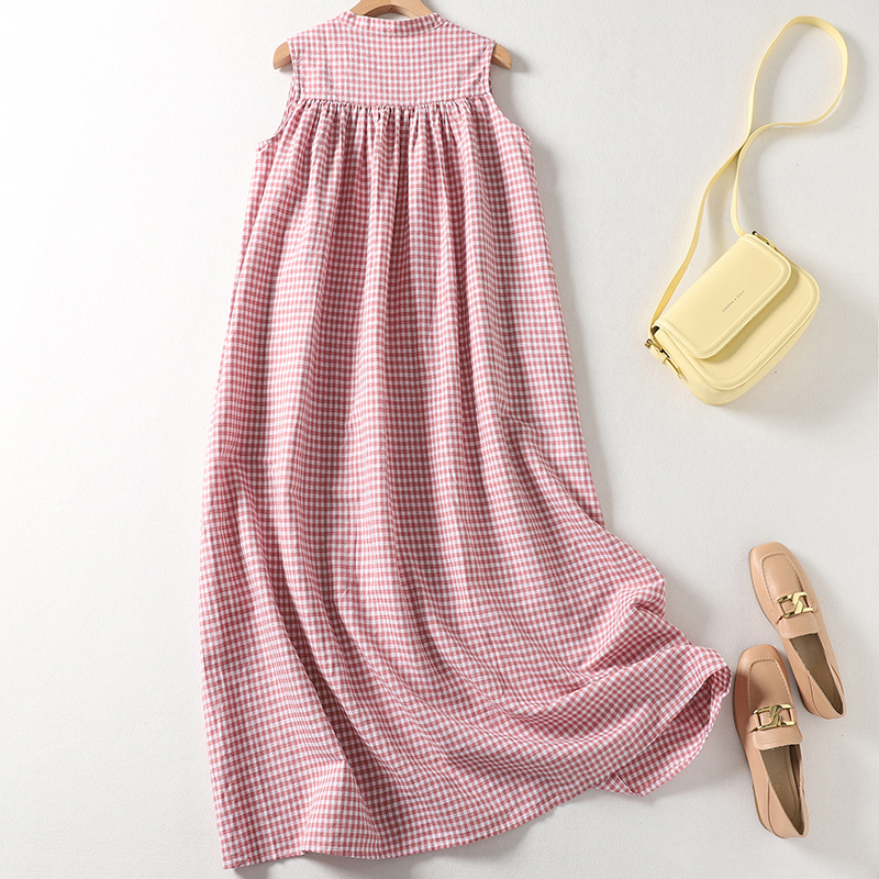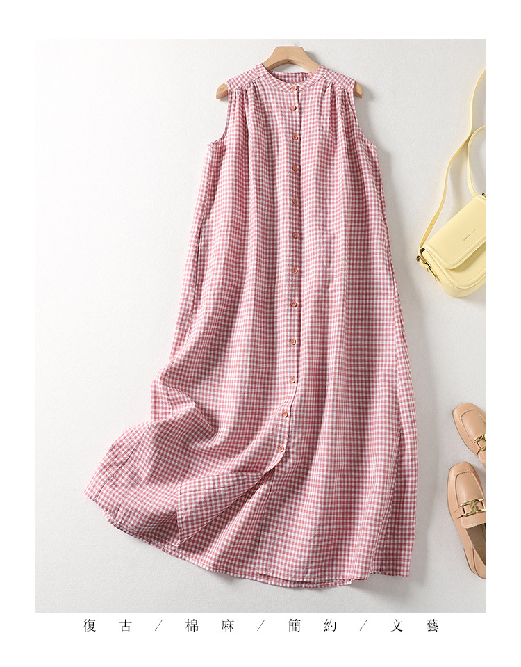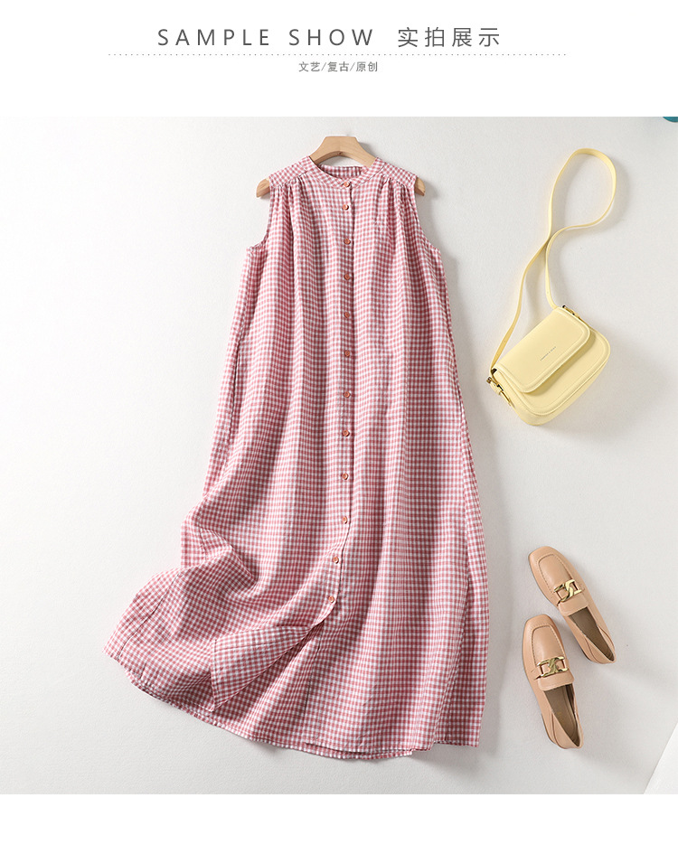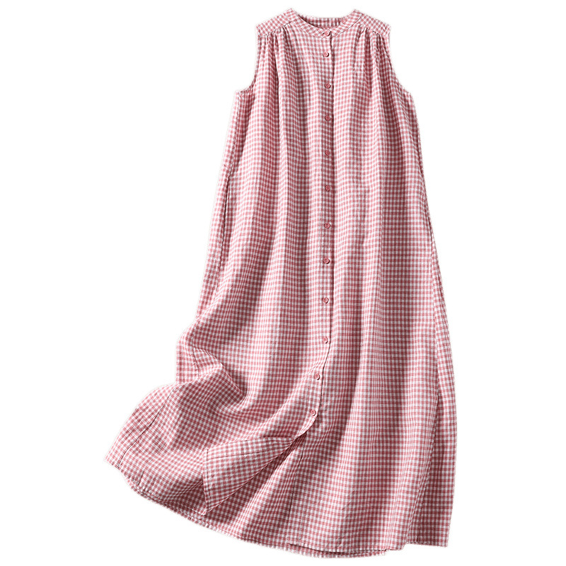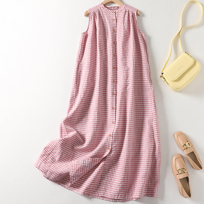 Летнее женское платье-жилет из хлопка и льна, розово-белая клетка, без рукавов, полностью расстегивающееся, А-силуэта, свободного кроя, лето 2025
