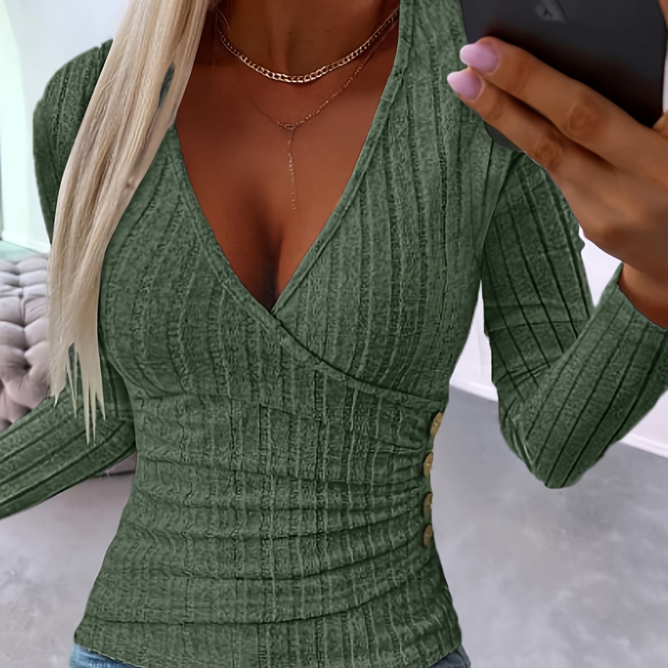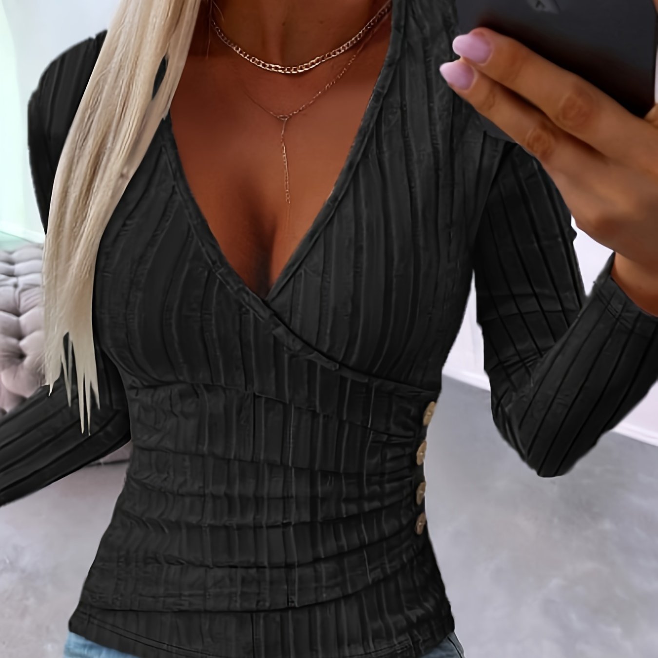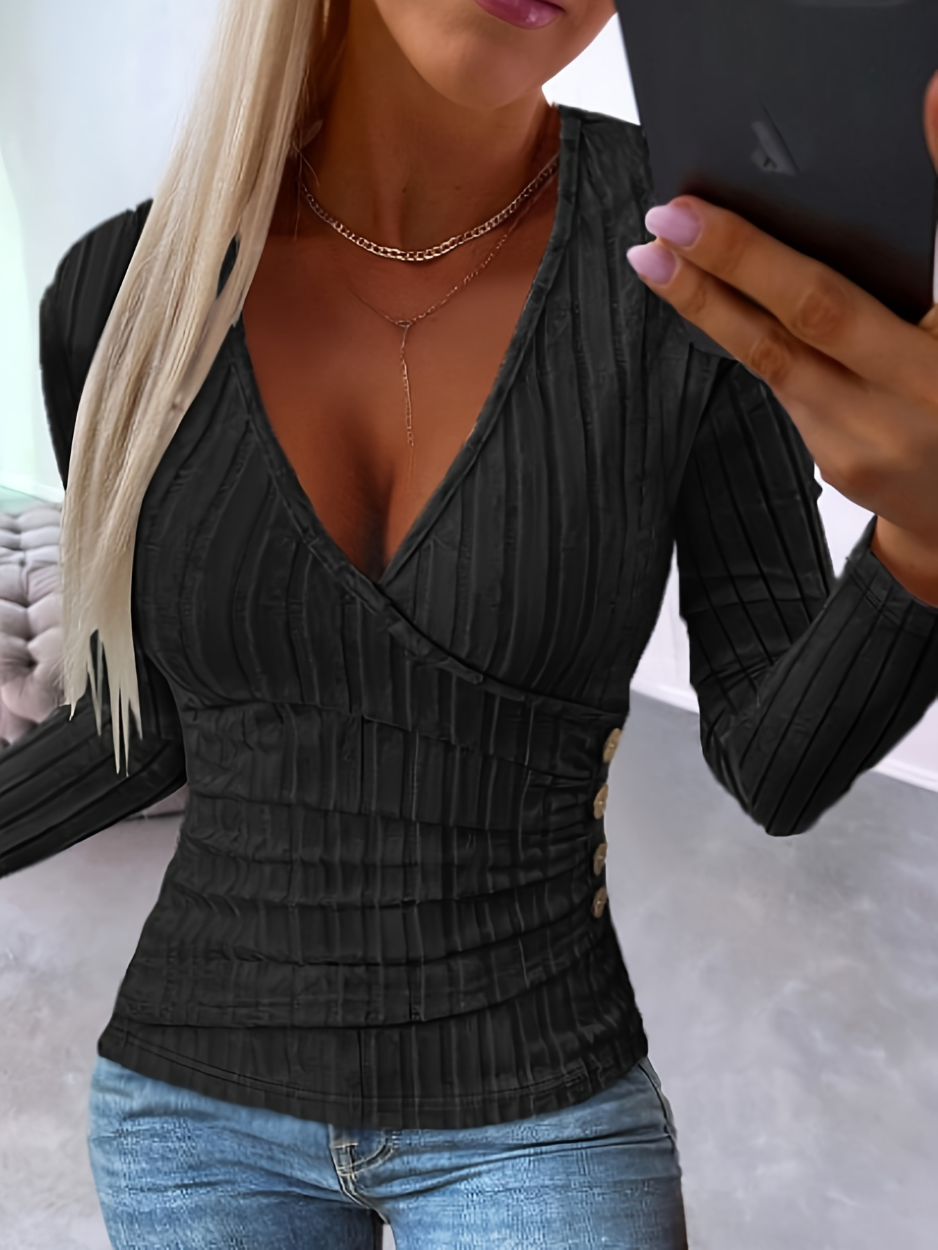Поднимите свой стиль с нашей трикотажной футболкой с V-образным вырезом и длинными рукавами на пуговицах