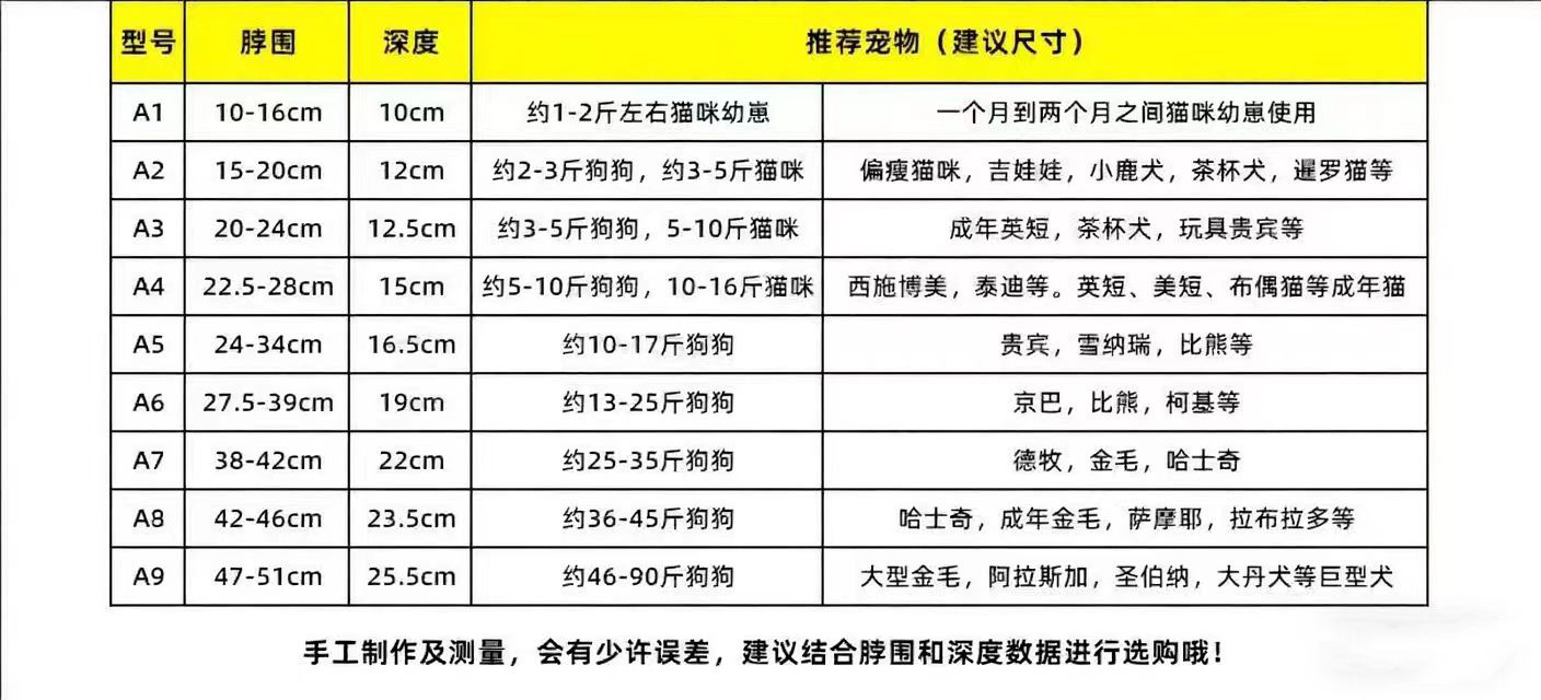 А1 (обхват шеи 10-16см, глубина 10,00см); А2 (обхват шеи 15-20см, глубина 12,00см); А3 (обхват шеи 20-24см, глубина 12,50см); А4 (обхват шеи 22,5-28см, глубина 15,00см); А5 (обхват шеи 24-34см, глубина 16,50см); А6 (обхват шеи 27,5-39см, глубина 19,00см); А7 (обхват шеи 38-42см, глубина 22,00см); А8 (обхват шеи 42-46см, глубина 23,50см); А9 (обхват шеи 47-51см, глубина 25,50см); A1-A9 [полная серия]