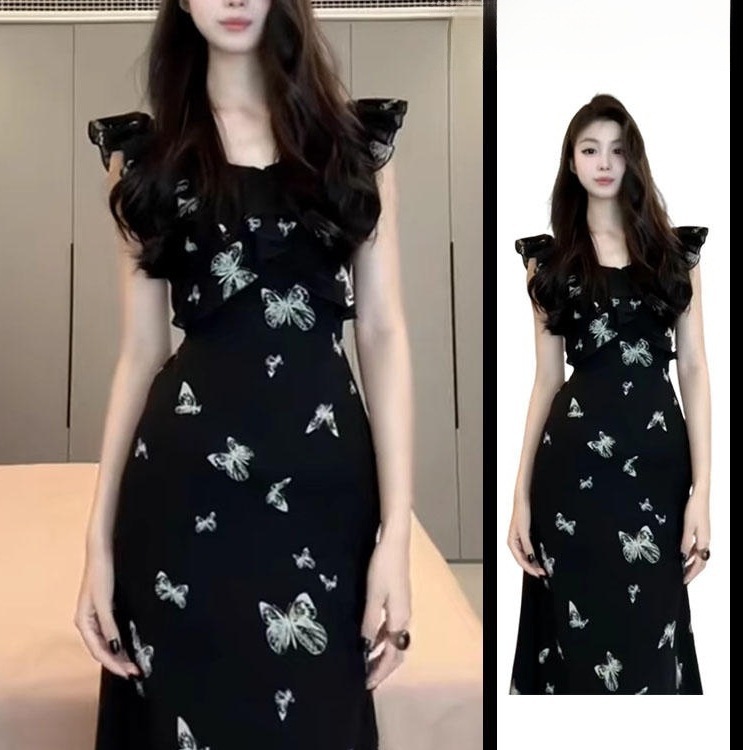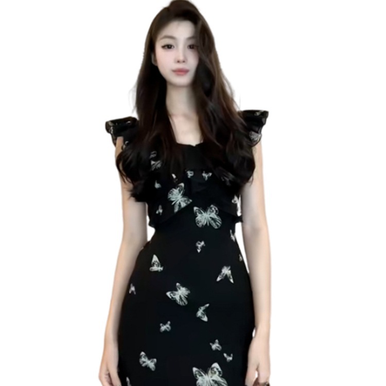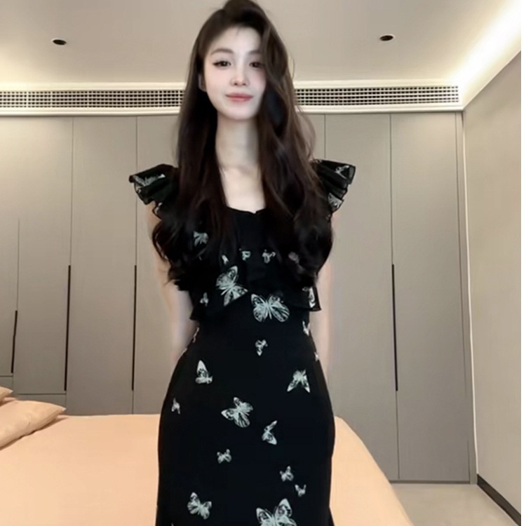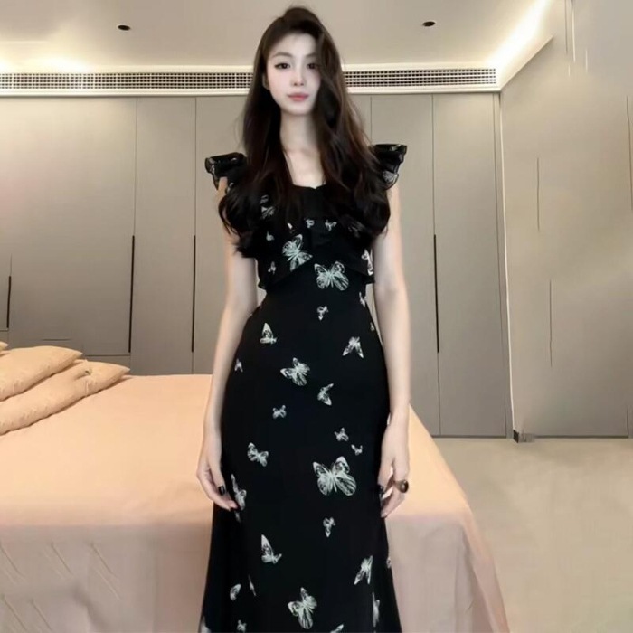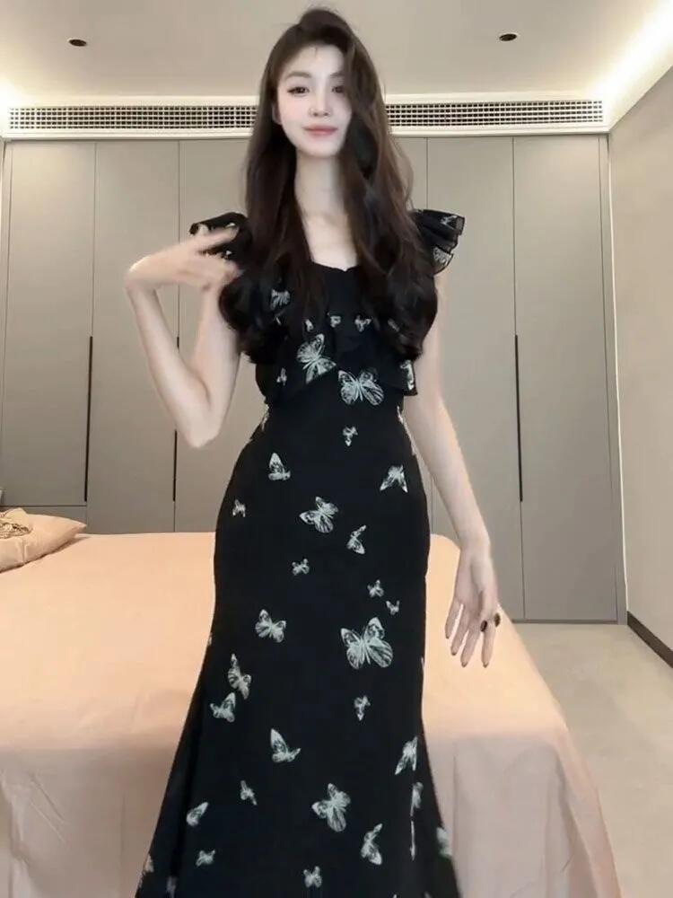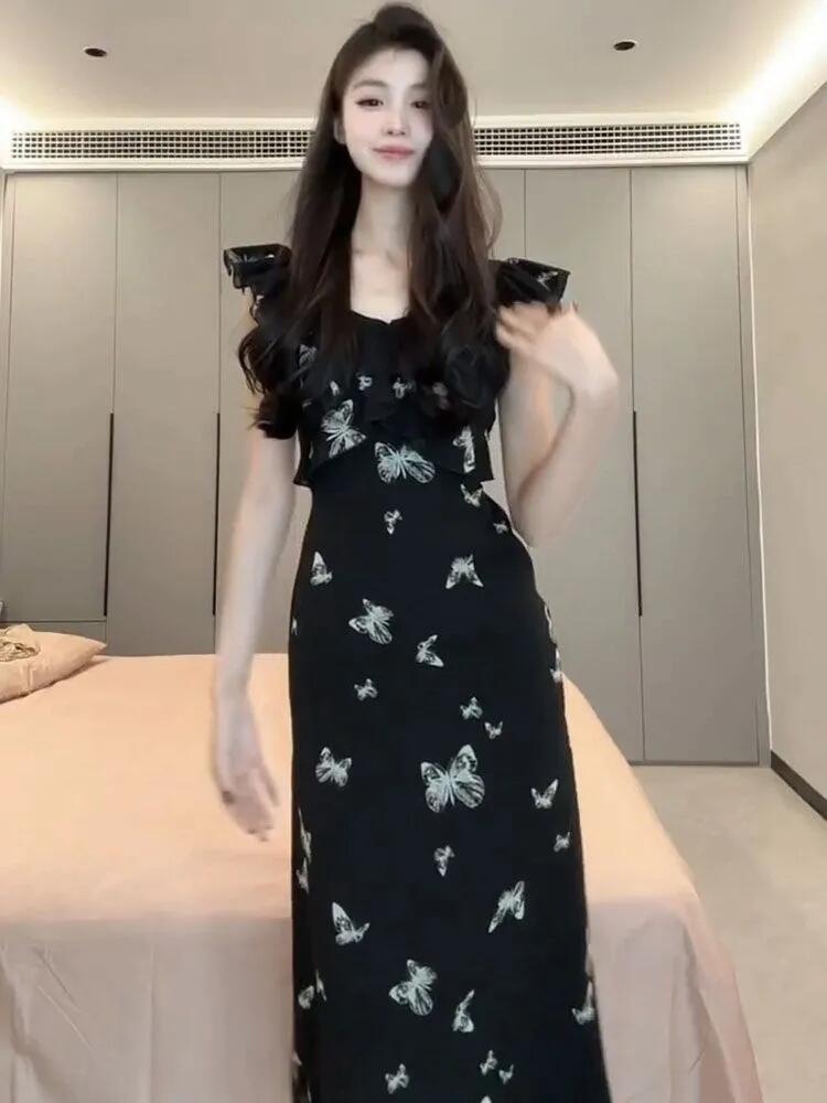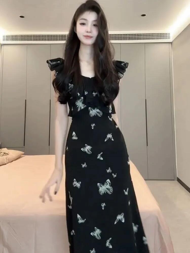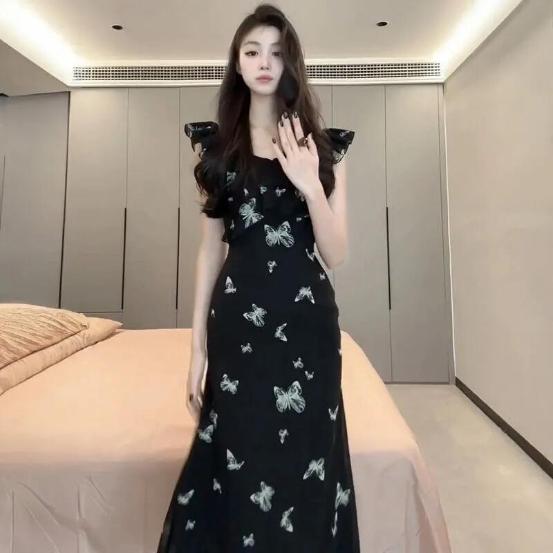 Женское элегантное черное длинное платье с цветочным принтом и небольшими рукавами-крылышками в французском стиле, новинка лета 2025 года