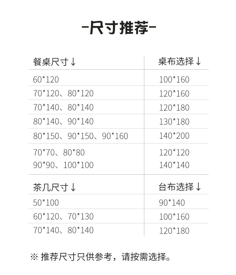 65*65 см (подходит для прикроватной тумбочки); 90*90 см (подходит для небольшого квадратного стола); 90*140 см (подходит для небольшого журнального столика); 120*120 см (подходит для квадратного стола); 140*140 см (подходит для квадратного стола); 100*160 см (подходит для журнального столика/небольшого обеденного стола); 120*160 см (подходит для обеденного стола длиной 120 см); 120*180 см (подходит для обеденного стола длиной 130-140 см); 130*180 см (подходит для обеденного стола длиной 130-140 см); 140*180 см (подходит для обеденного стола длиной 130-140 см); 140*200 см (подходит для обеденного стола длиной 150 см); 140*220 см (подходит для расширенного рабочего стола); 140*240 см (подходит для расширенного рабочего стола); 140*260 см (подходит для расширенного рабочего стола)