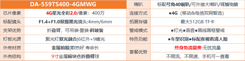 Ding'an DA-559TS400-4GMWG 4 миллиона 4G PTZ-машина с оповещением по интеркому со звездным светом (бесплатная на весь срок службы)