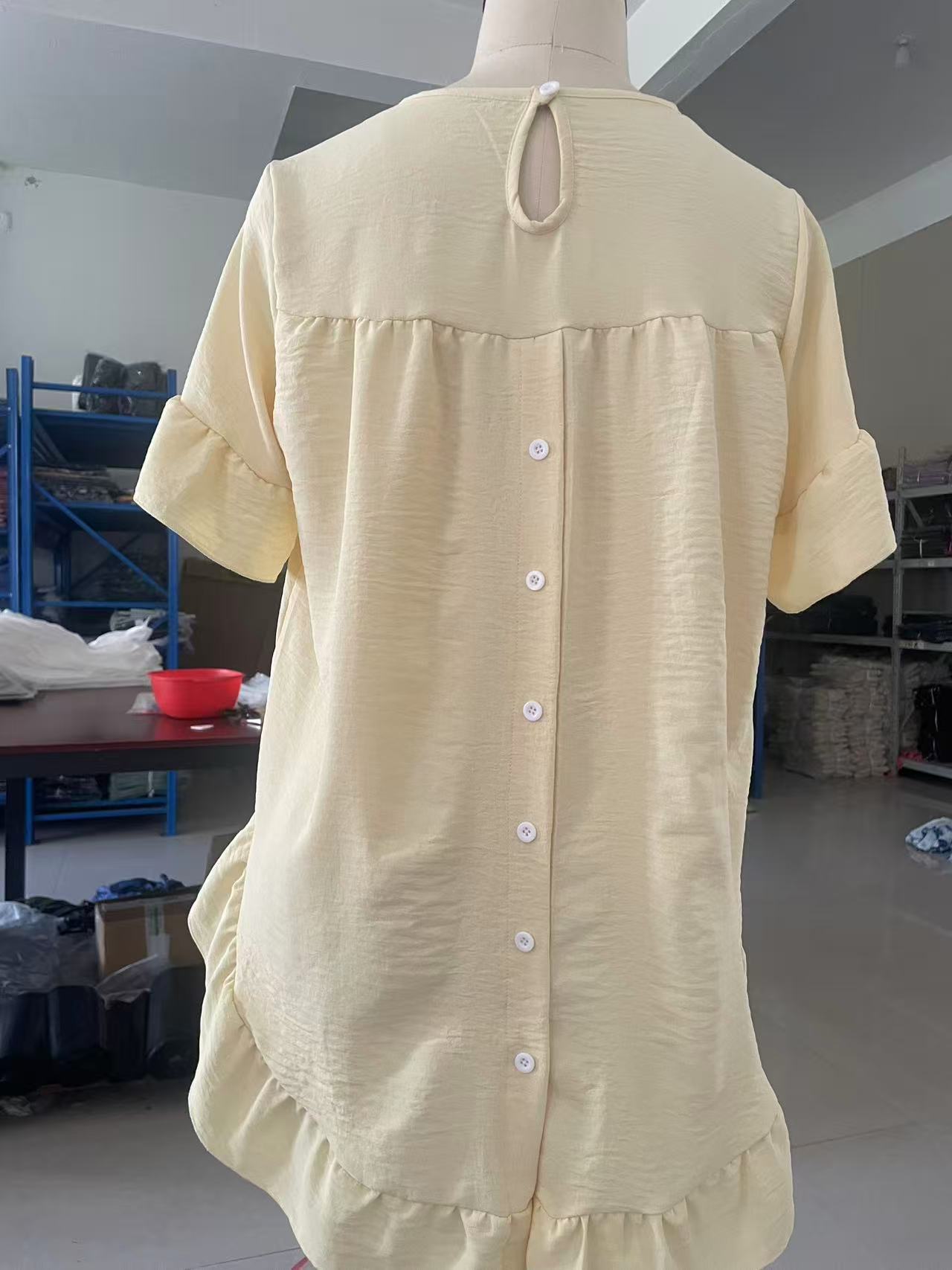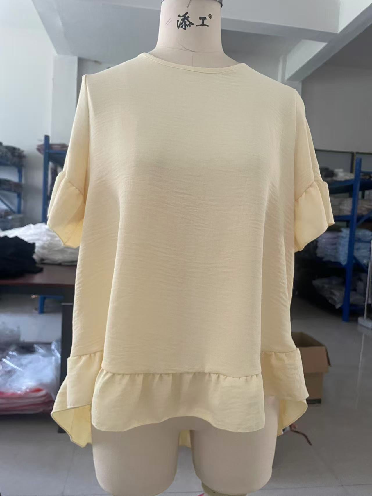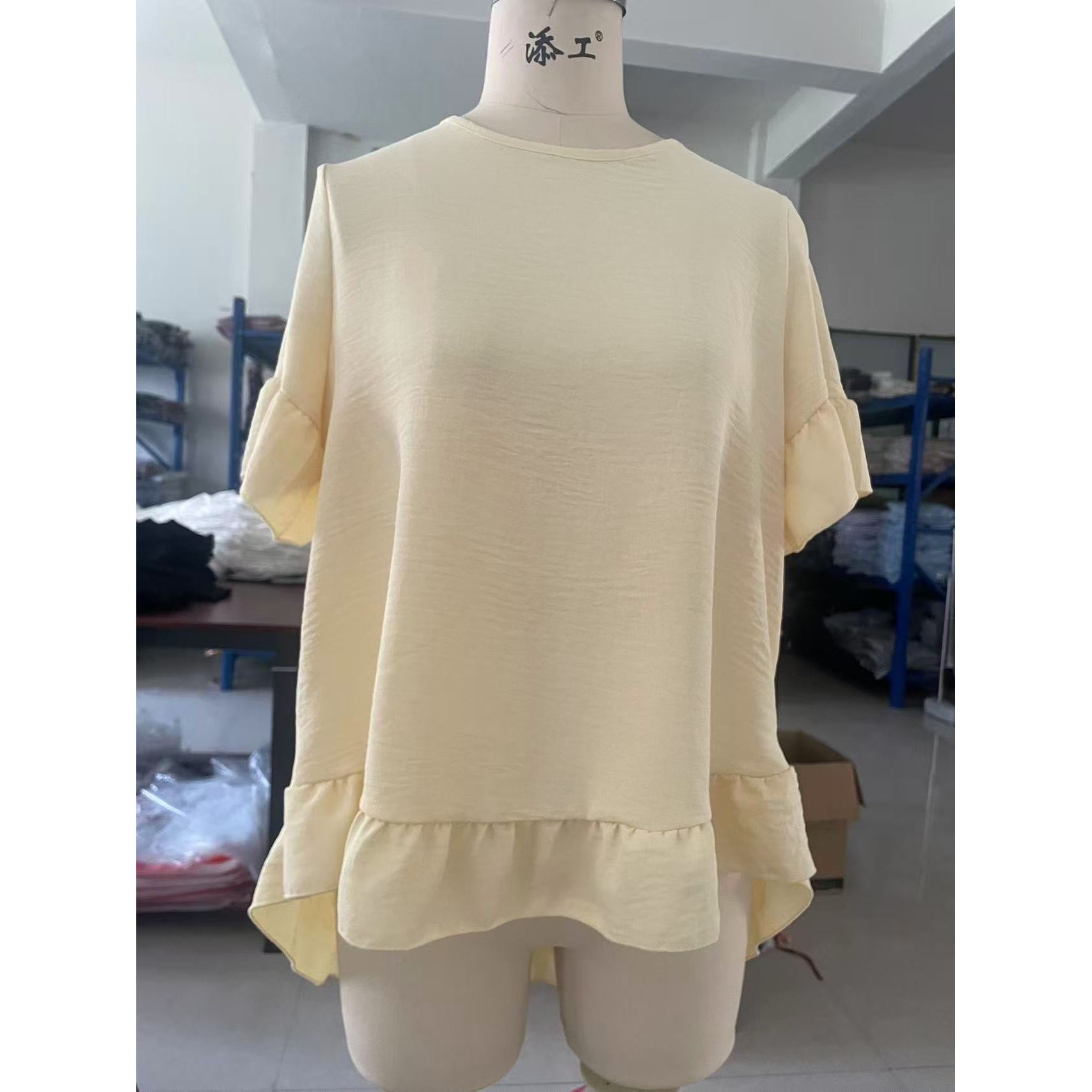 Летняя женская рубашка из хлопка и льна 2024 года, свободного кроя, с рюшами на манжетах, круглым вырезом и короткими рукавами, на пуговицах, однотонная.