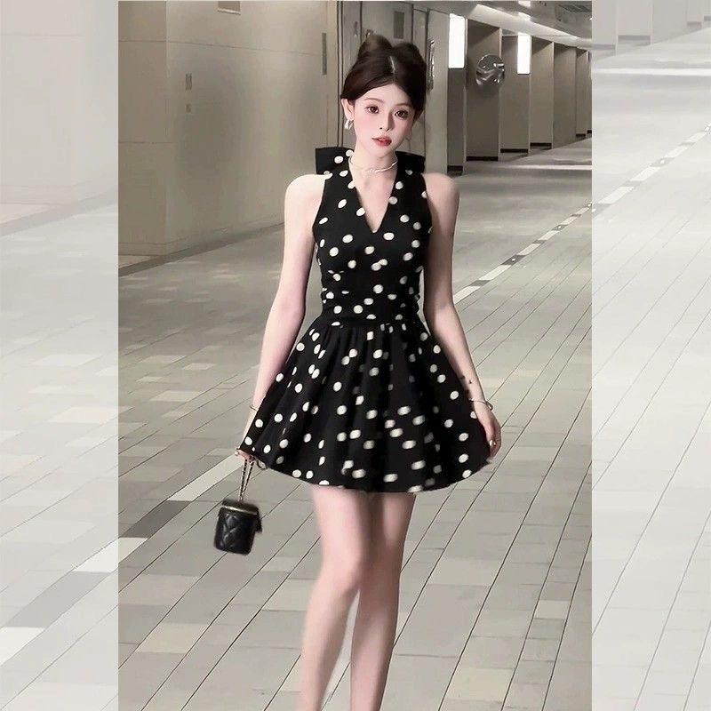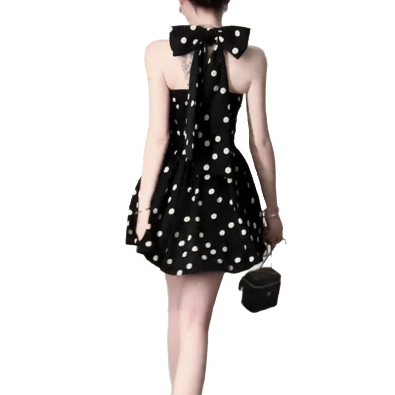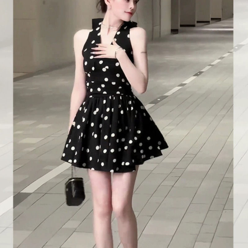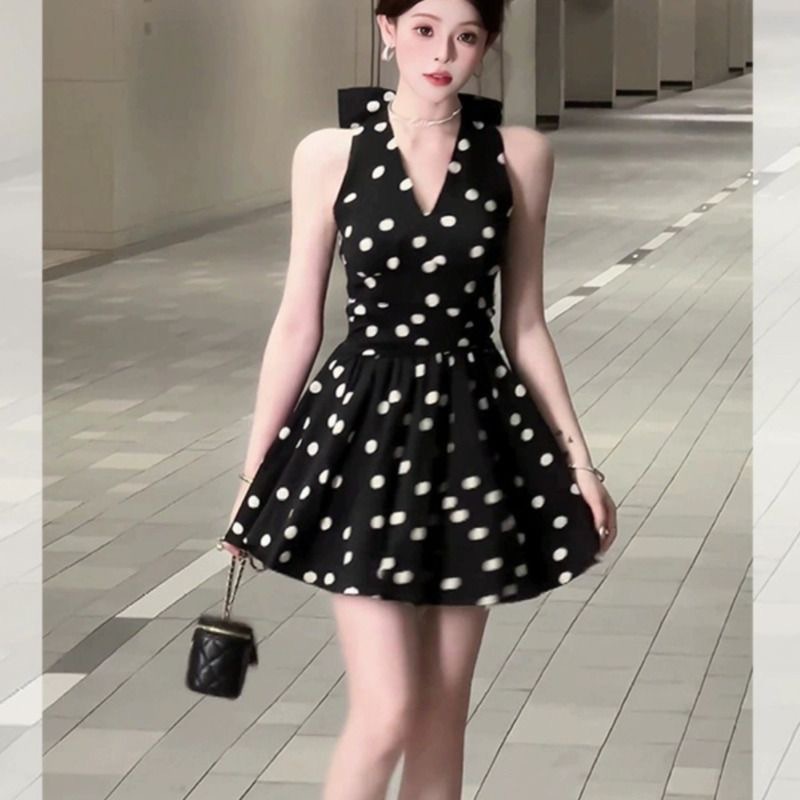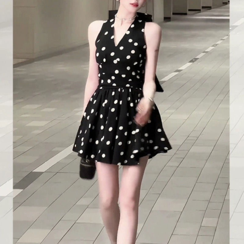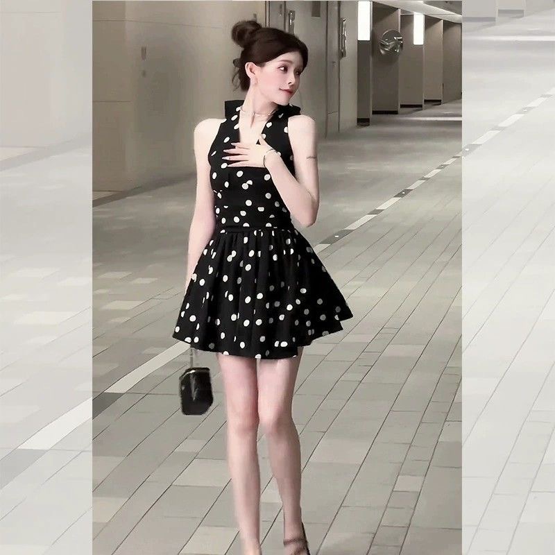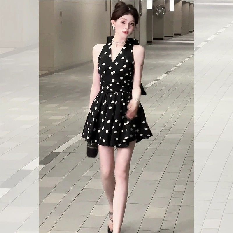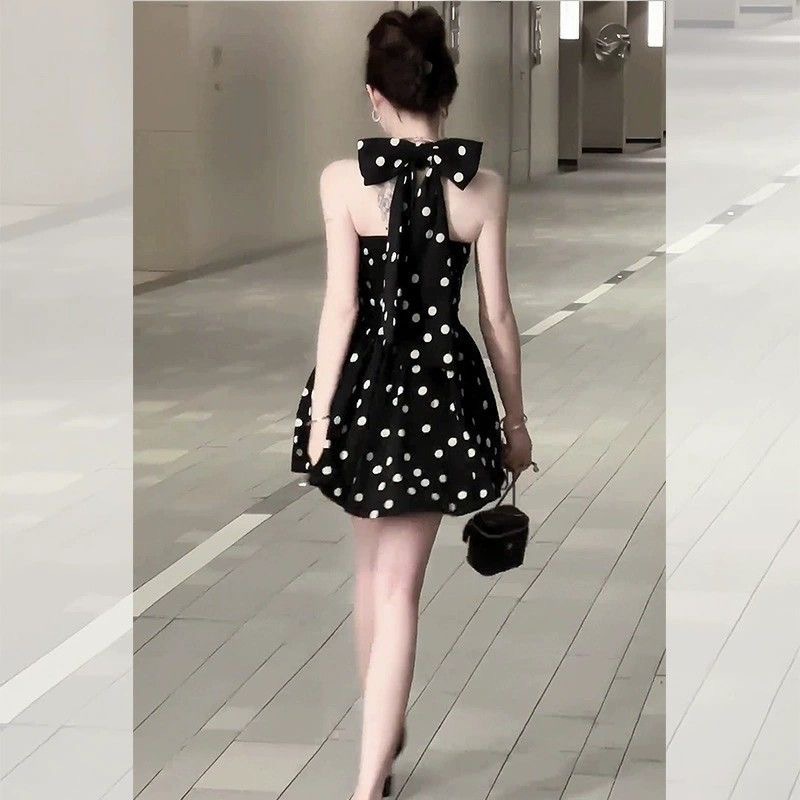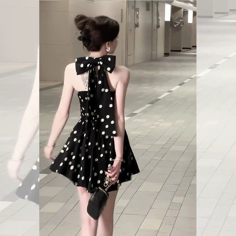Женское платье в горошек с халтером, французский стиль, лето 2025, новый стиль, стройнящее, сексуальное, А-силуэта