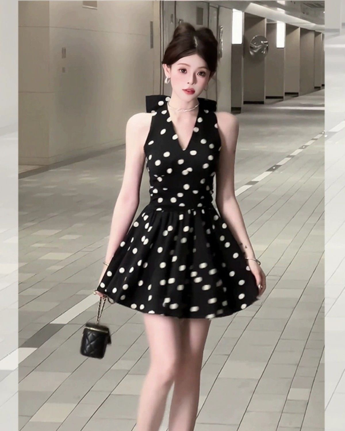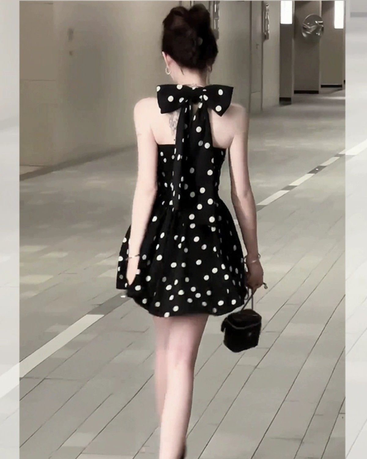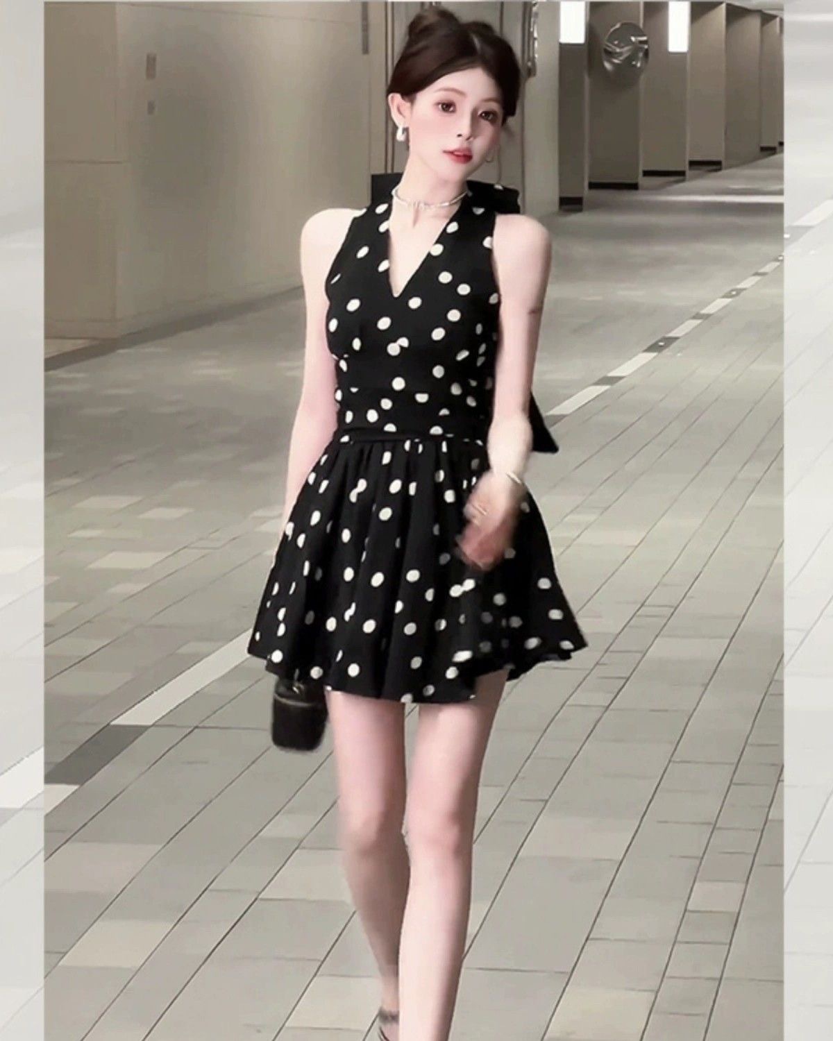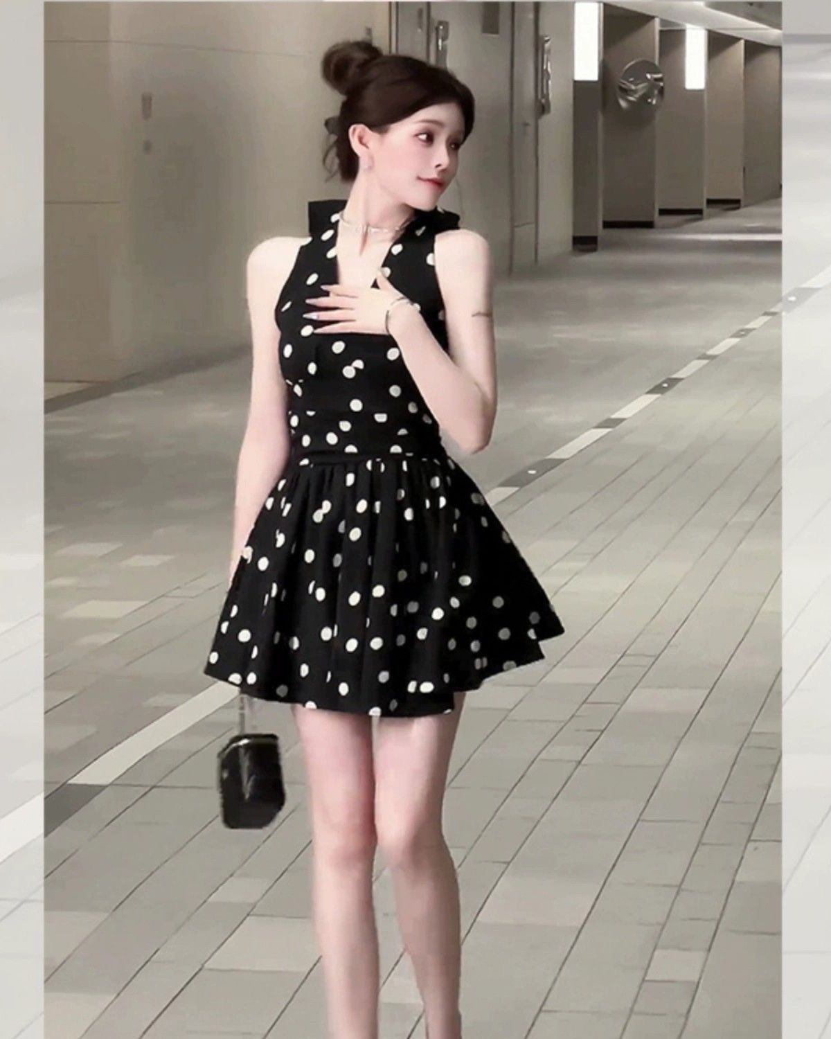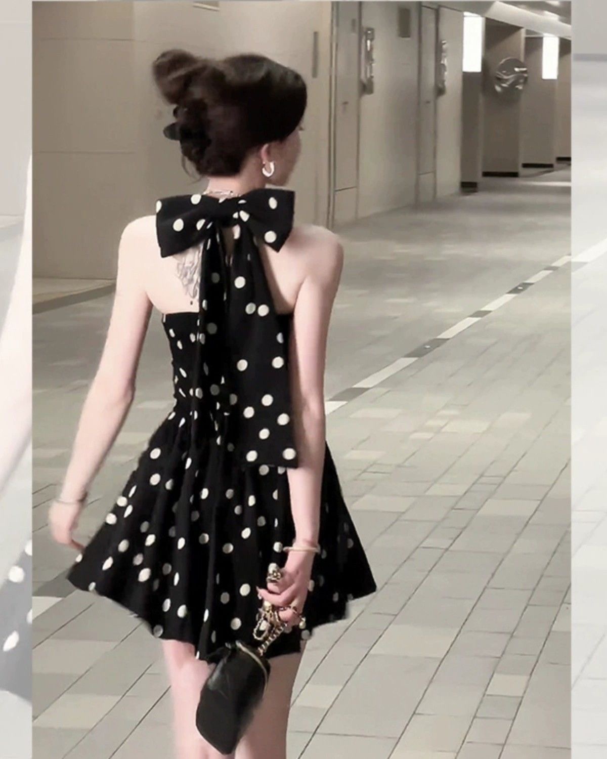 Женское платье в горошек с халтером, французский стиль, лето 2025, новый стиль, стройнящее, сексуальное, А-силуэта