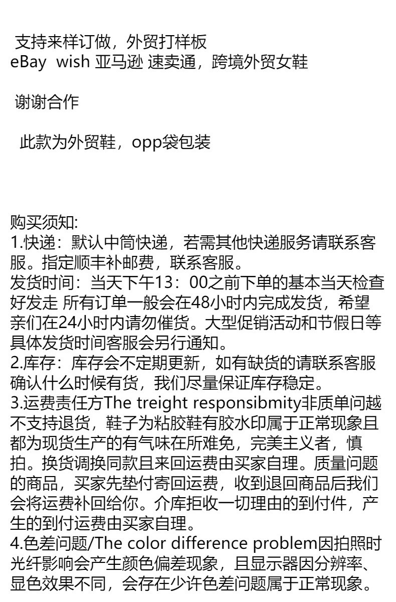 我们可以定做各种欧美风民族风的欧美地区外贸鞋,休闲风运动风的各种东南亚市场的鞋 我们是直接生产厂家,公司有60余人,阿里巴巴平台上至少有100家阿里巴巴经销商从我们这里拿货,我们诚心想与贵公司合作,大家一起在网销路上大杀四方,一骑绝尘! 【联系方式】私聊掌柜,有自动回复上可以显示电话,call我绝对有惊喜 【服务理念】辅助各平台中小卖家创业,推进线下卖家盈利~ 【一件代发说明】 1、本公司支持一件代发诚招加盟和代理,发货时间需要联系客服确定,我们不保证发货的时效性哈,因为款式比较多,缺货跟断码是正常的行为,麻烦买家拍之前联系下客服确定下哈 2、付款方式支持:仅阿里巴巴线上支付平台 3、一件代发时拍下地址信息请各位买家自行核对清楚,如买家地址搞错本公司均不负责; 【关于图片】擅自使用图片,没有征得我同意的,一律投诉到底! 【关于色差】因个人显示器明暗对比显示等差异图片与实物可能会有细微色差。 【关于气味】刚出厂的鞋子会有些胶水气味,无关质量,放置通气处胶水气味就会散去。 【关于售后】售出鞋子如有任何问题均需时间联系我们客服说明情况,我们会负责到底。 【关于快递】默认汇通快递和邮政小包,如需顺丰请联系客服,补差价。 物流:联系在线客服默认物流到付卖家需自提。 【关于质量】断底、脱胶、破损、严重污点、错发本公司包换 小线头、小污点、微色差、胶水气味细微缺陷均非质量问题。