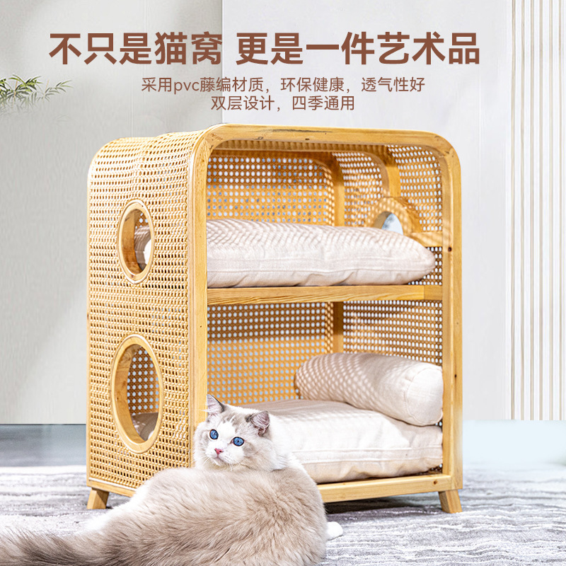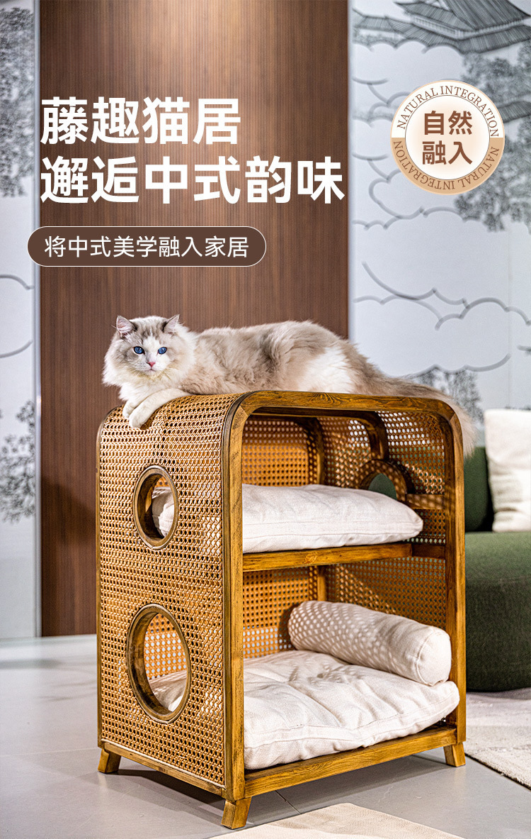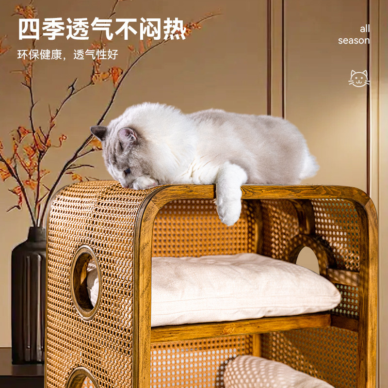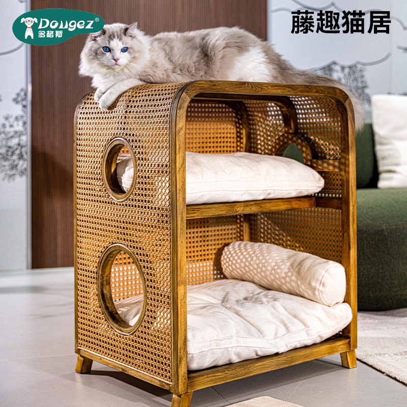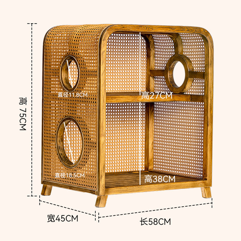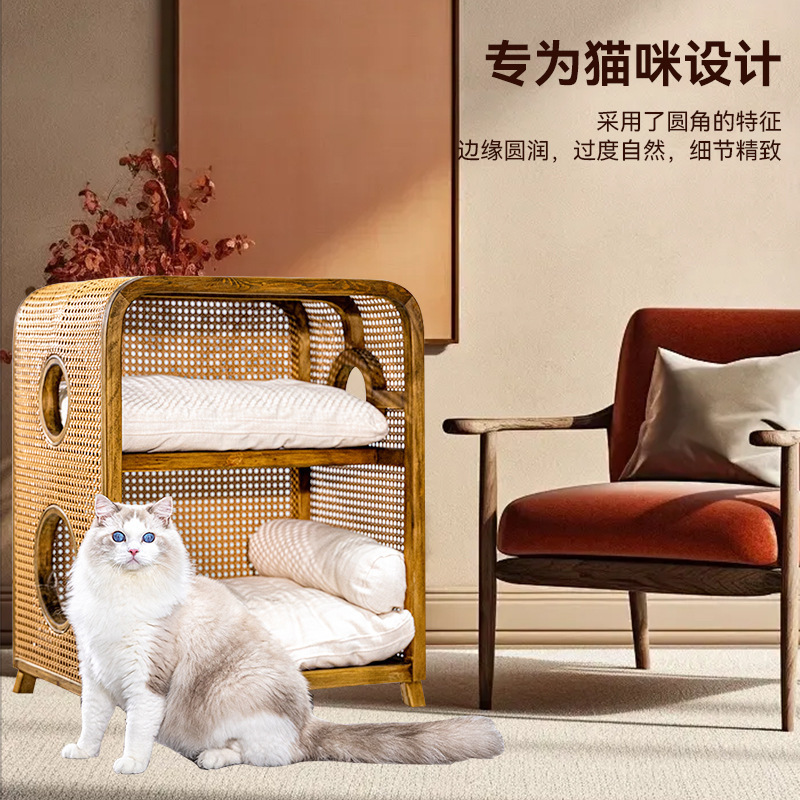 Кошачье гнездо из массива ротанга, новая мебель в китайском стиле ваби-саби, ретро-мебель, кошачье гнездо, прикроватная тумбочка, полузакрытая вилла, кошачий домик «два в одном»