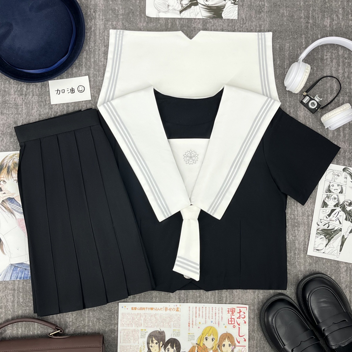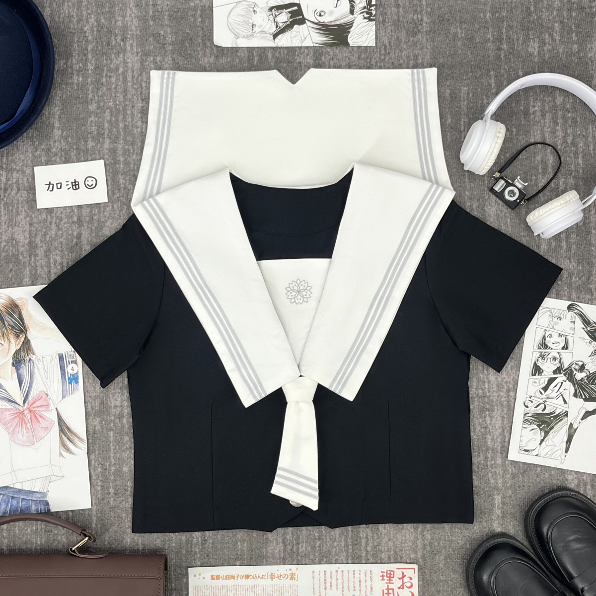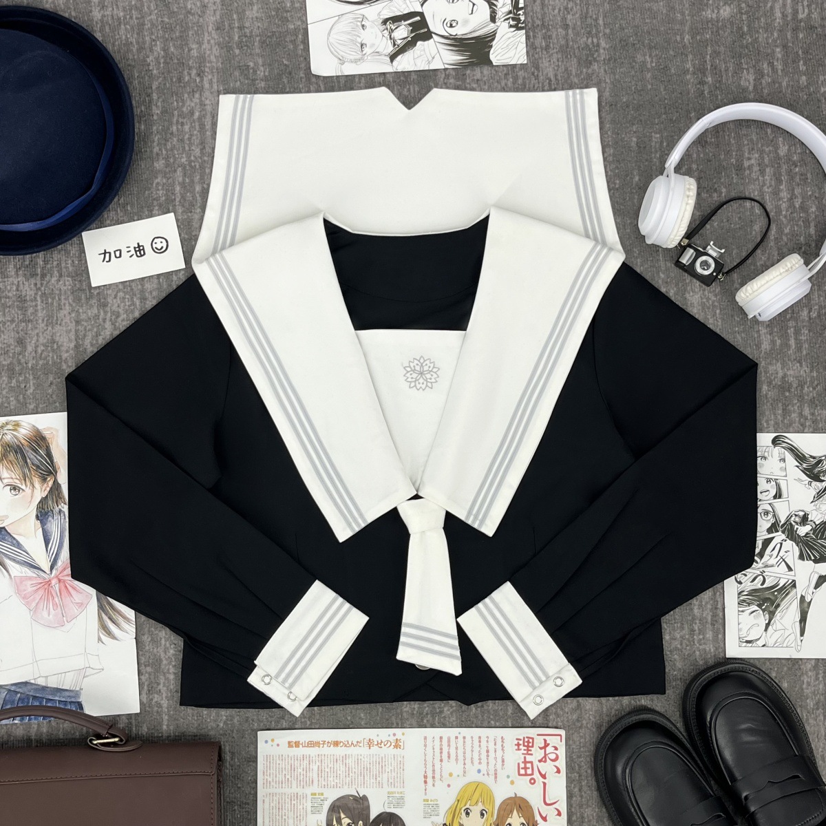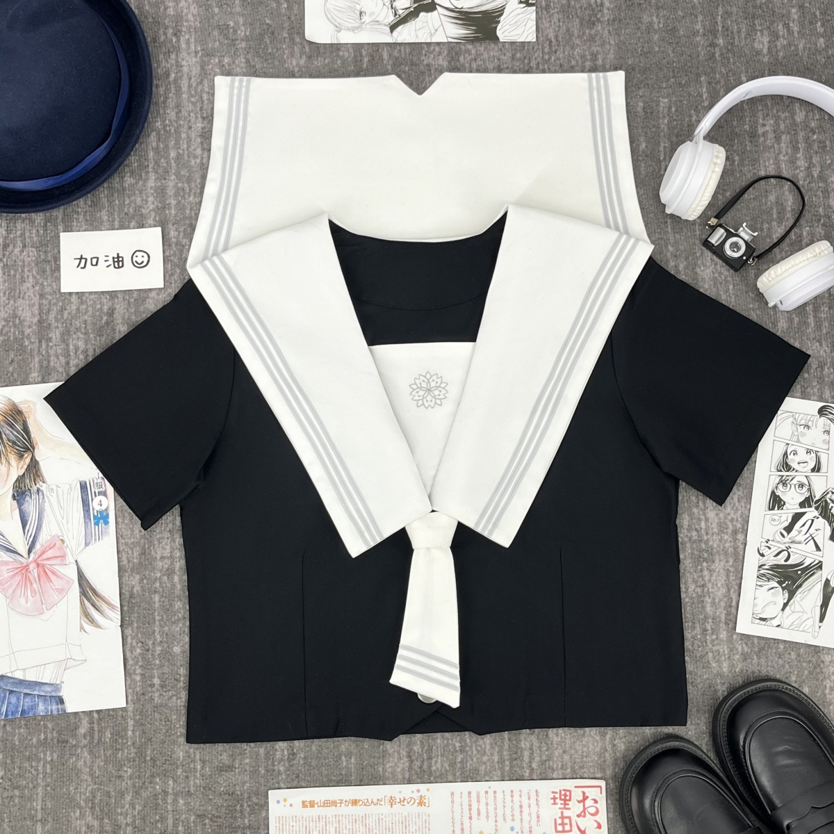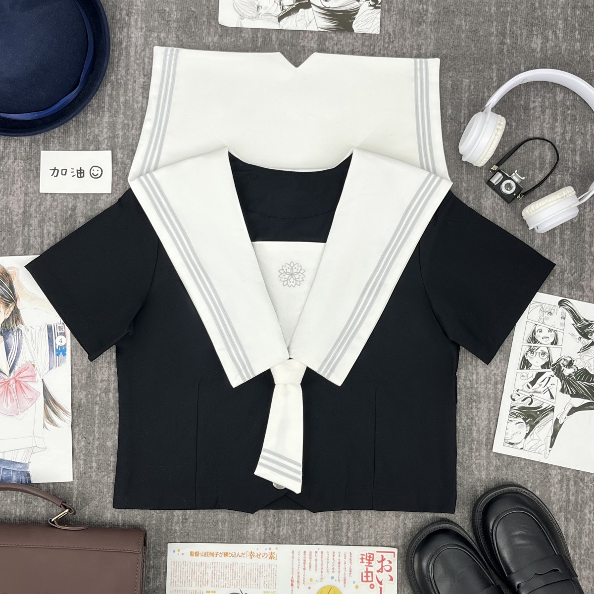 Сакура Шоу с белым воротником и короткими рукавами + соответствующий галстук + черная юбка А-силуэта; Сакура Шоу с белым воротником и длинными рукавами + соответствующий галстук + черная юбка А-силуэта; Сакура Шоу, белый воротник, короткие рукава + соответствующий галстук; Сакура Шоу с белым воротником и длинными рукавами + соответствующий галстук; Черная юбка А-силуэта + носки