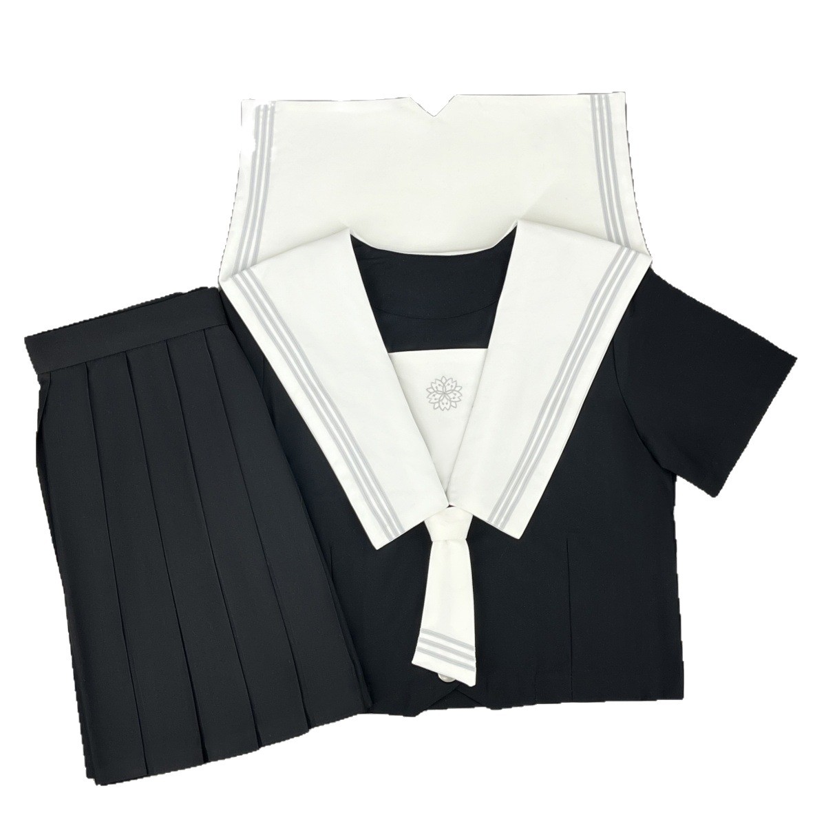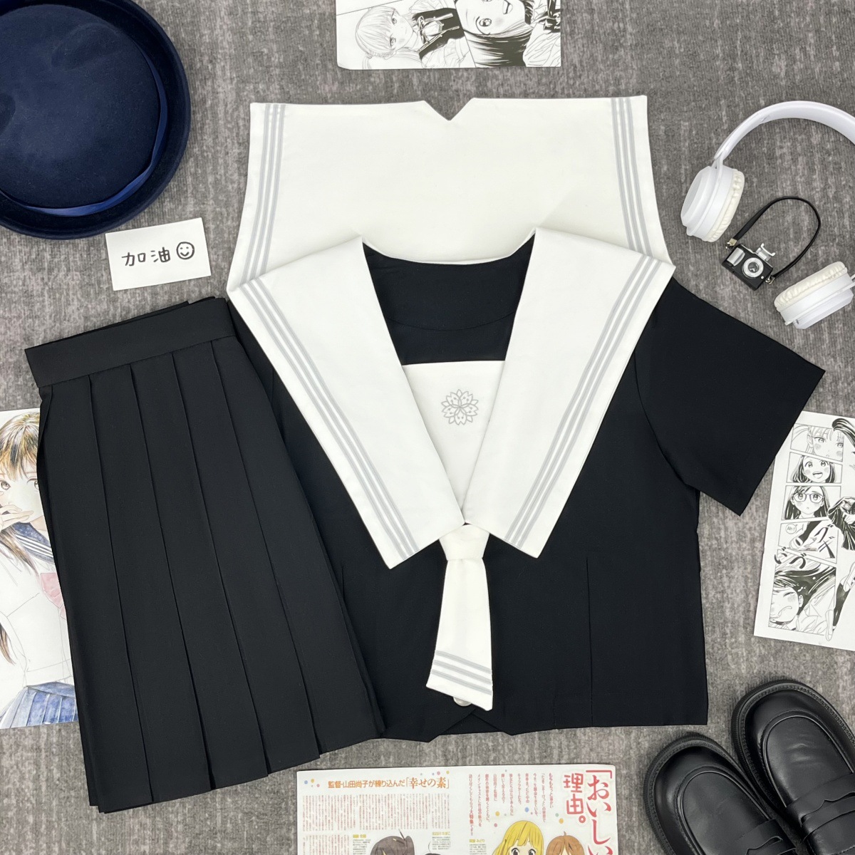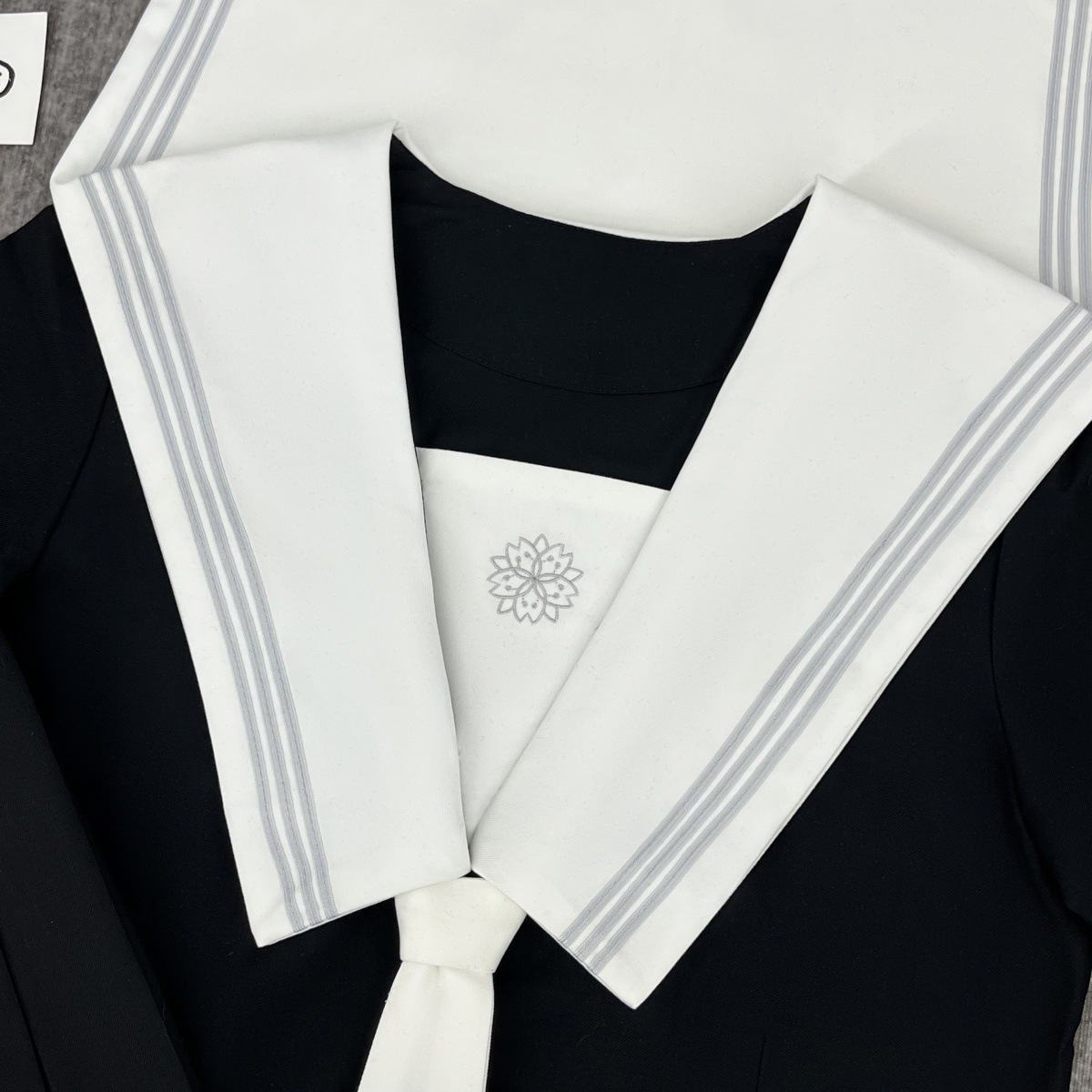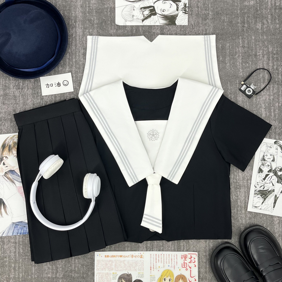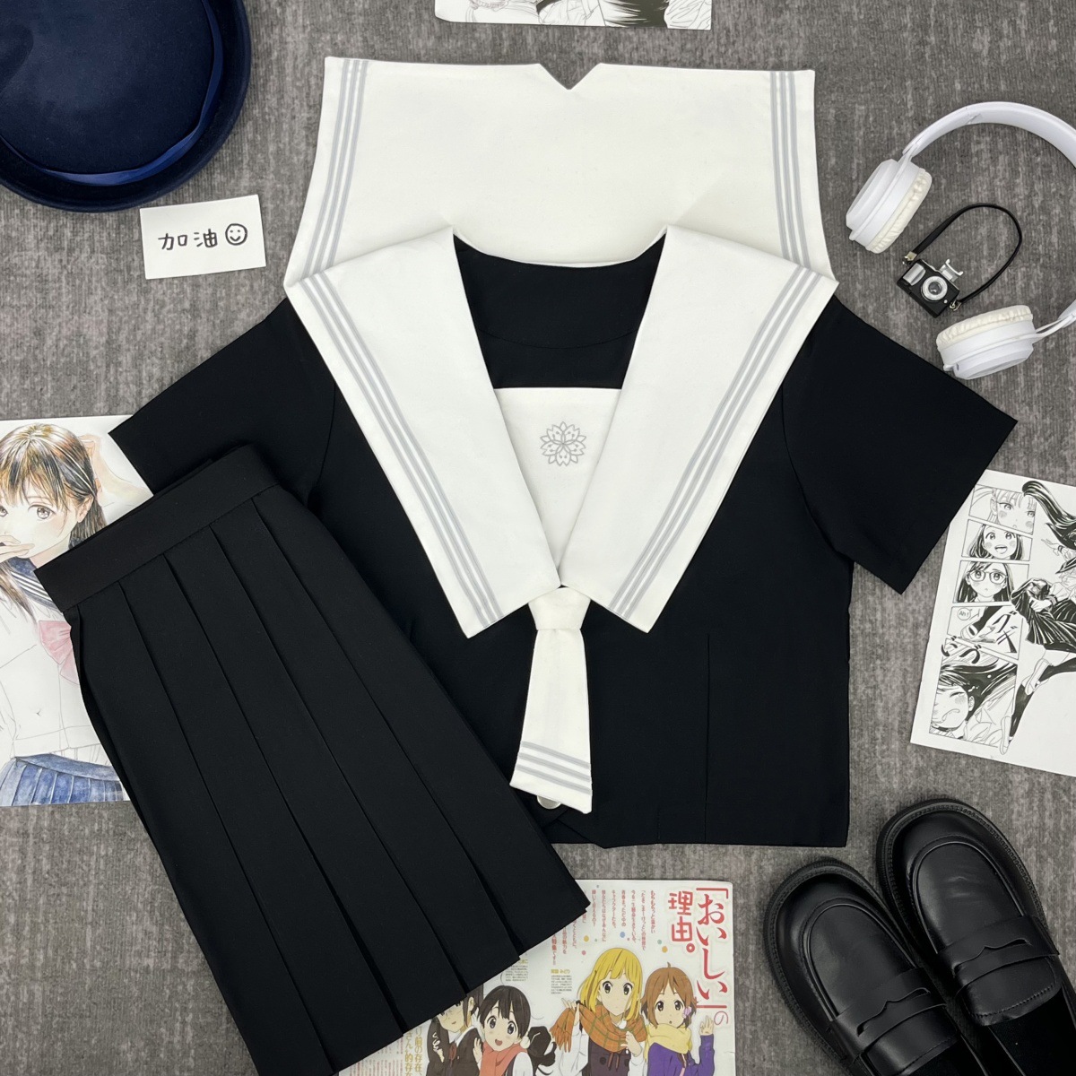 Сакура Шоу с белым воротником и короткими рукавами + соответствующий галстук + черная юбка А-силуэта; Сакура Шоу с белым воротником и длинными рукавами + соответствующий галстук + черная юбка А-силуэта; Сакура Шоу, белый воротник, короткие рукава + соответствующий галстук; Сакура Шоу с белым воротником и длинными рукавами + соответствующий галстук; Черная юбка А-силуэта + носки