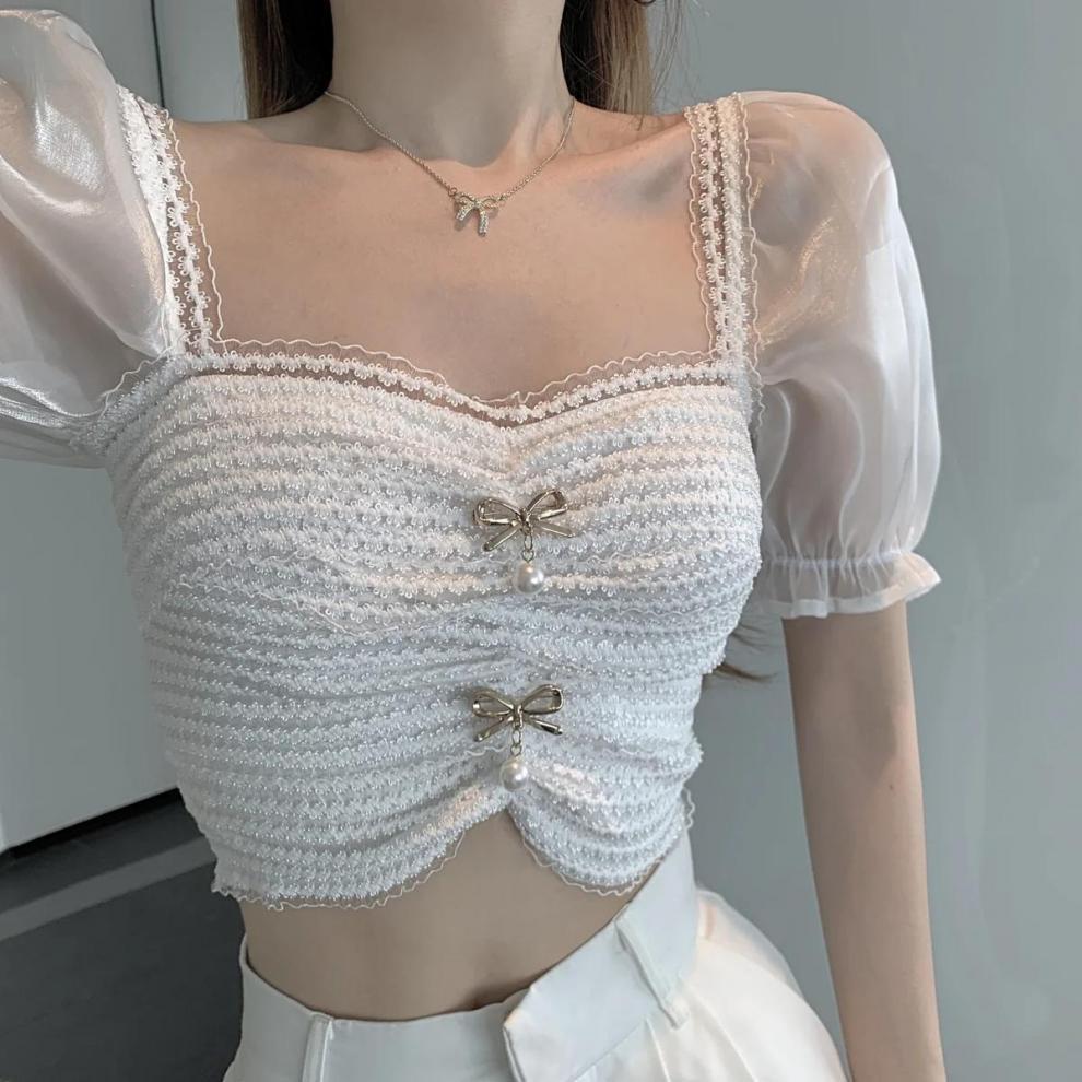 Белый кружевной топ для женщин, модный французский стиль с уникальным дизайном.