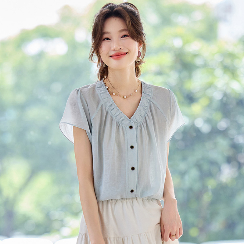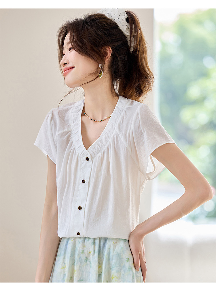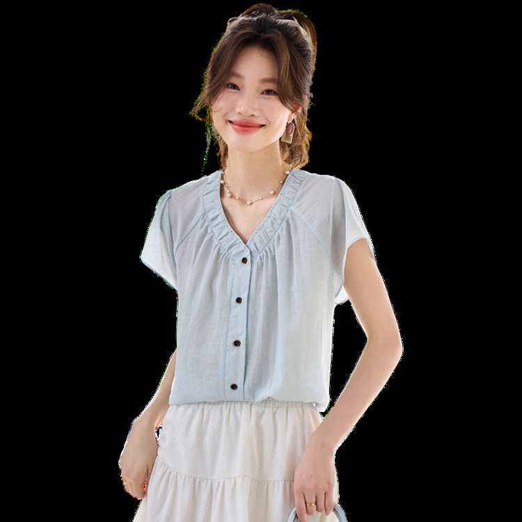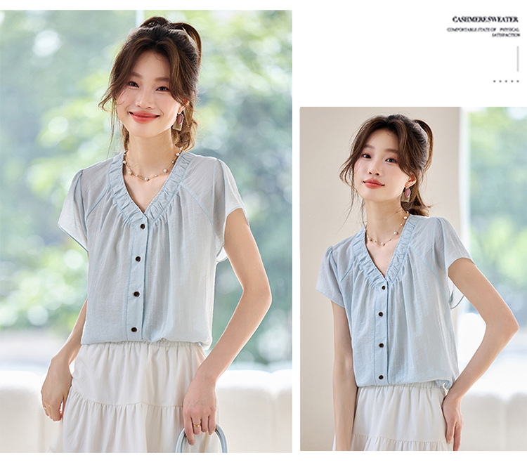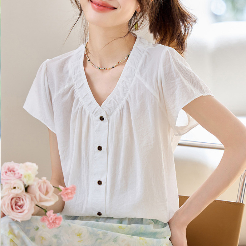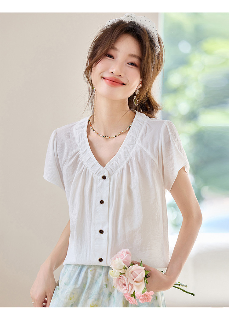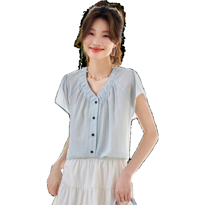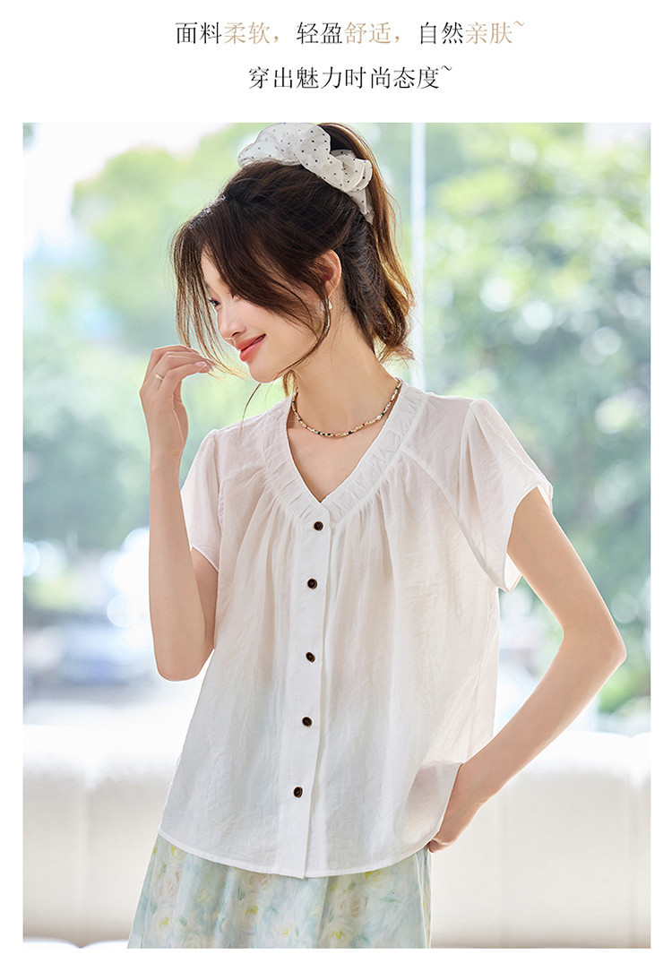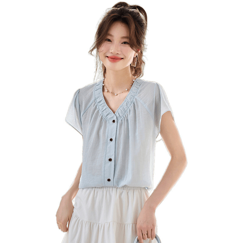 Женская рубашка с коротким рукавом, лето 2025, новый нишевый дизайн, элегантный топ с V-образным вырезом, уникальная тонкая рубашка французского стиля