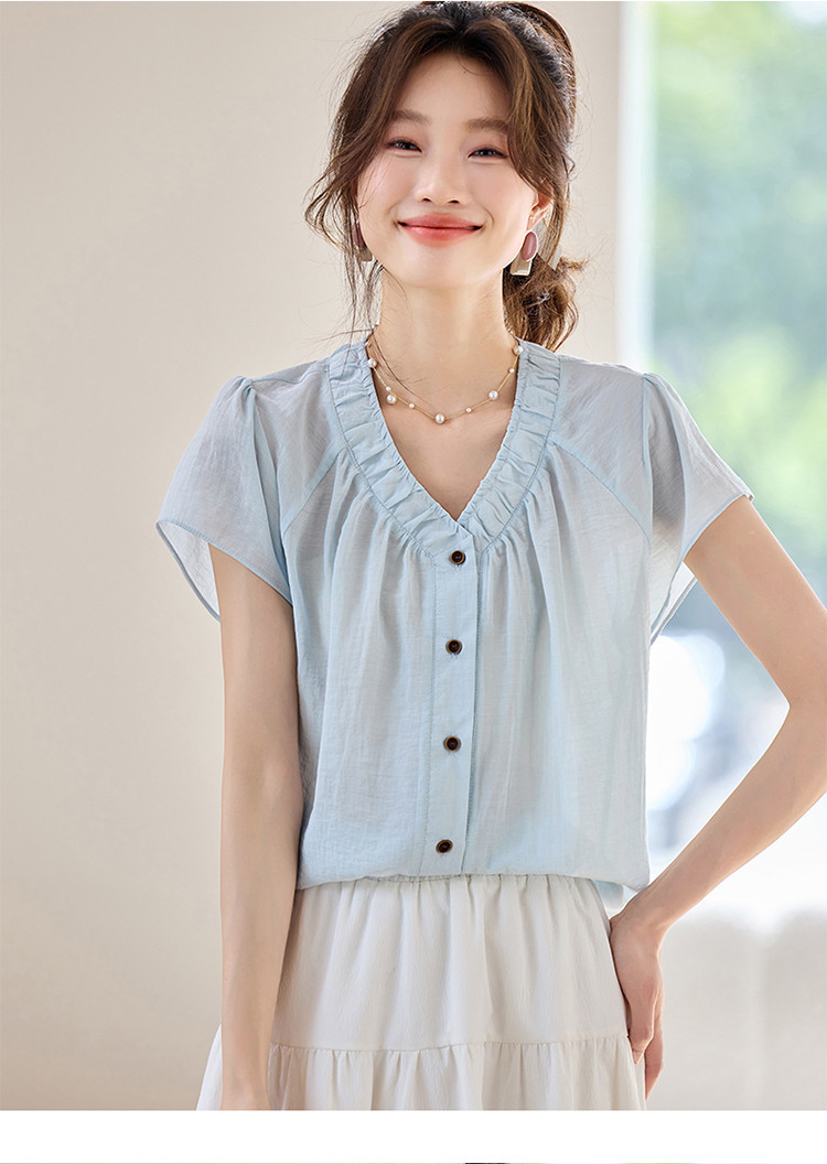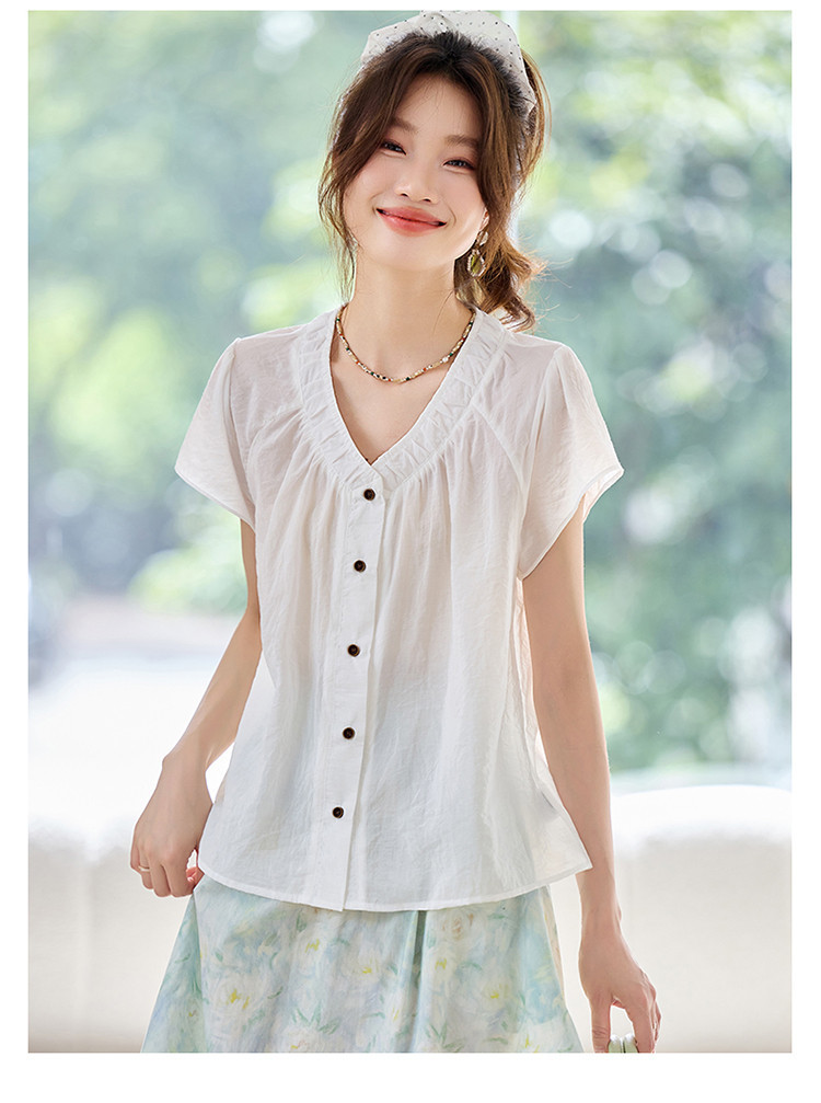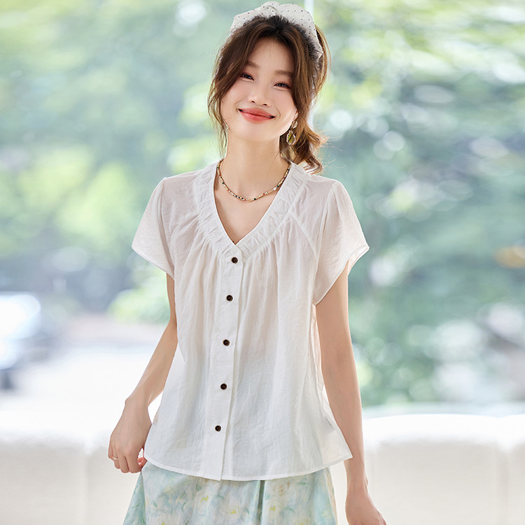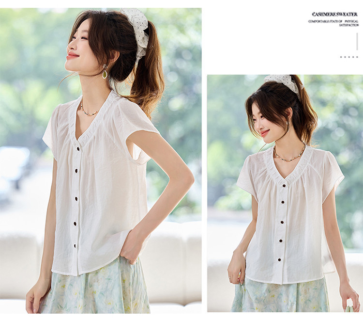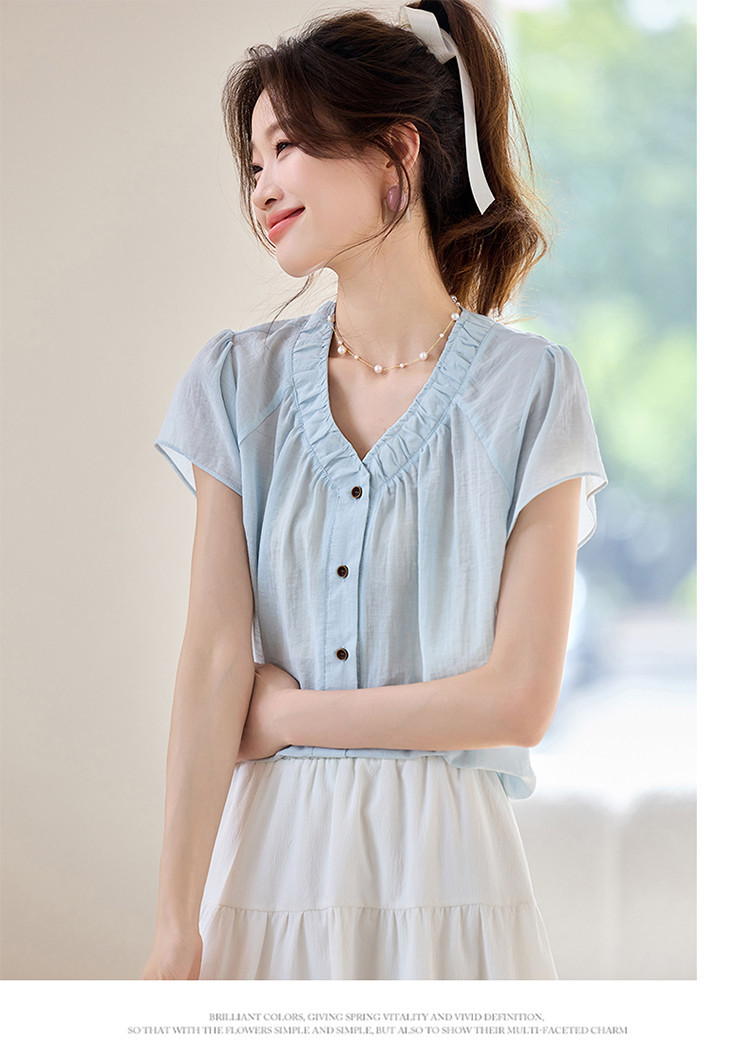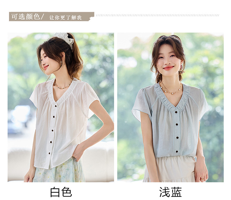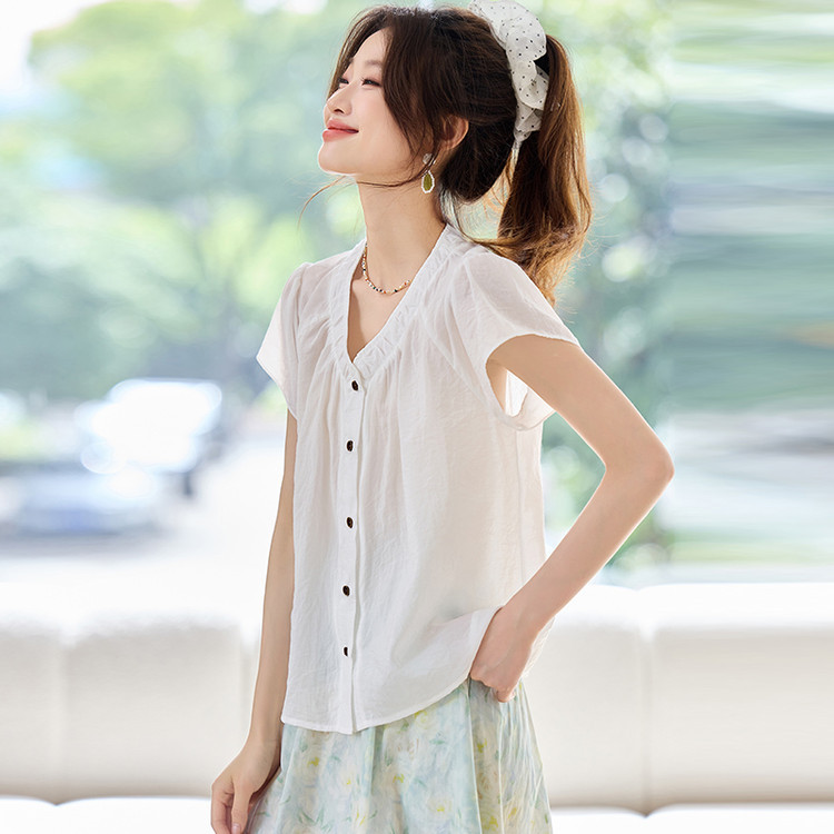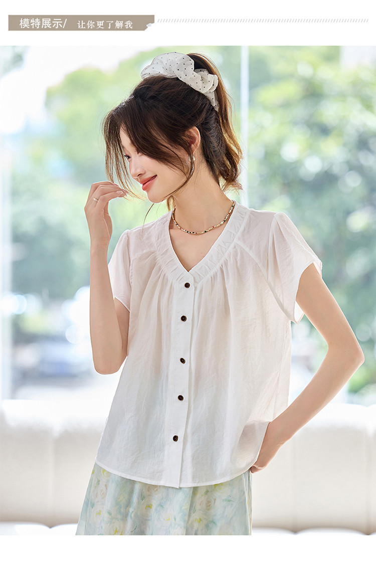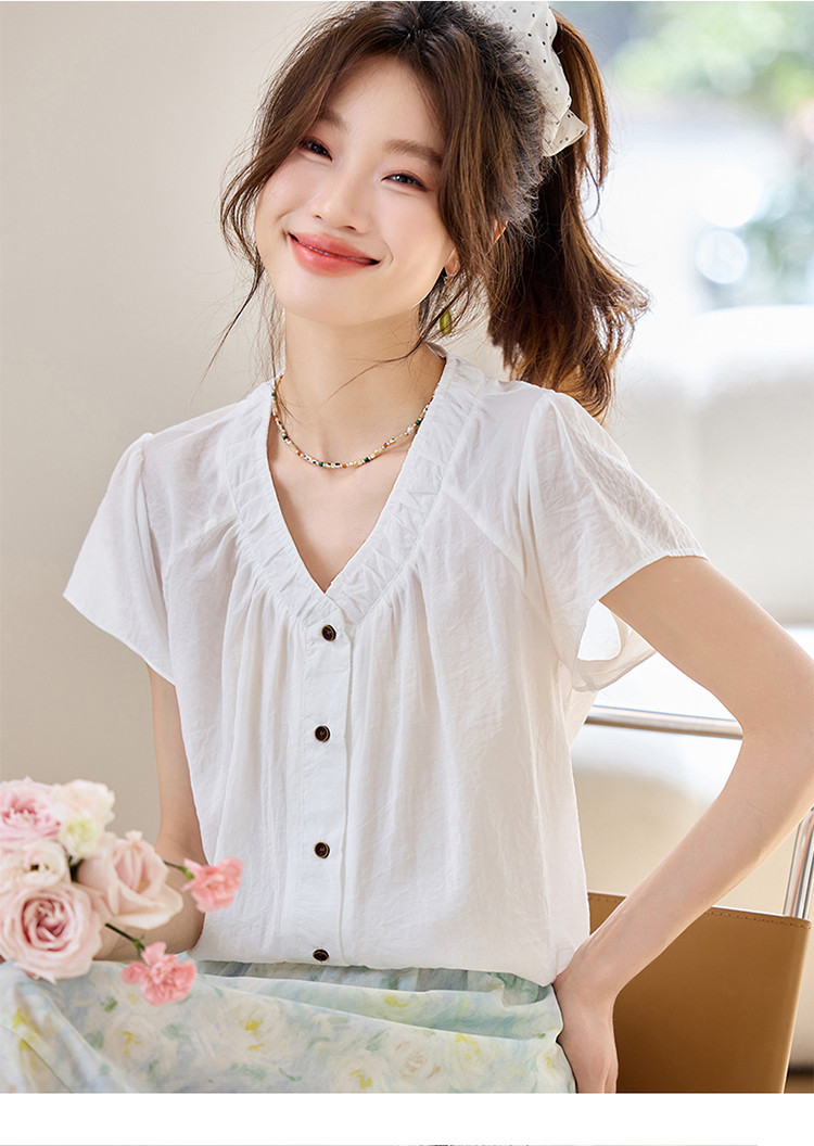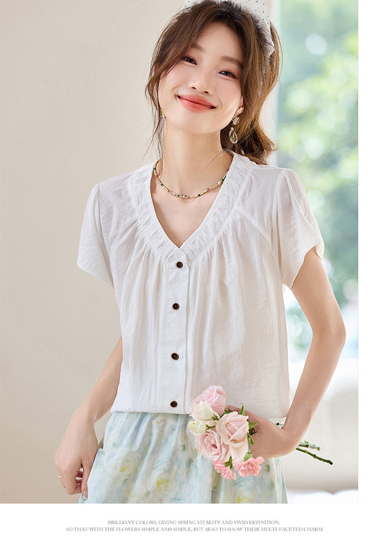 Женская рубашка с коротким рукавом, лето 2025, новый нишевый дизайн, элегантный топ с V-образным вырезом, уникальная тонкая рубашка французского стиля