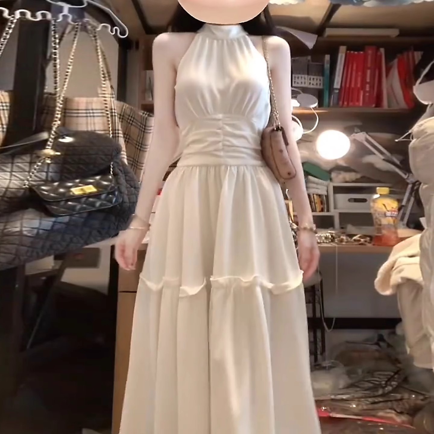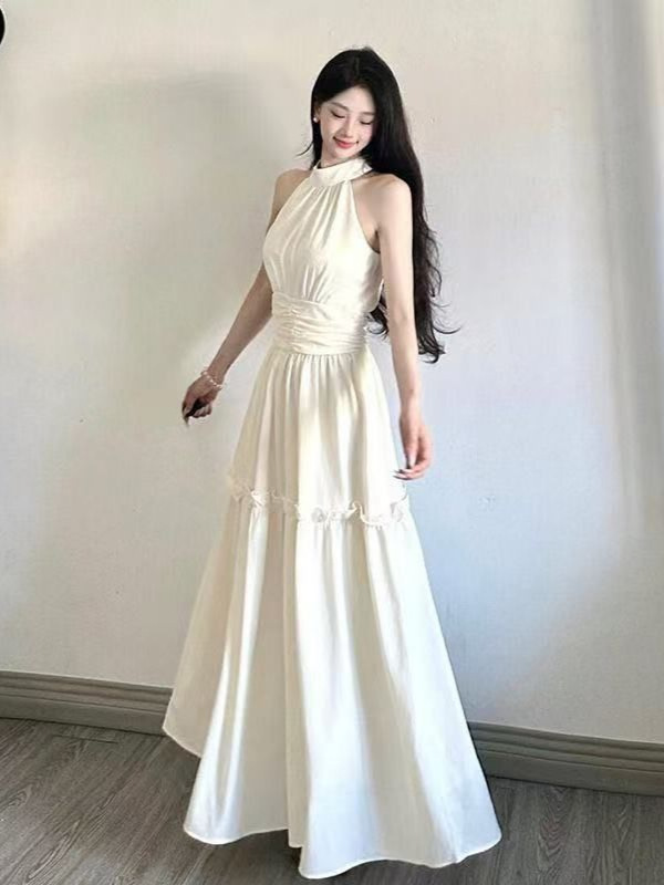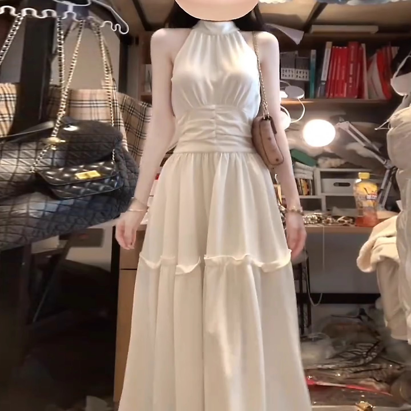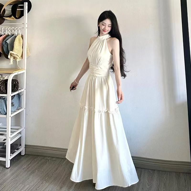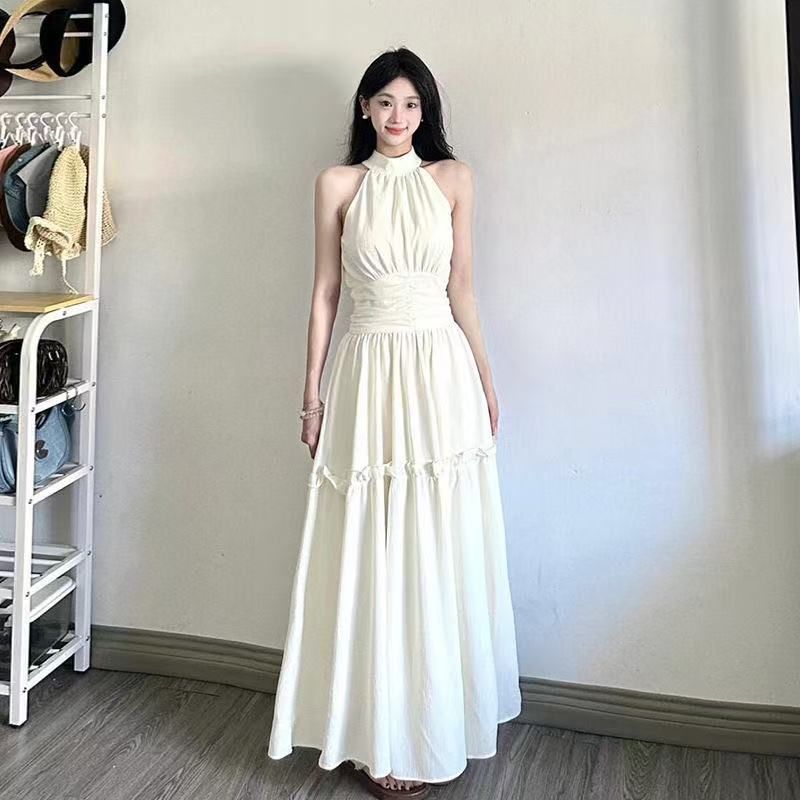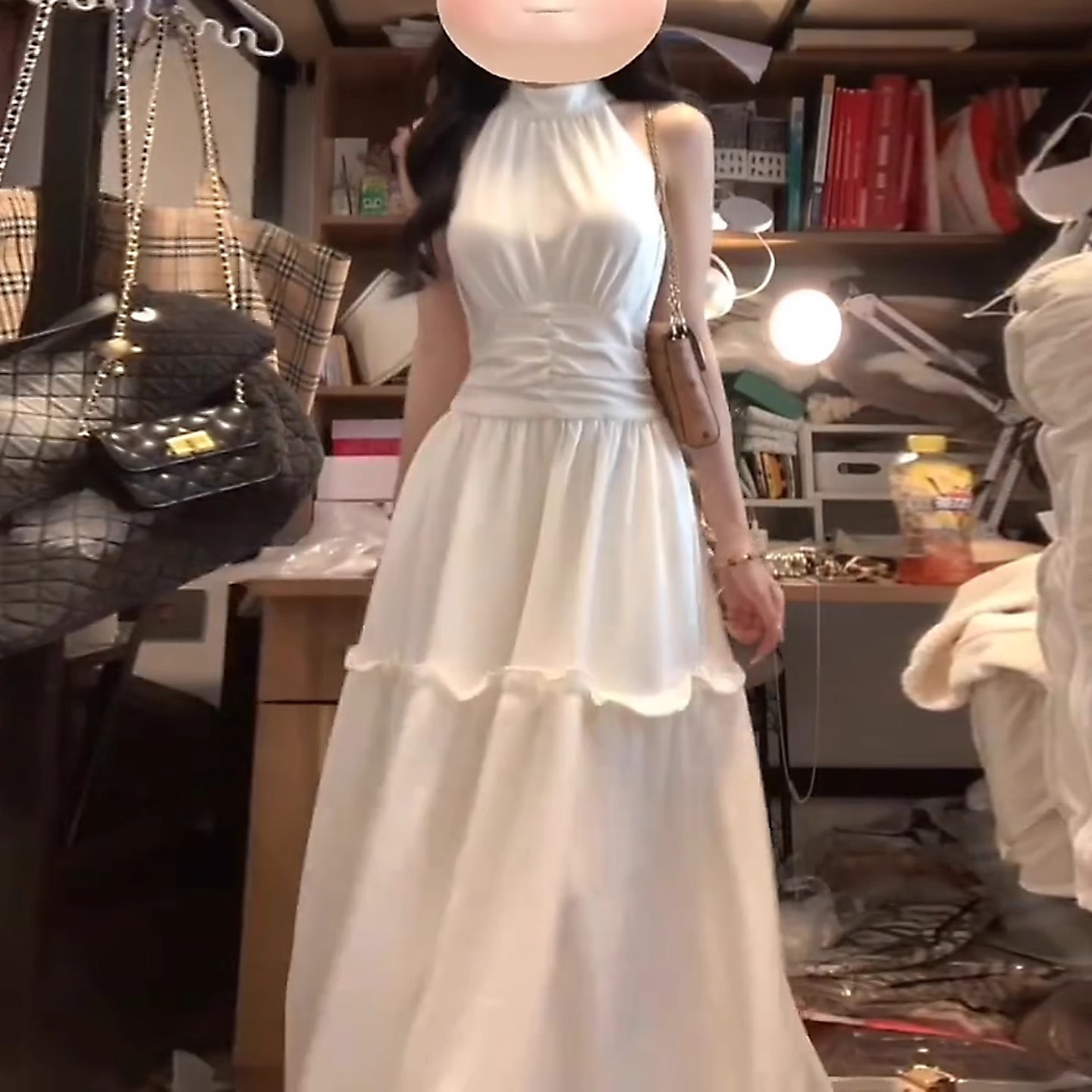 Белое платье-халтер для женщин, лето 2025, новое маленькое белое платье для отдыха на море, без рукавов, французские бретели, длинное платье
