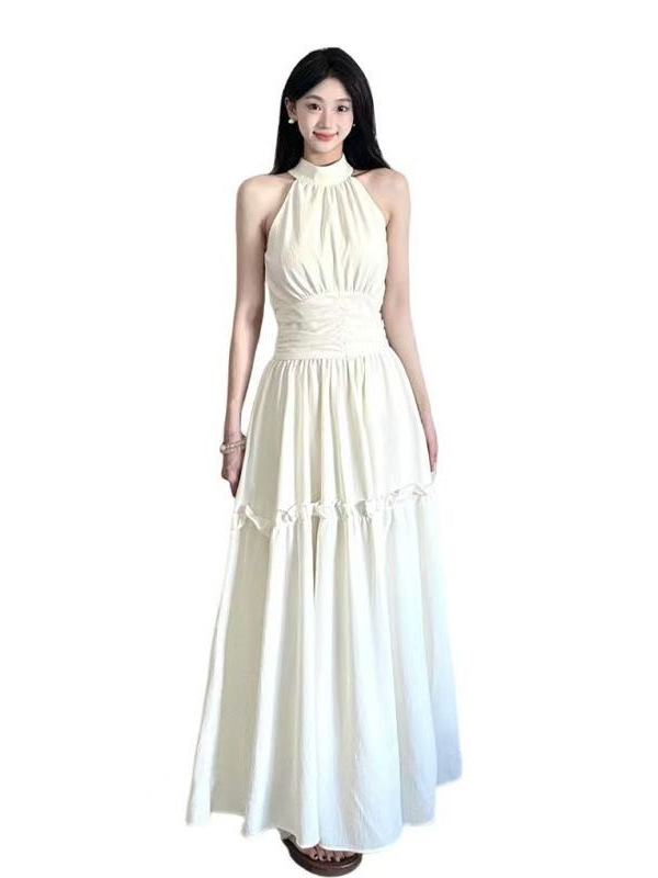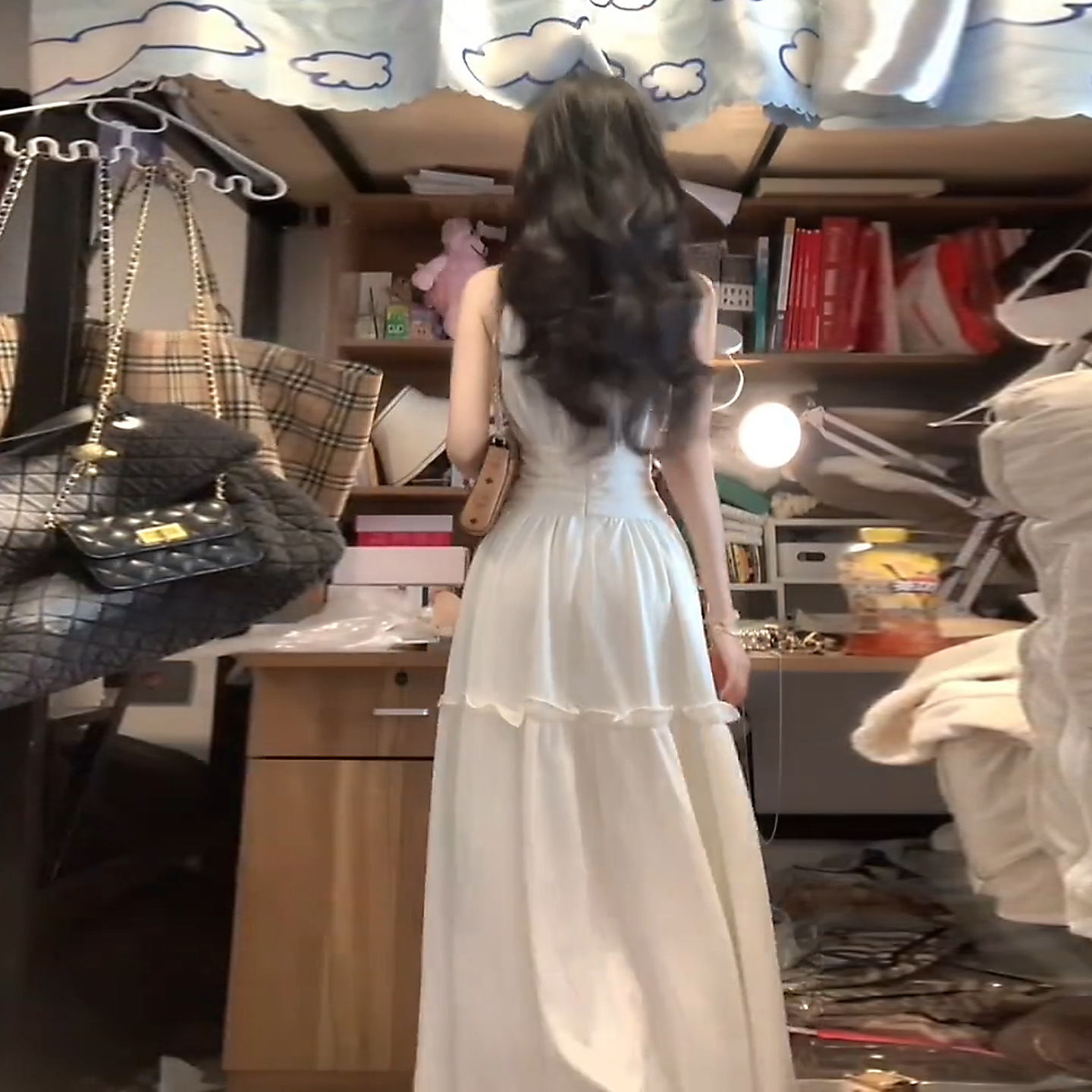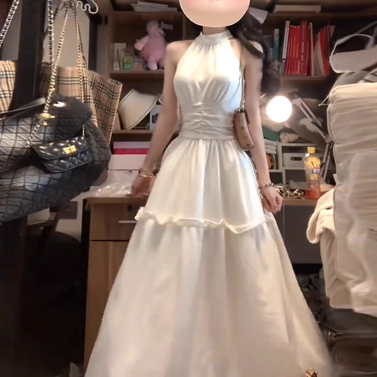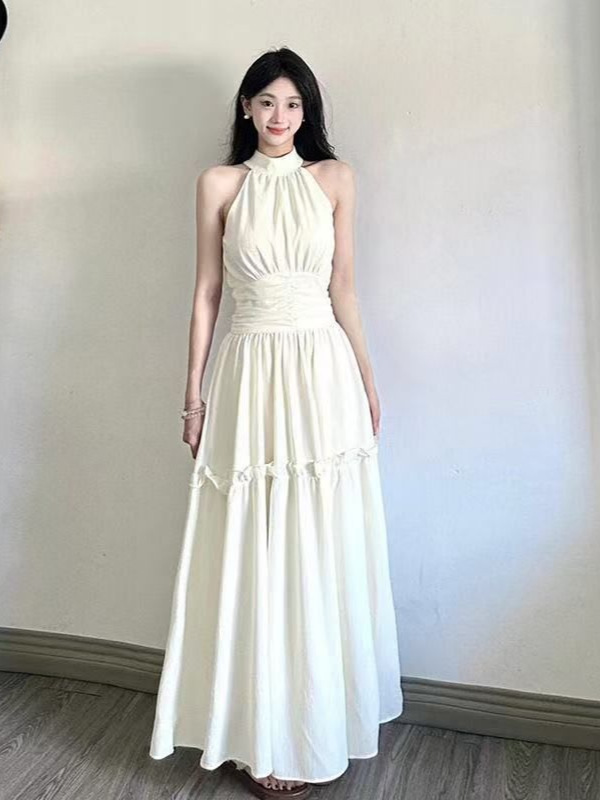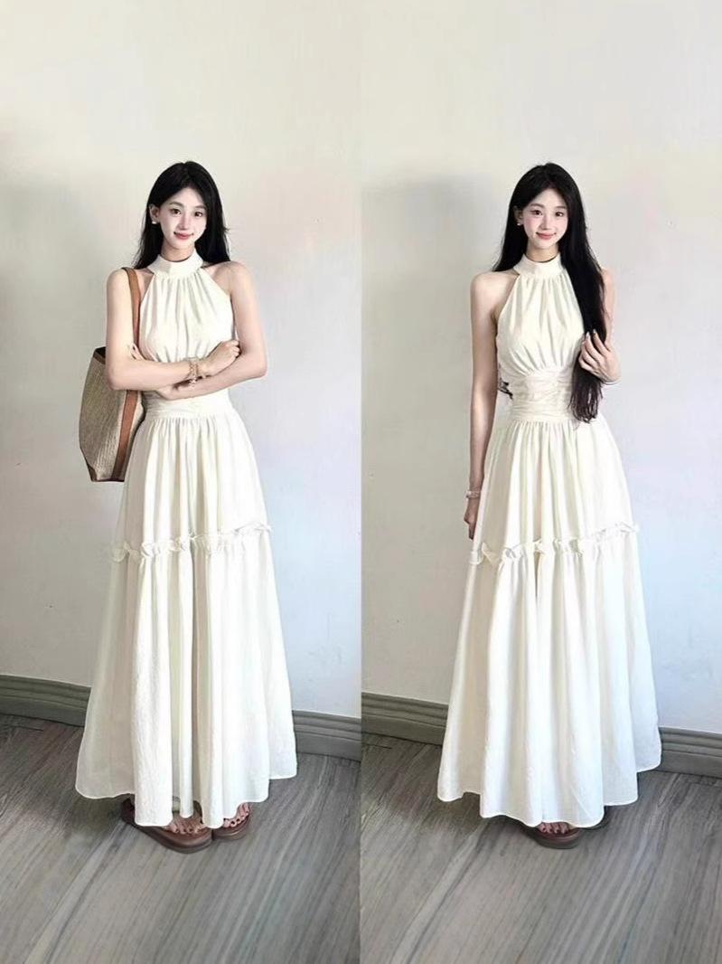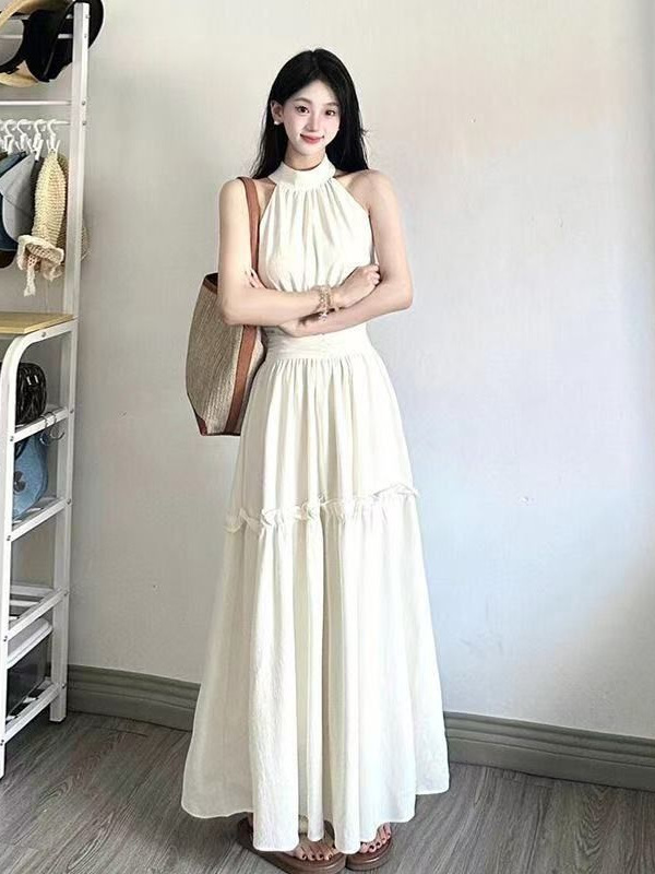 Белое платье-халтер для женщин, лето 2025, новое маленькое белое платье для отдыха на море, без рукавов, французские бретели, длинное платье