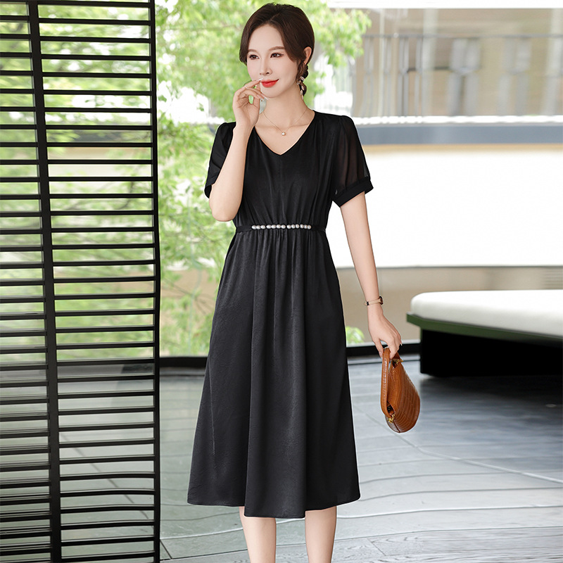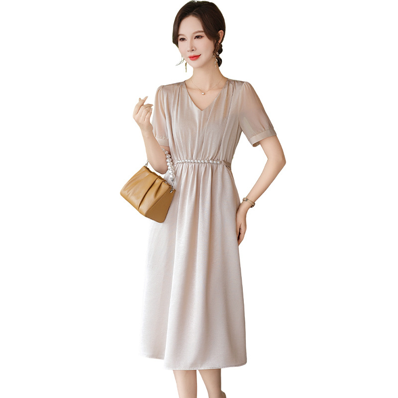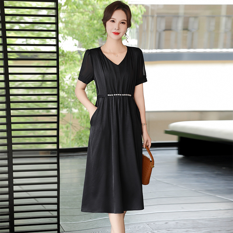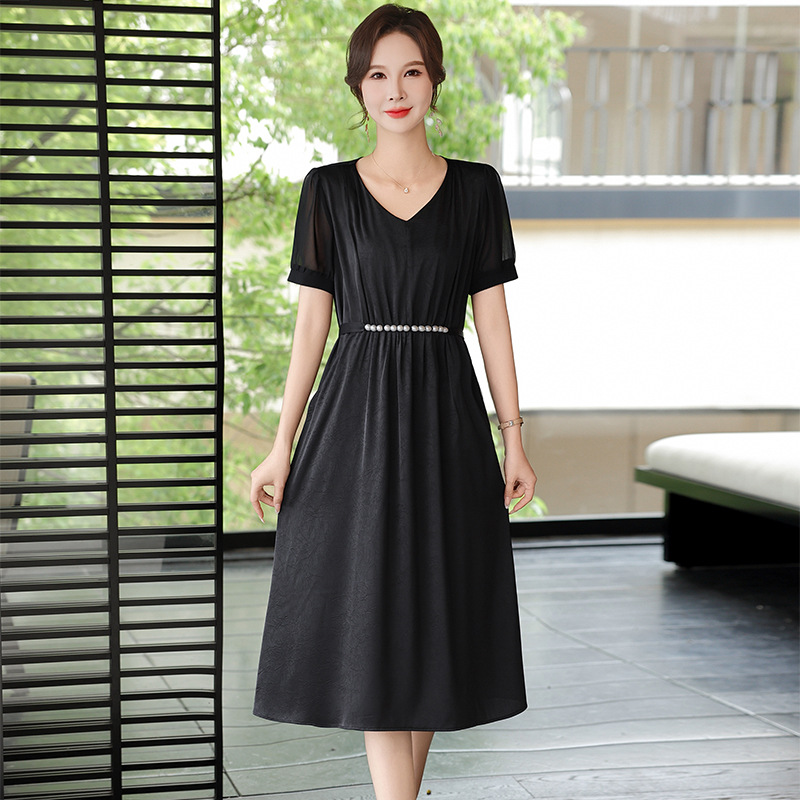 Летнее платье для мамы, элегантное и стройнящее, для женщин среднего и пожилого возраста, новая модель лета 2025 года, короткий рукав, юбка.
