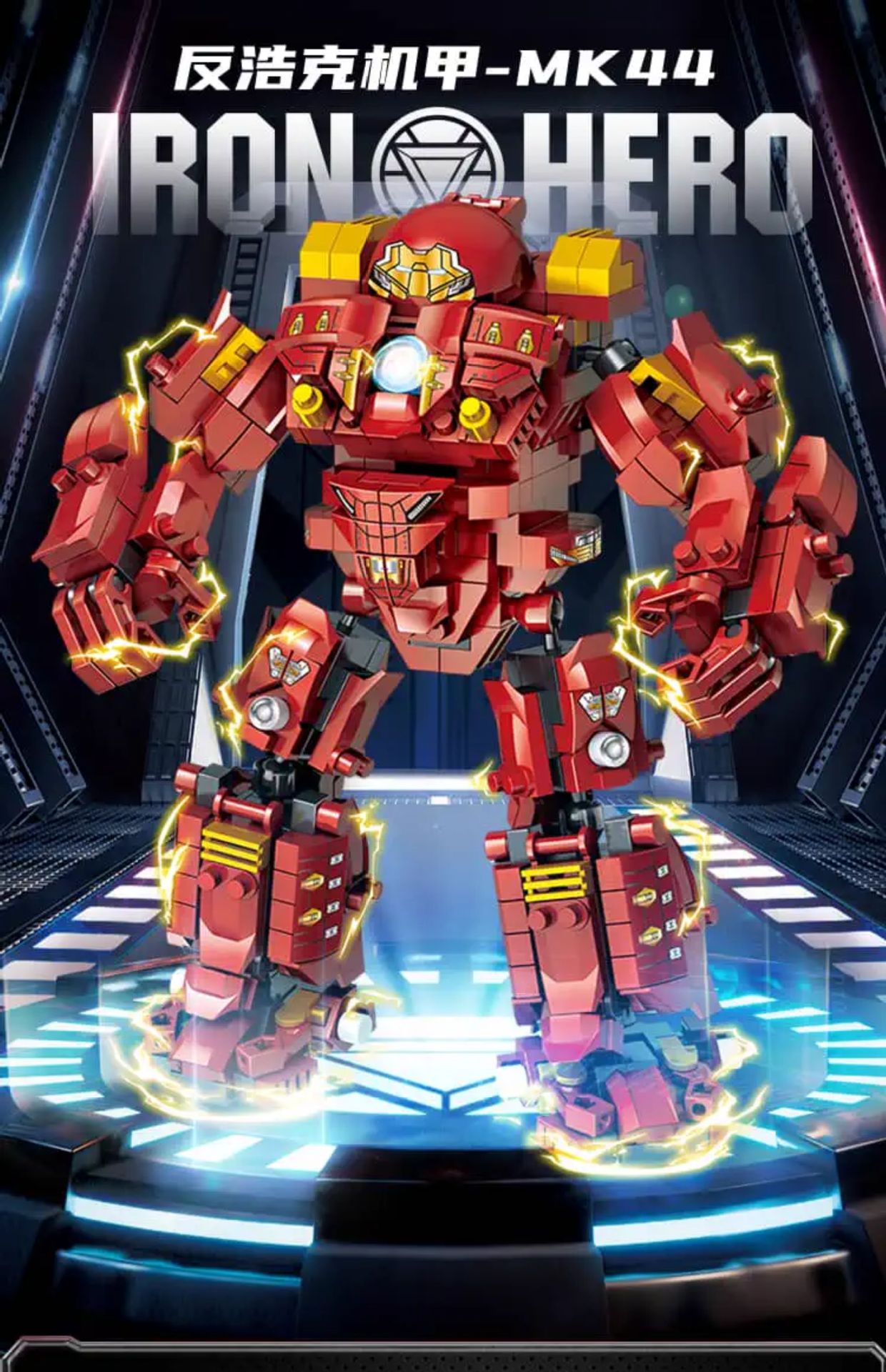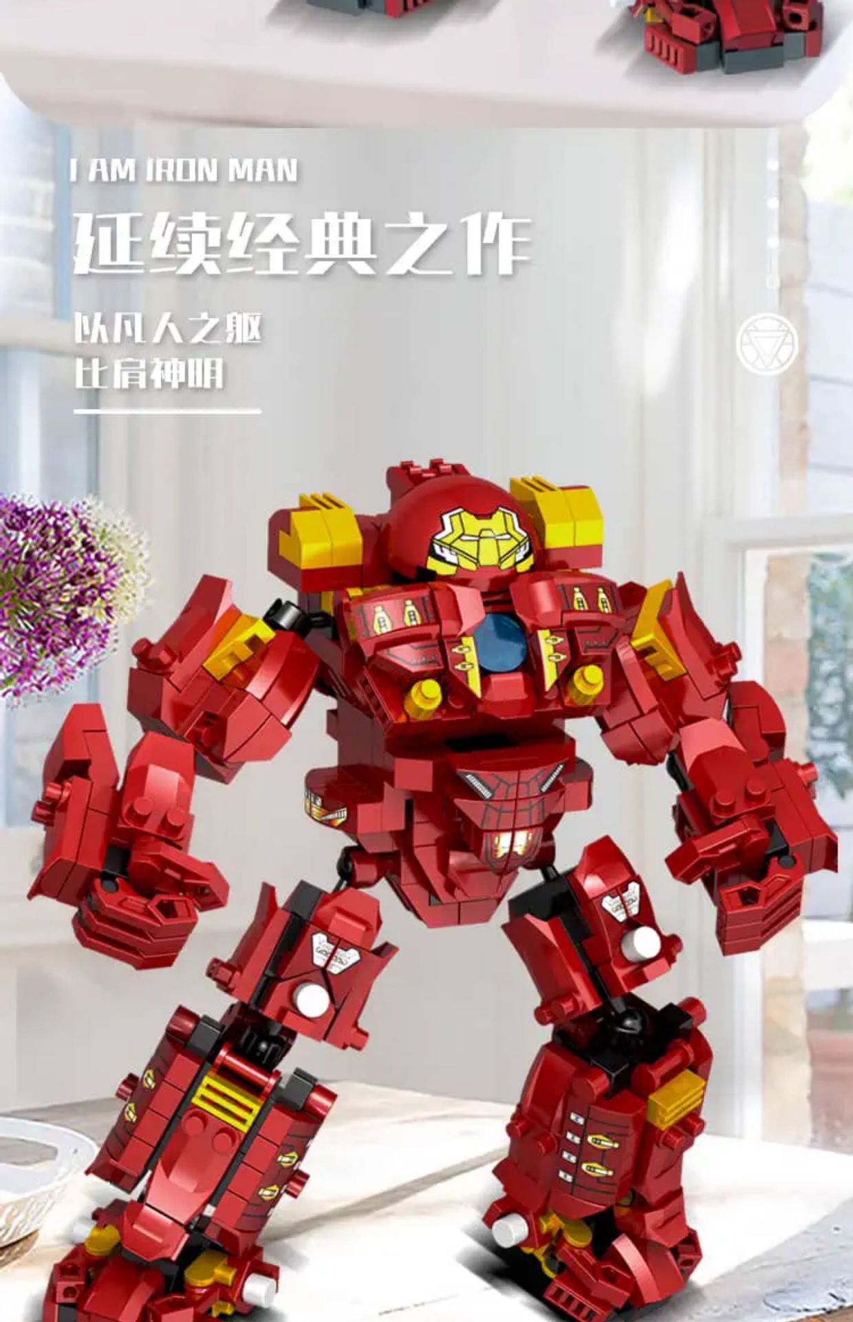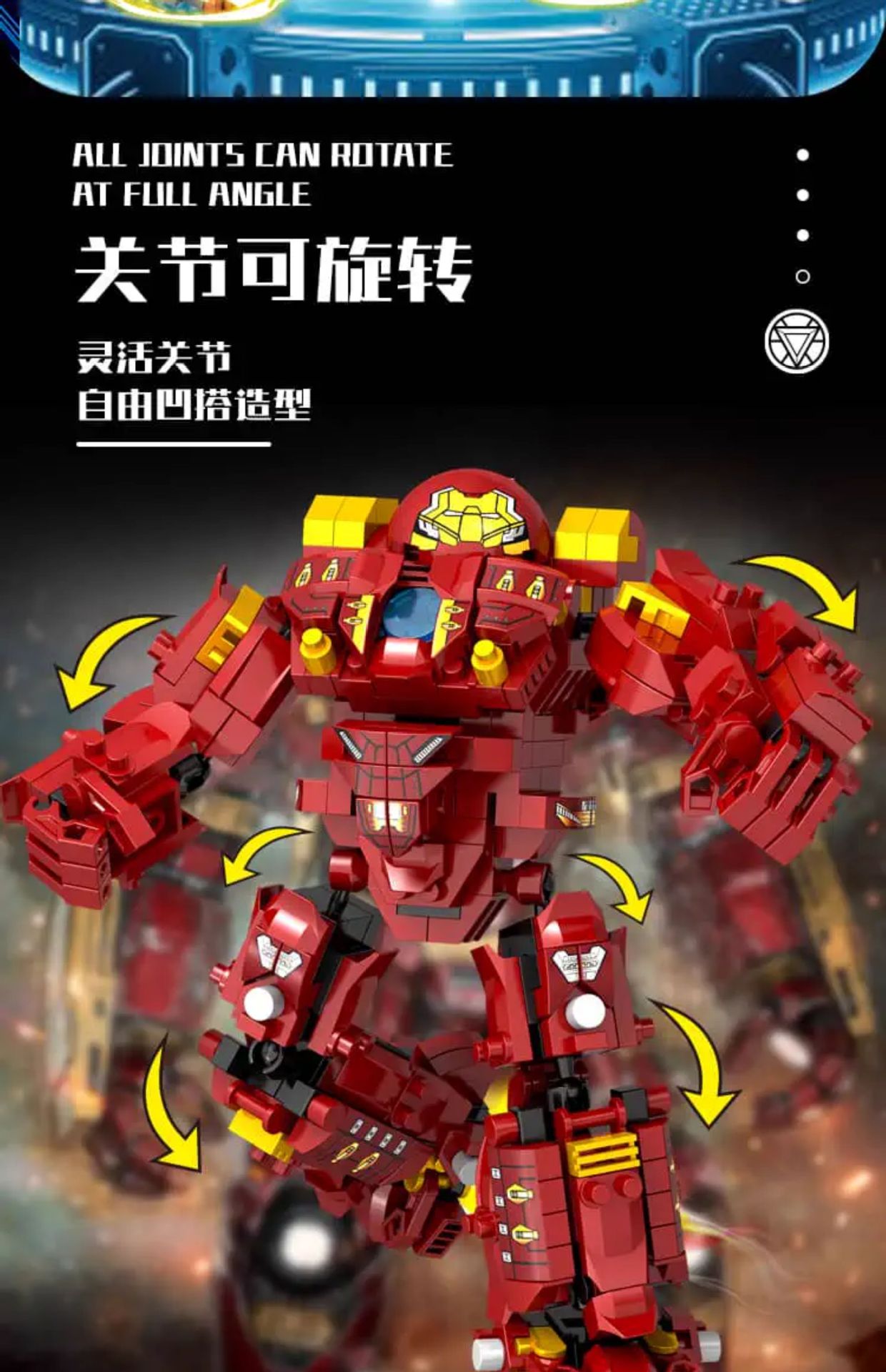 Железный человек Халкбустер Марк 44 [850 частиц]; Меха-военная машина Железного Человека [1200 частиц]; Меха-трансформер «Бамблби» [1500 частиц]; Thunder Power Optimus War Armor [1500 частиц]; Храм Ниндзяго + 6 бесплатных минифигурок [850 частиц]