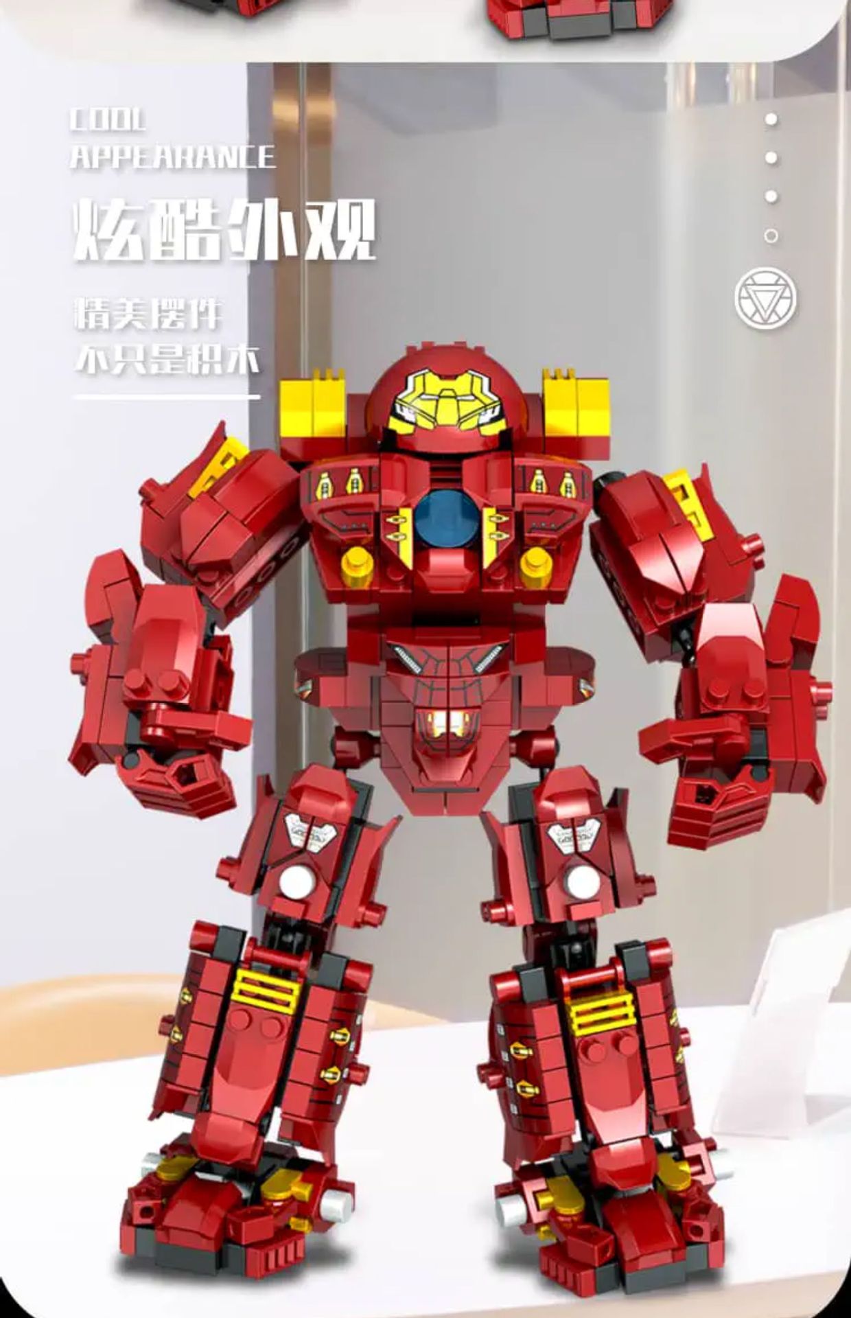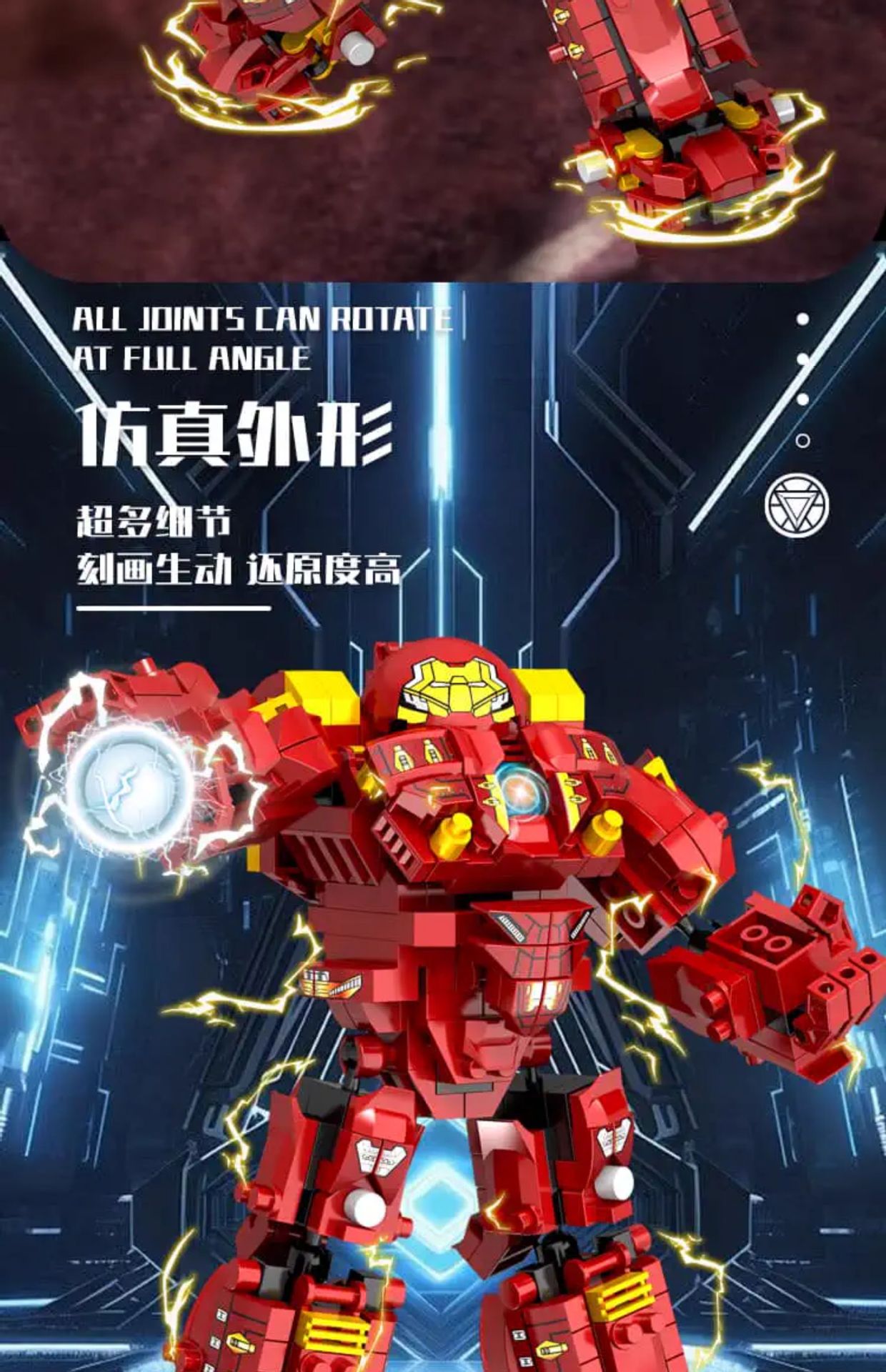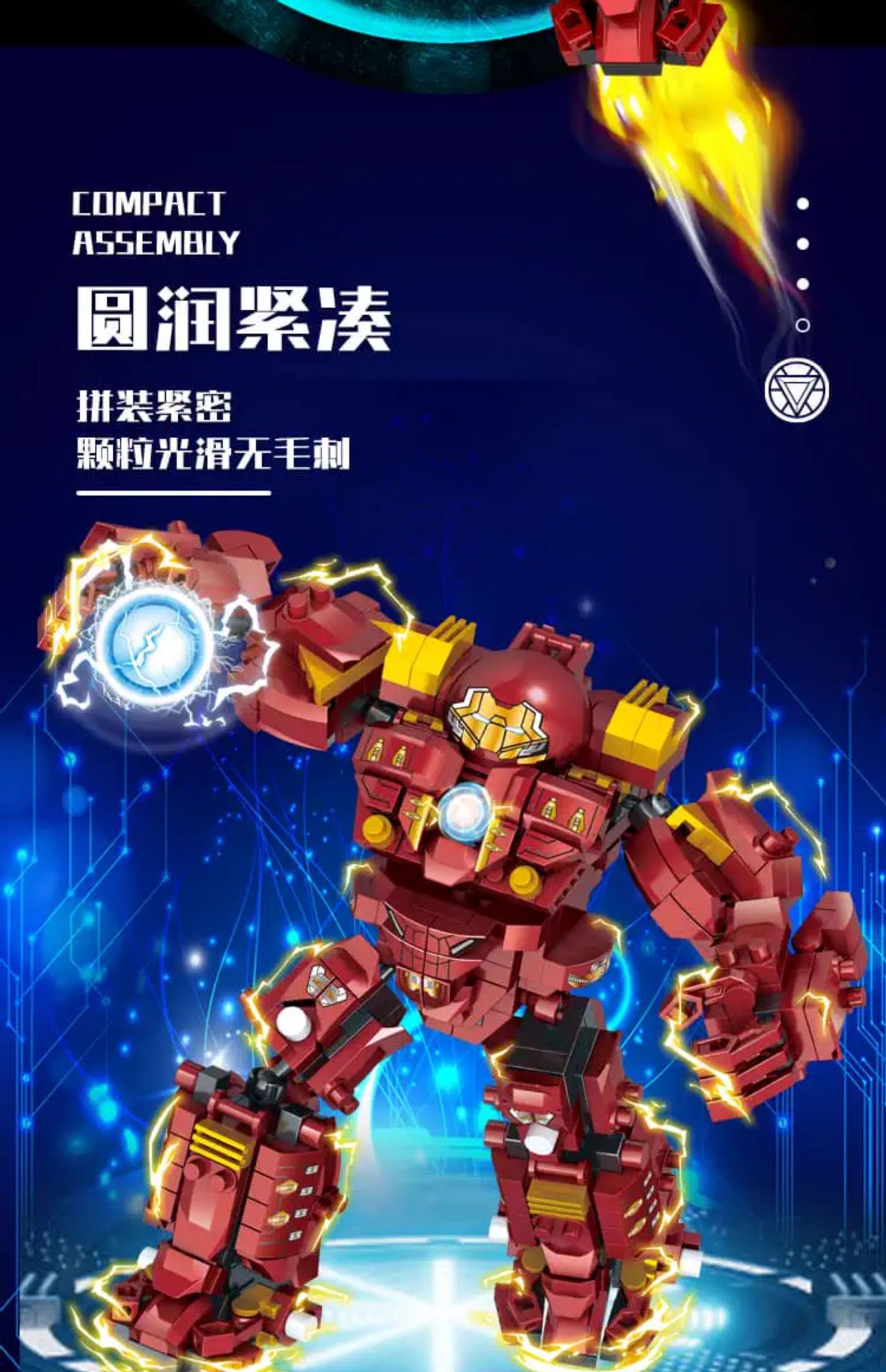 Железный человек Халкбустер Марк 44 [850 частиц]; Меха-военная машина Железного Человека [1200 частиц]; Меха-трансформер «Бамблби» [1500 частиц]; Thunder Power Optimus War Armor [1500 частиц]; Храм Ниндзяго + 6 бесплатных минифигурок [850 частиц]