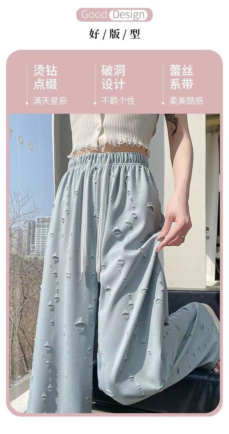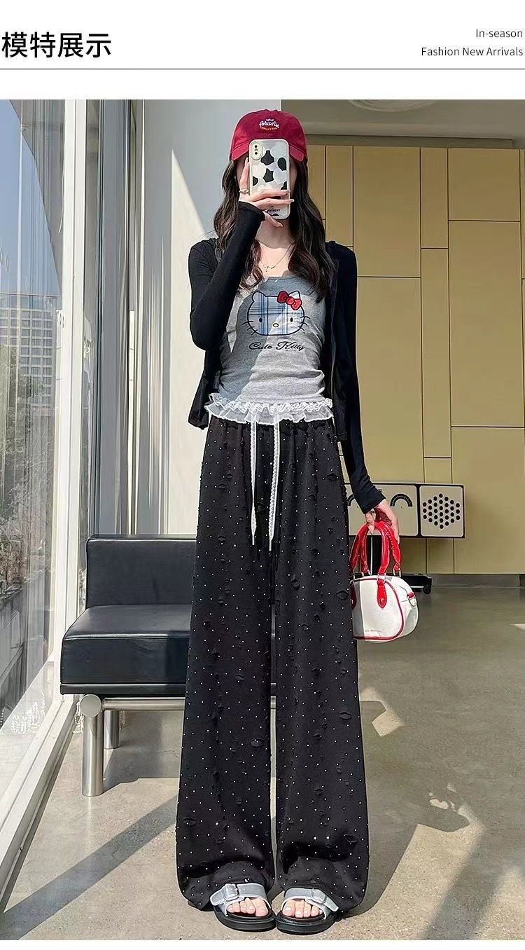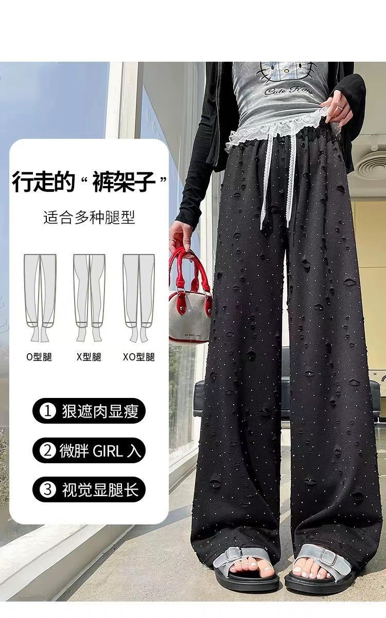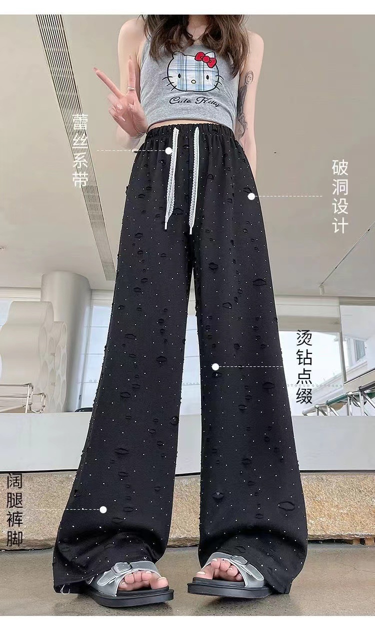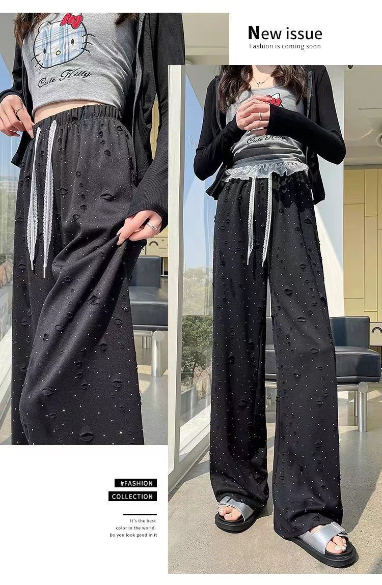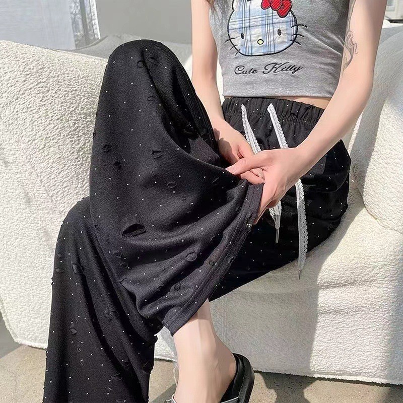 Уличные рваные длинные брюки в корейском стиле на шнурке, повседневные американские брюки Ямамото с высокой талией, милые свободные прямые широкие брюки со стразами