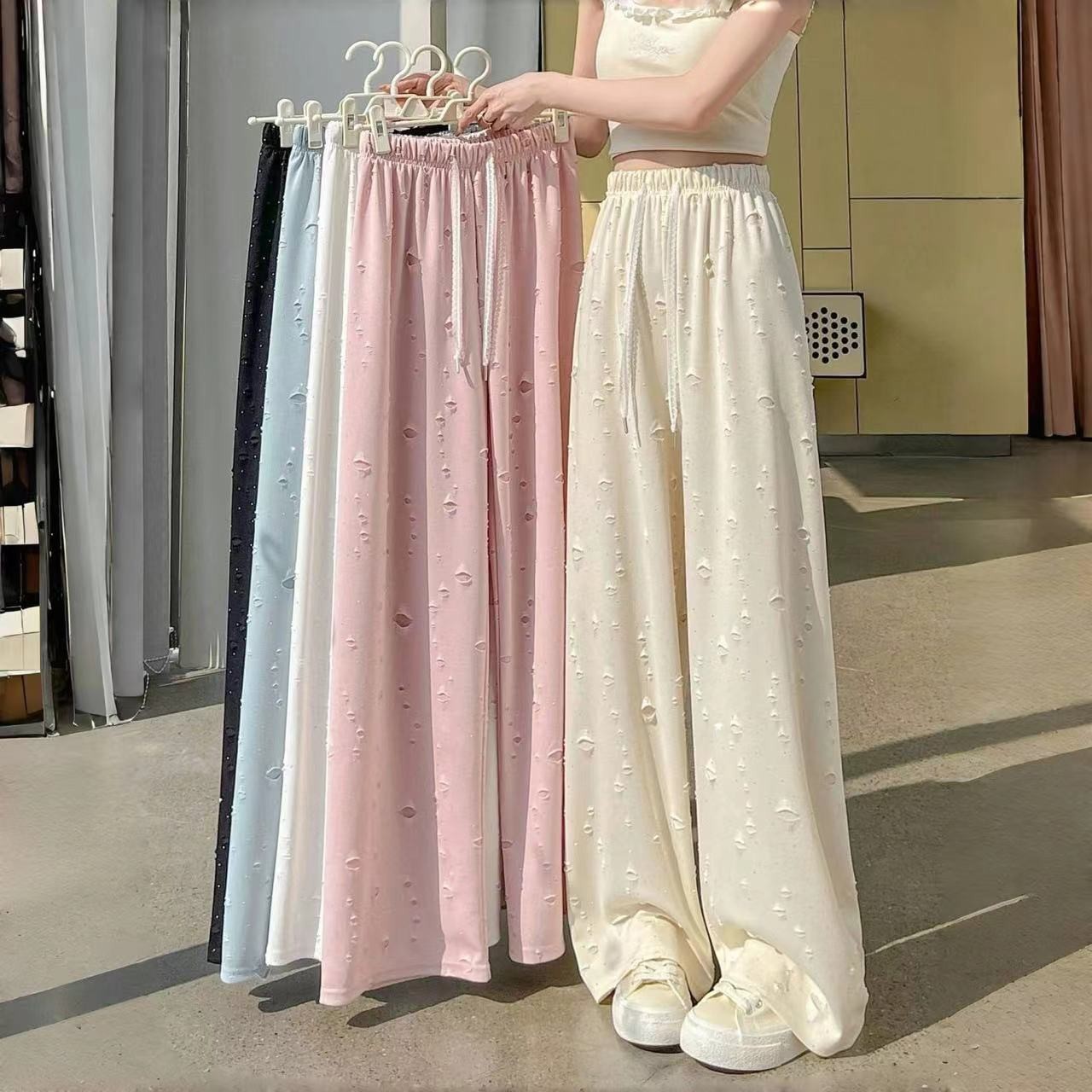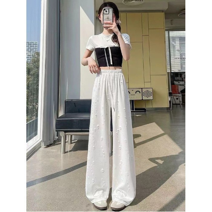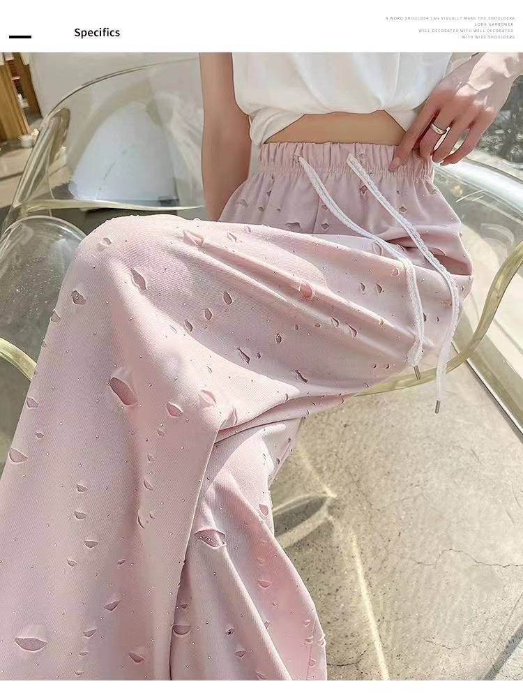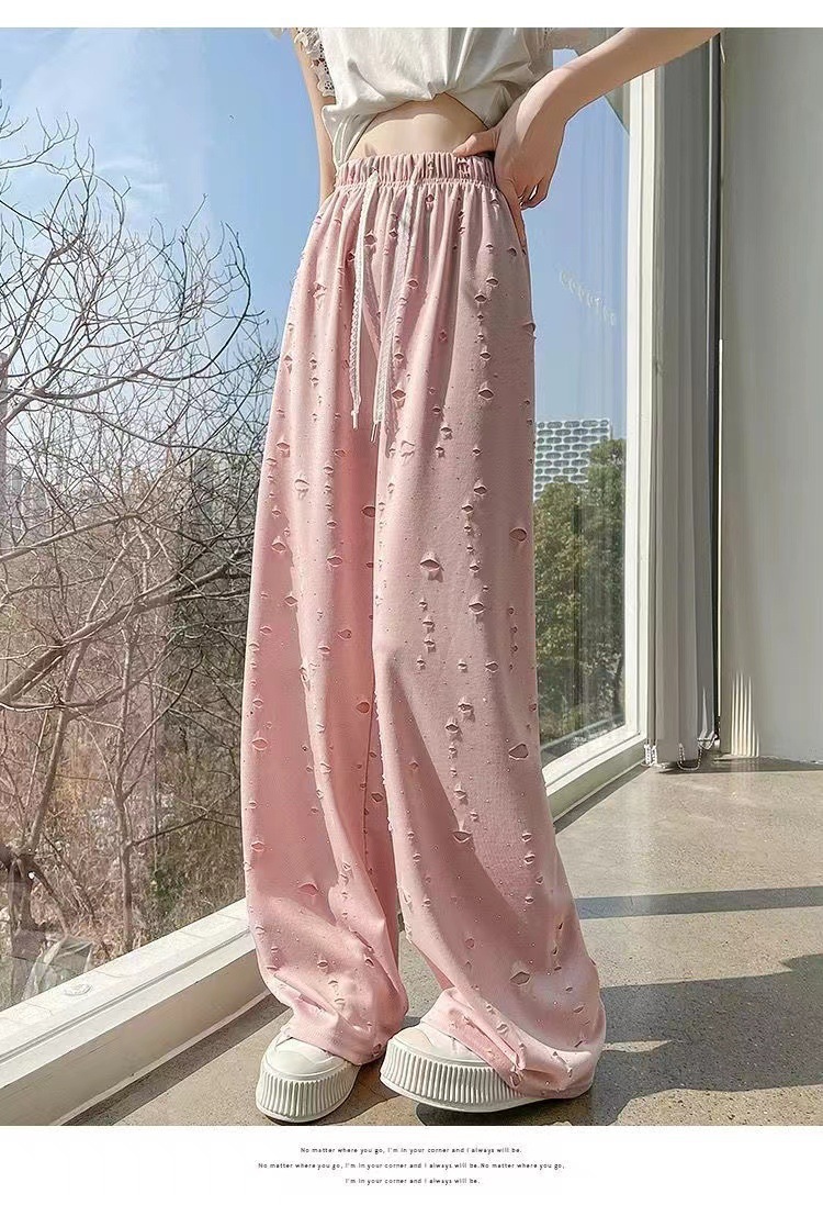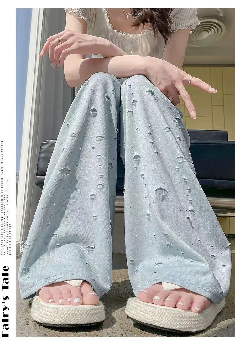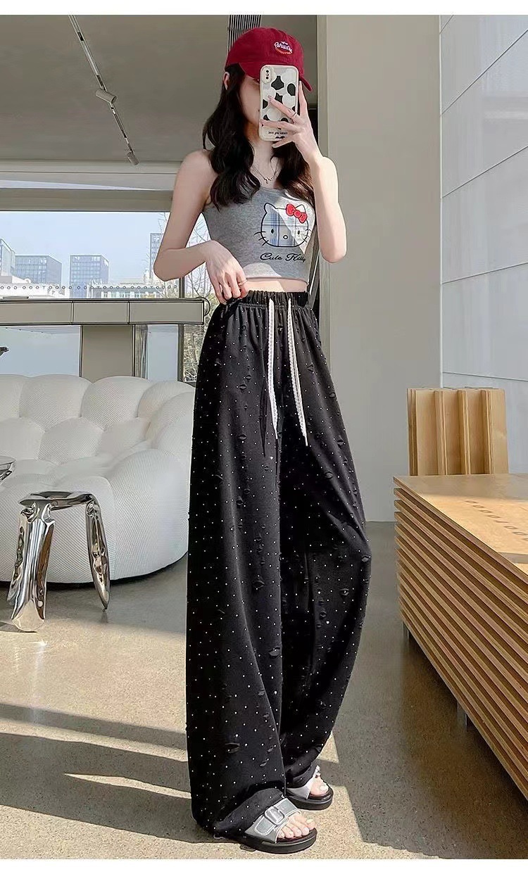 Уличные рваные длинные брюки в корейском стиле на шнурке, повседневные американские брюки Ямамото с высокой талией, милые свободные прямые широкие брюки со стразами