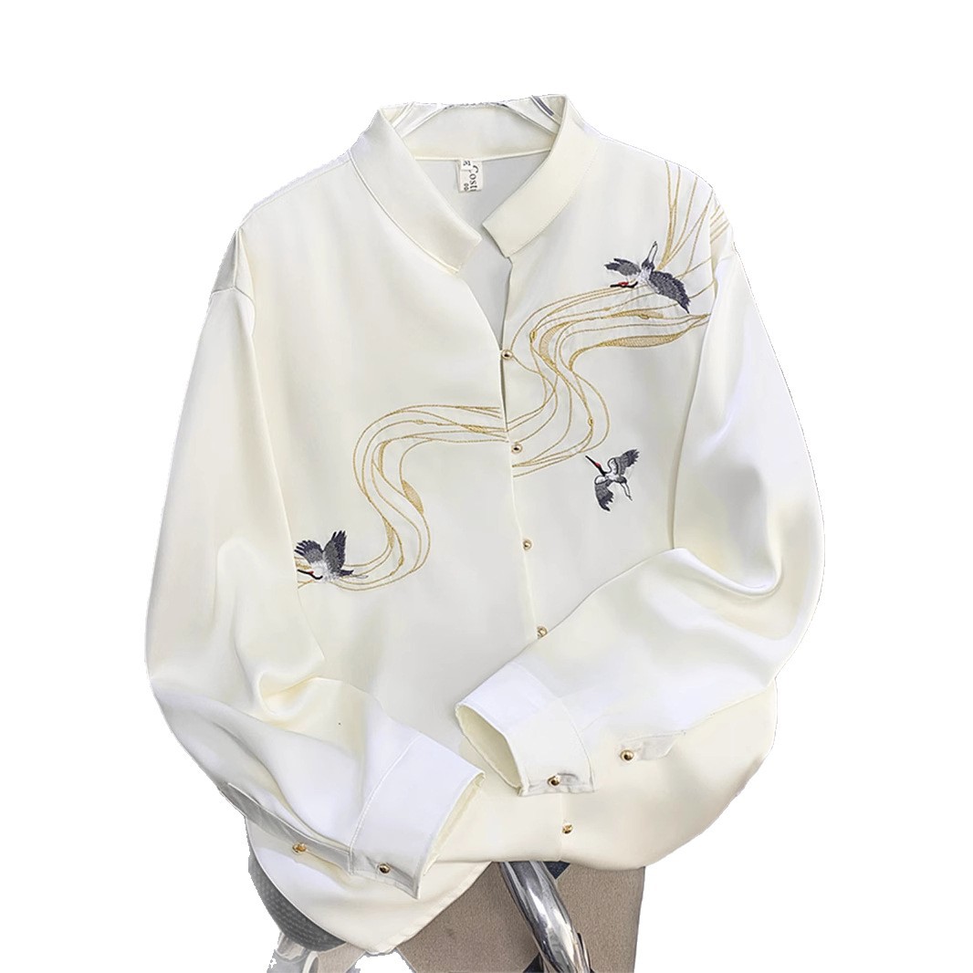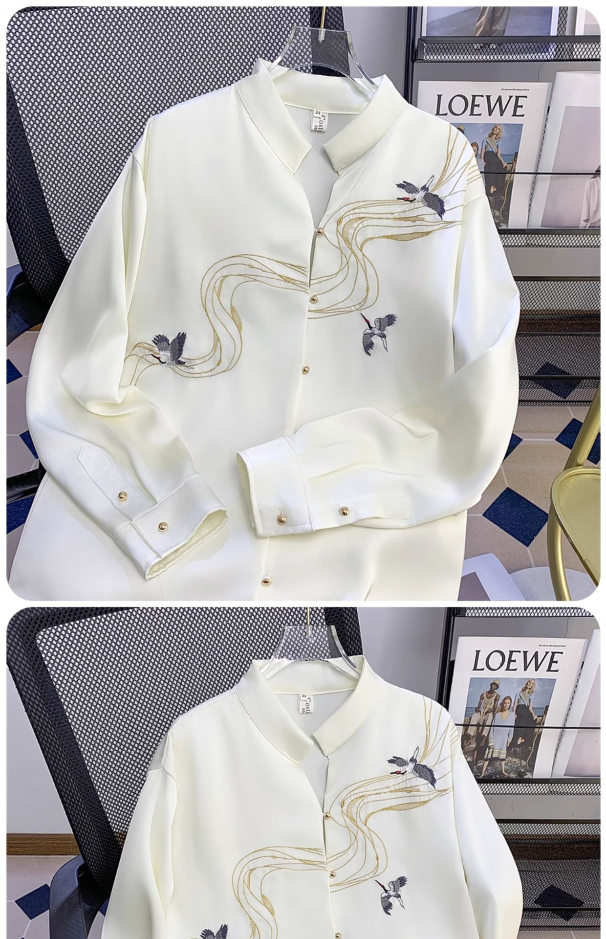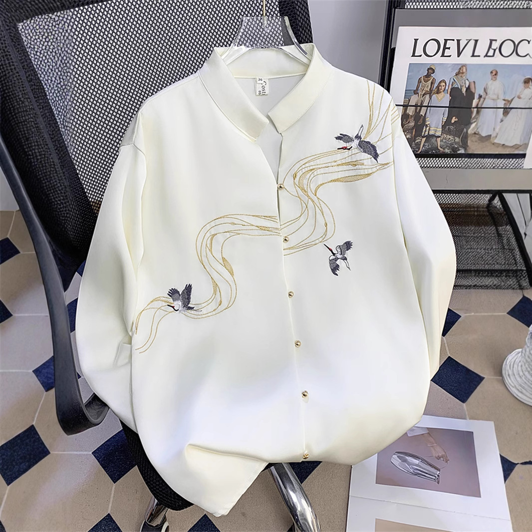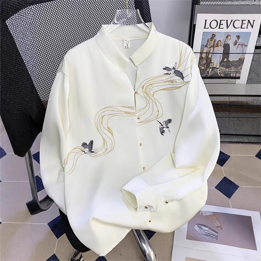 Новая рубашка с вышивкой журавля в китайском стиле, мужская ретро-рубашка высокого класса в национальном стиле с воротником-стойкой, повседневная рубашка с длинными рукавами в стиле Тан