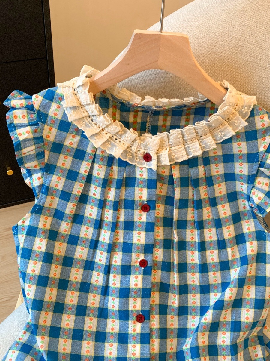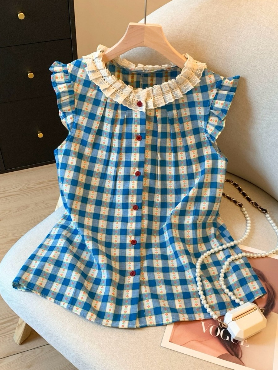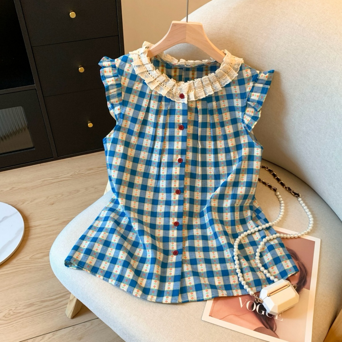 Корейский милый цветочный кружевной жилет с короткими рукавами для женщин, летний французский клетчатый жилет с маленькими летящими рукавами, топ