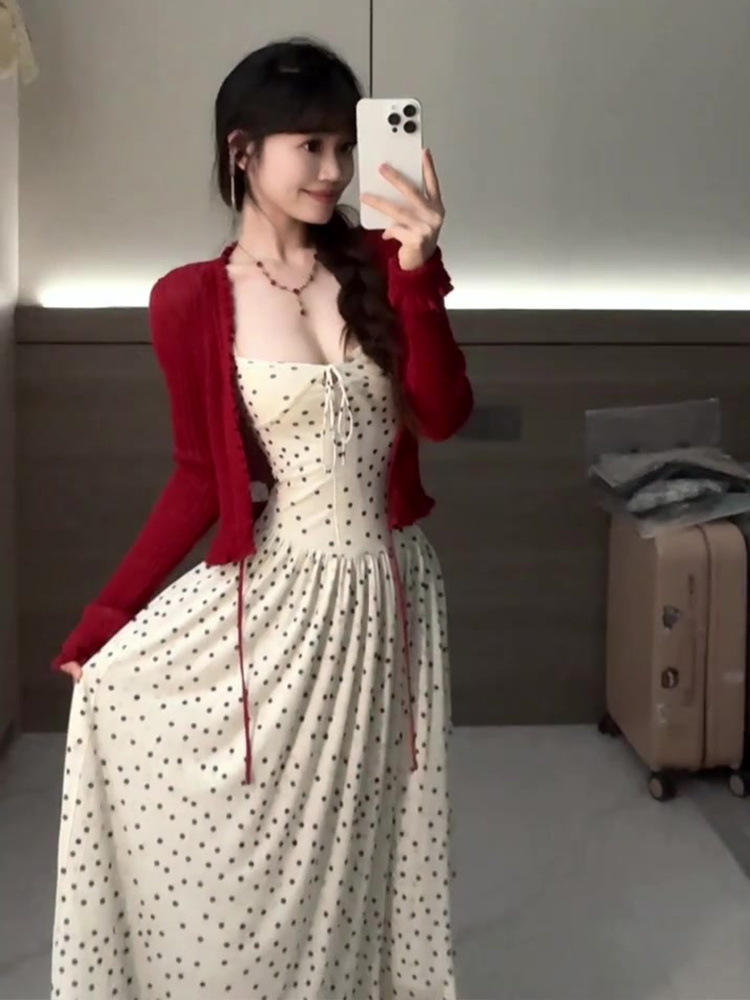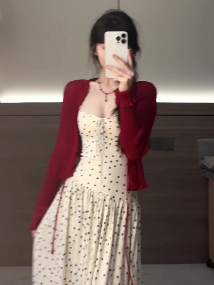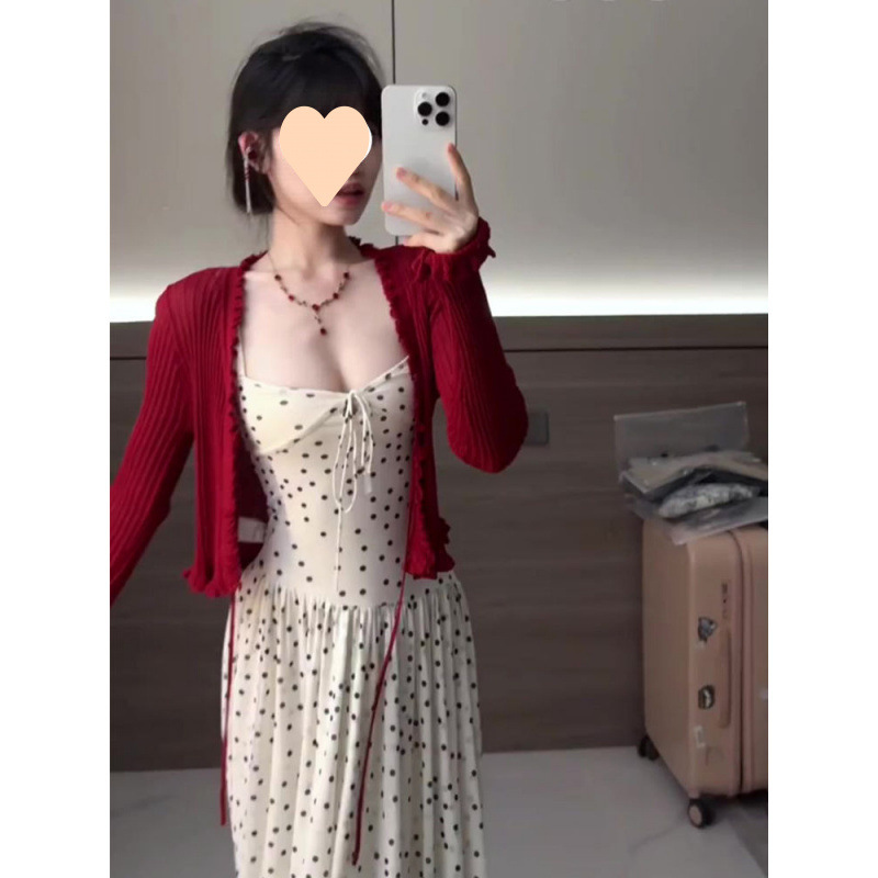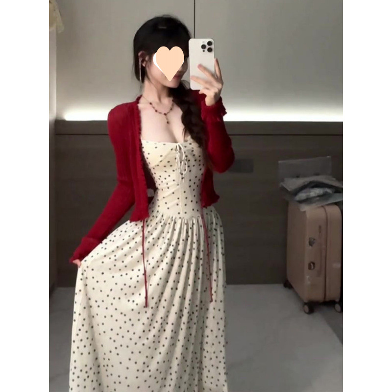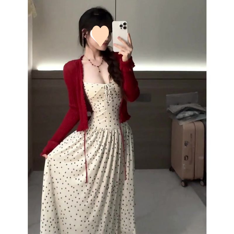 Женский комплект платья на бретельках в горошек во французском стиле, летнее длинное платье со сборками на талии, тонкая трикотажная солнцезащитная рубашка.