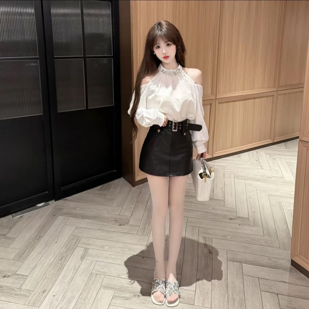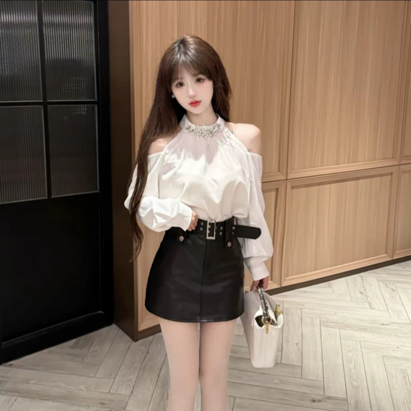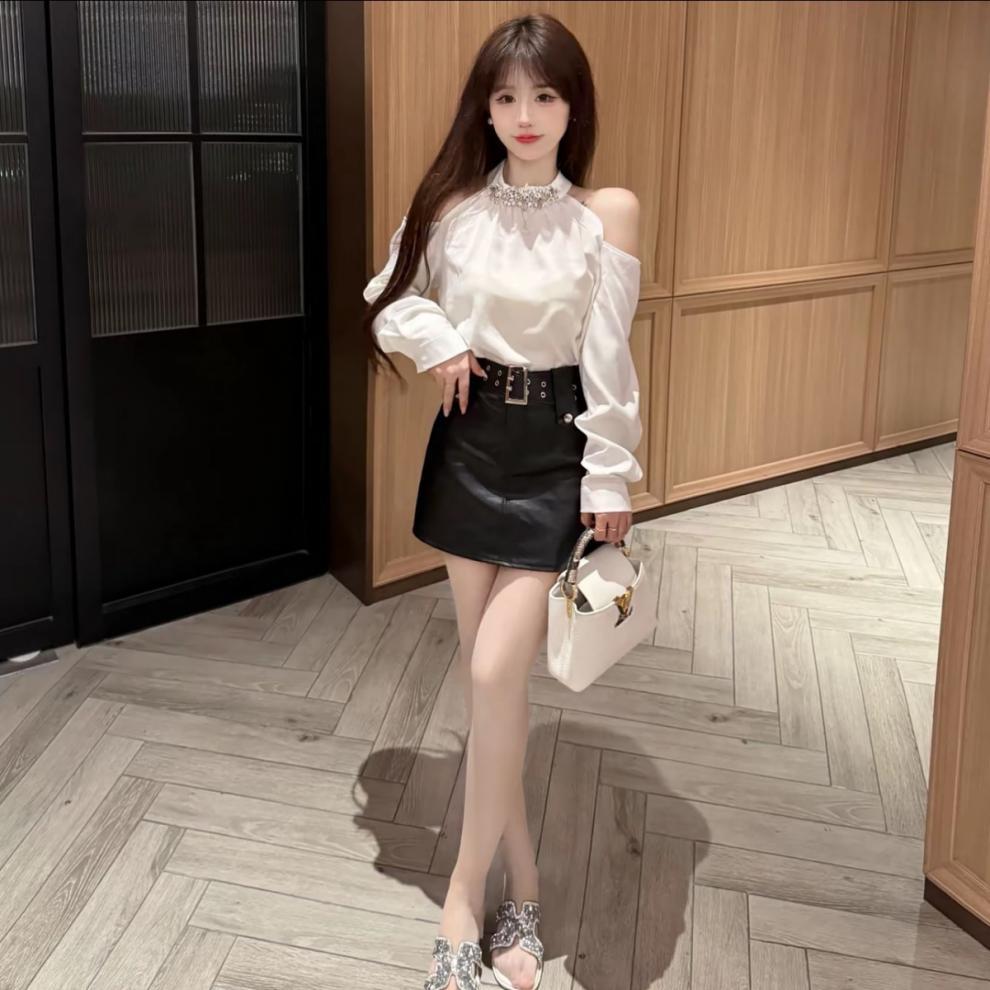 2024 ранняя осень, новинка, популярная рубашка с открытыми плечами и открытыми плечами для девочек, инкрустированная бриллиантами, + юбка из искусственной кожи с высокой талией, закрывающая бедра, комплект из двух предметов