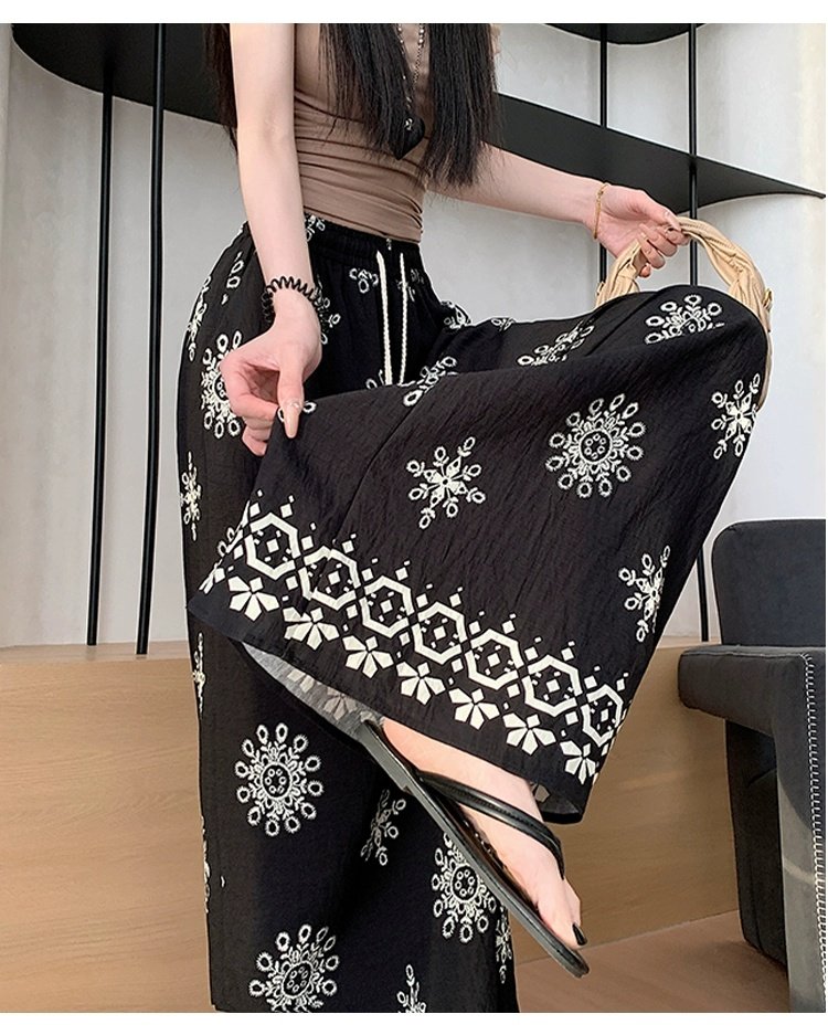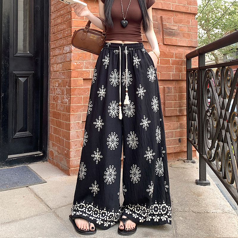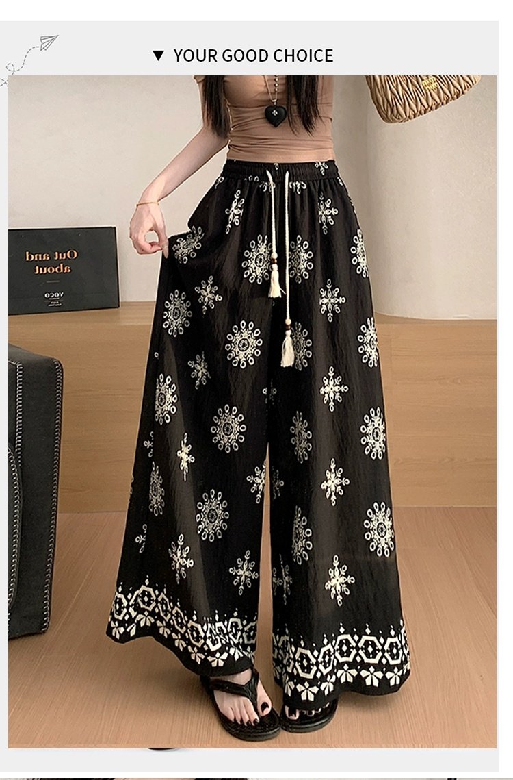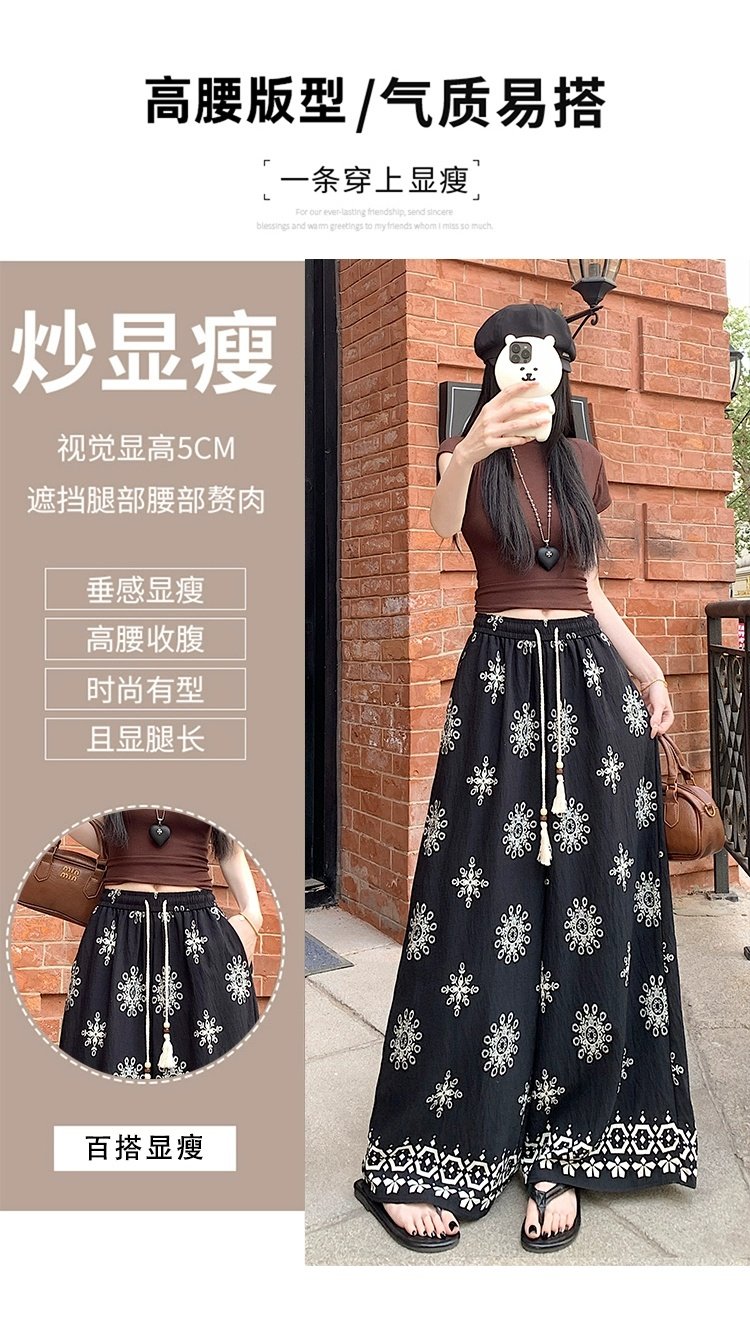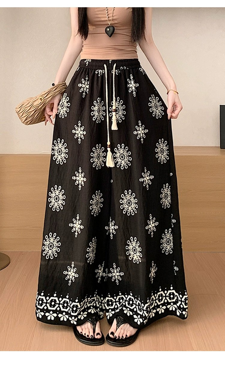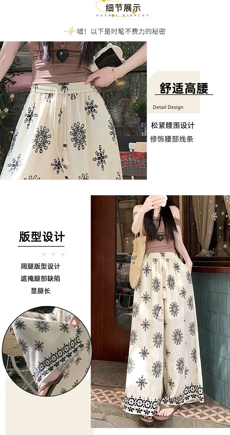 Широкие брюки в этническом стиле с цветочным принтом в стиле ретро, юбка для женщин, летние тонкие свободные утягивающие прямые универсальные повседневные брюки с высокой талией