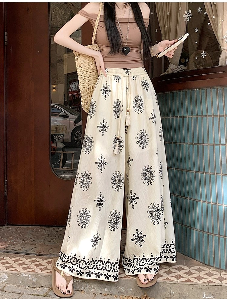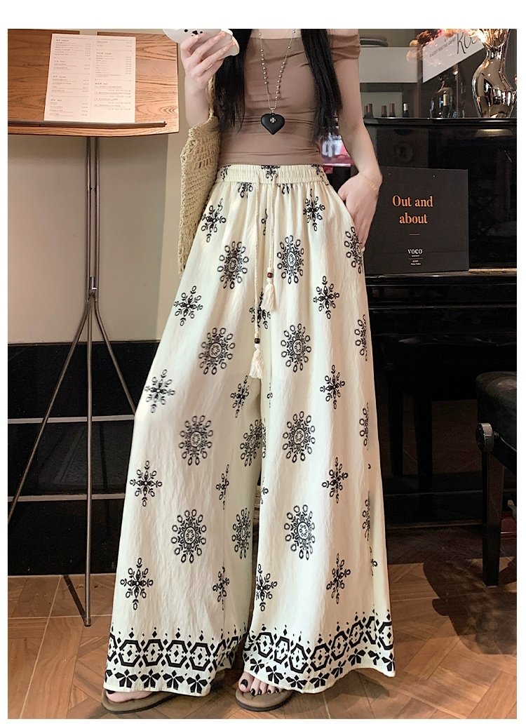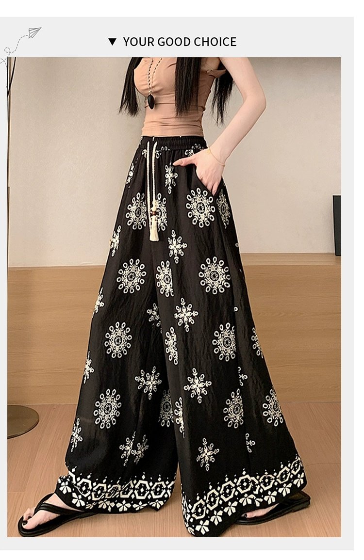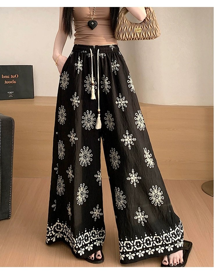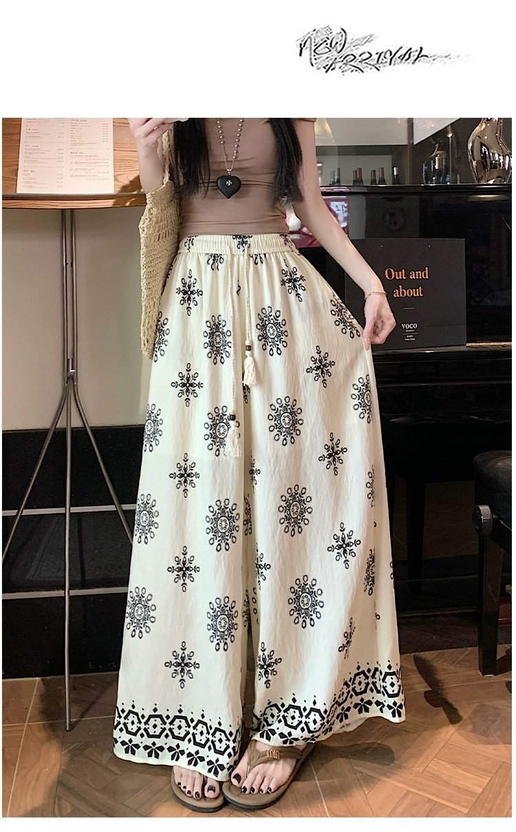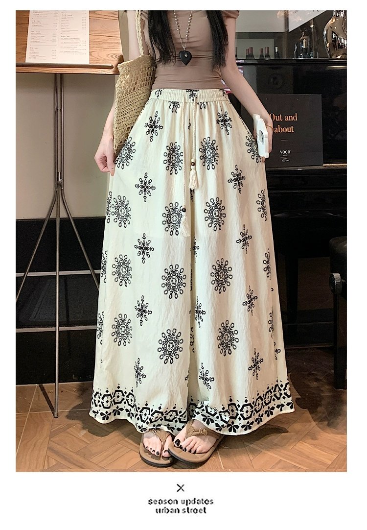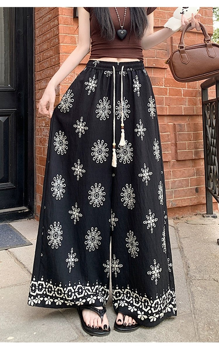 Широкие брюки в этническом стиле с цветочным принтом в стиле ретро, юбка для женщин, летние тонкие свободные утягивающие прямые универсальные повседневные брюки с высокой талией