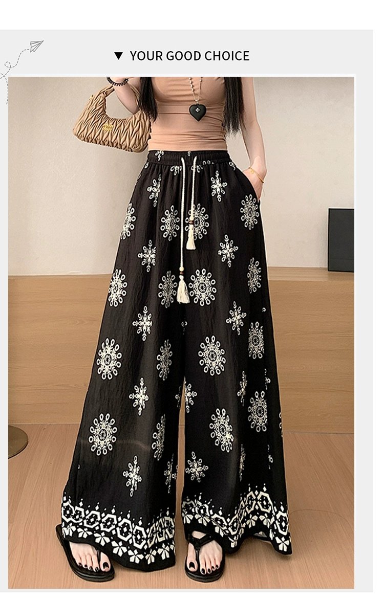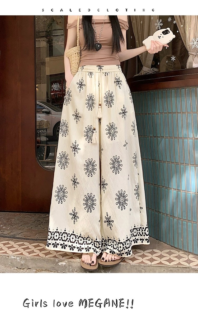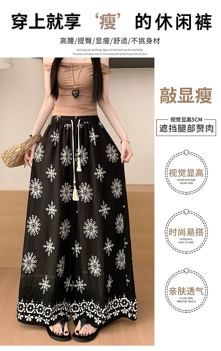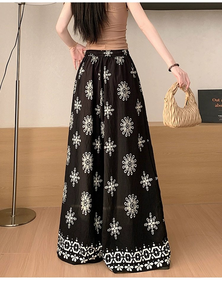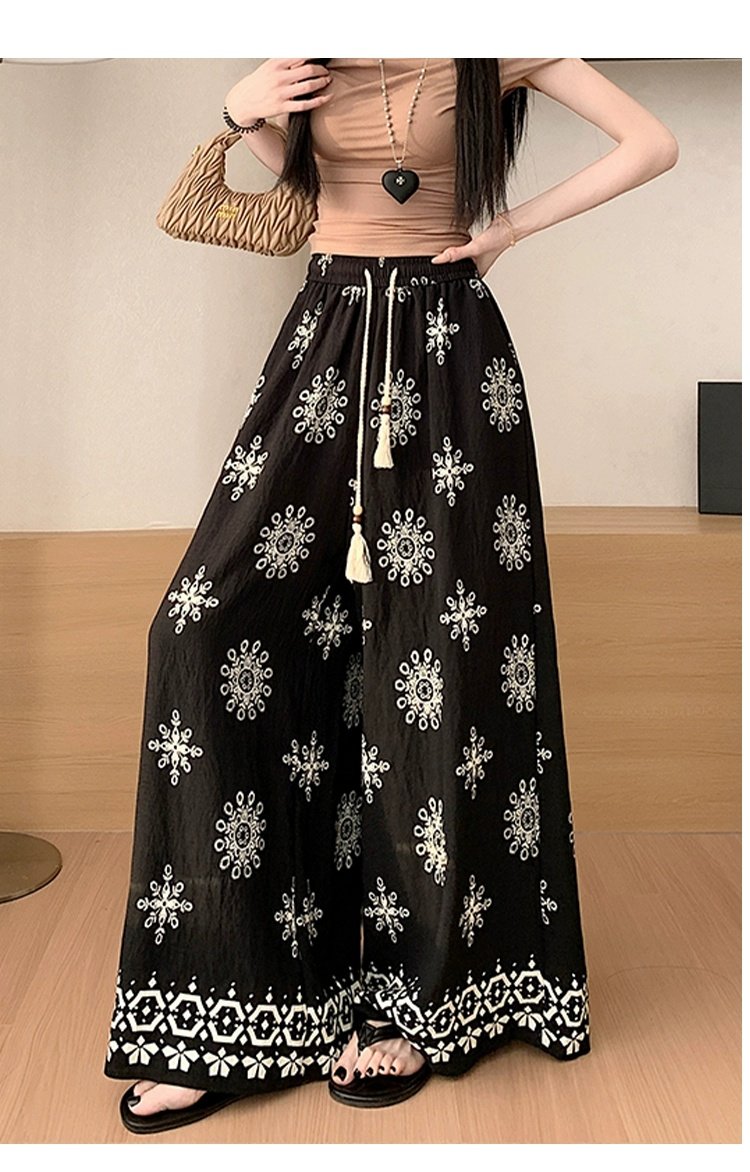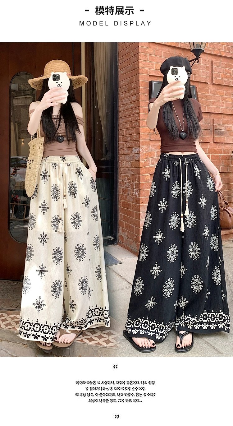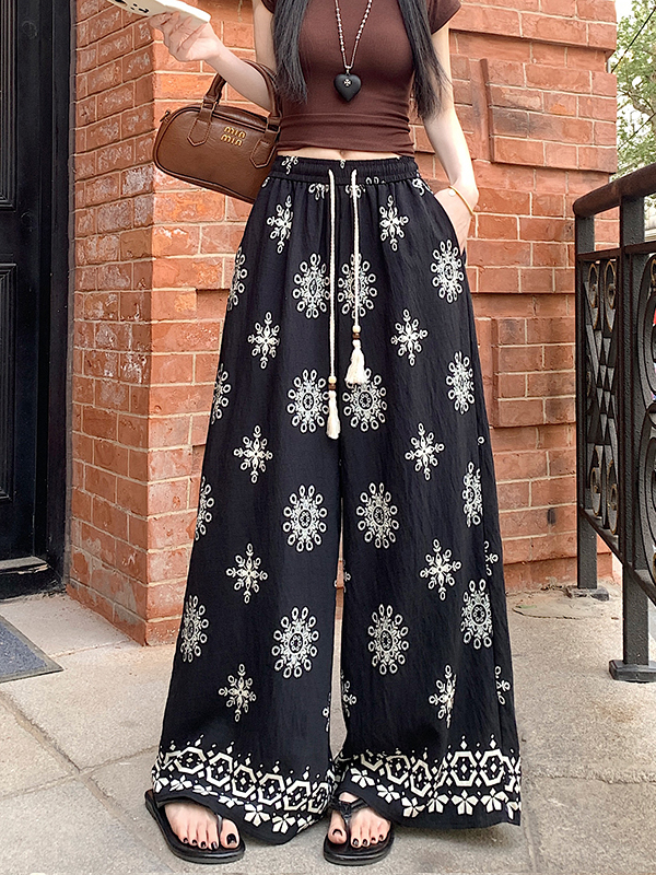Широкие брюки в этническом стиле с цветочным принтом в стиле ретро, юбка для женщин, летние тонкие свободные утягивающие прямые универсальные повседневные брюки с высокой талией