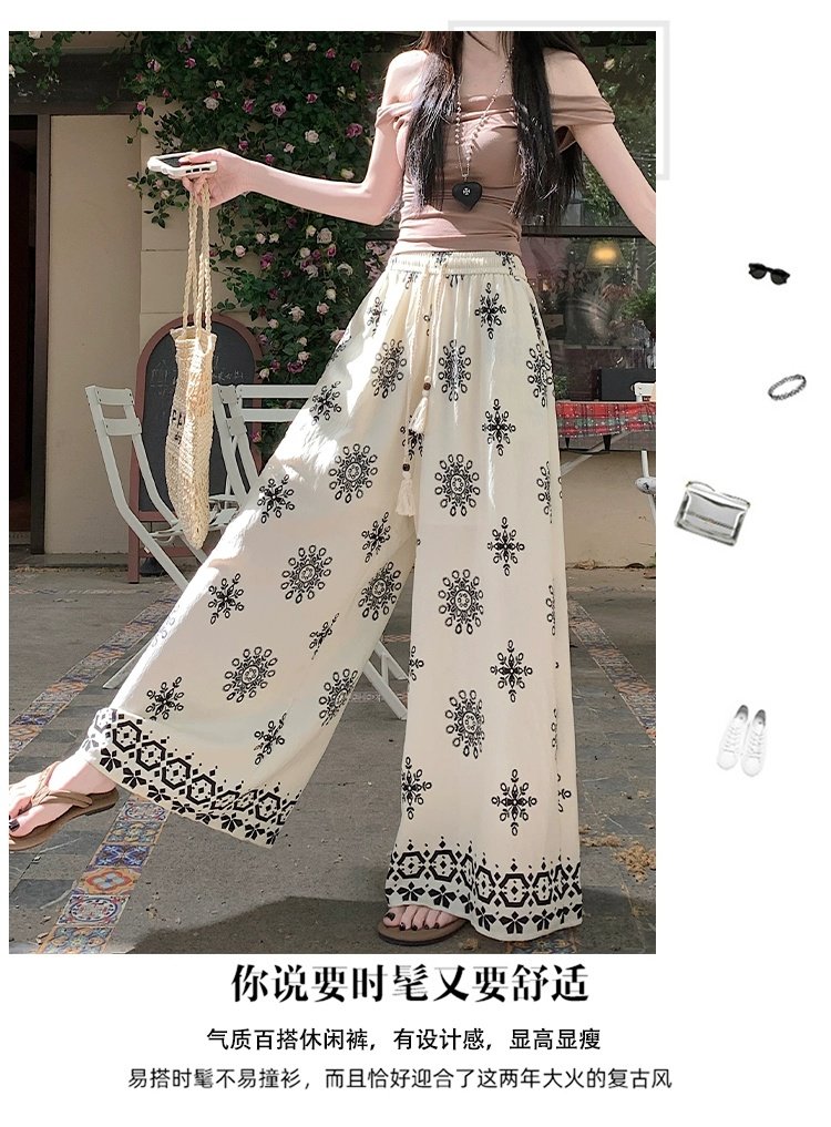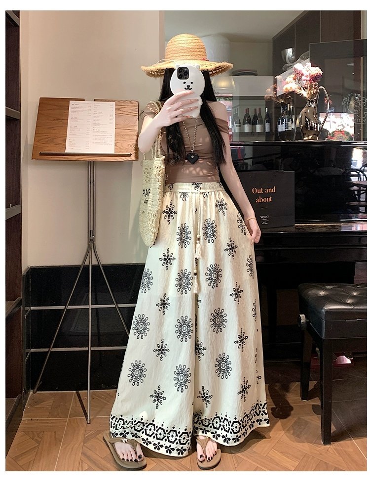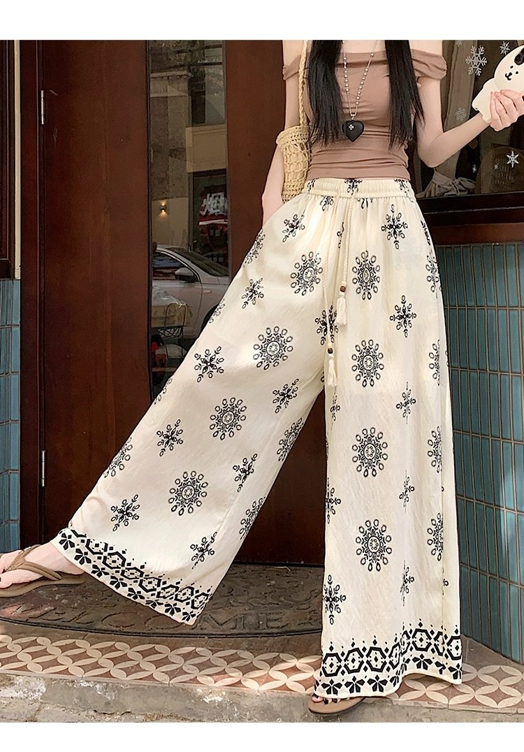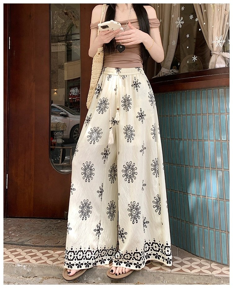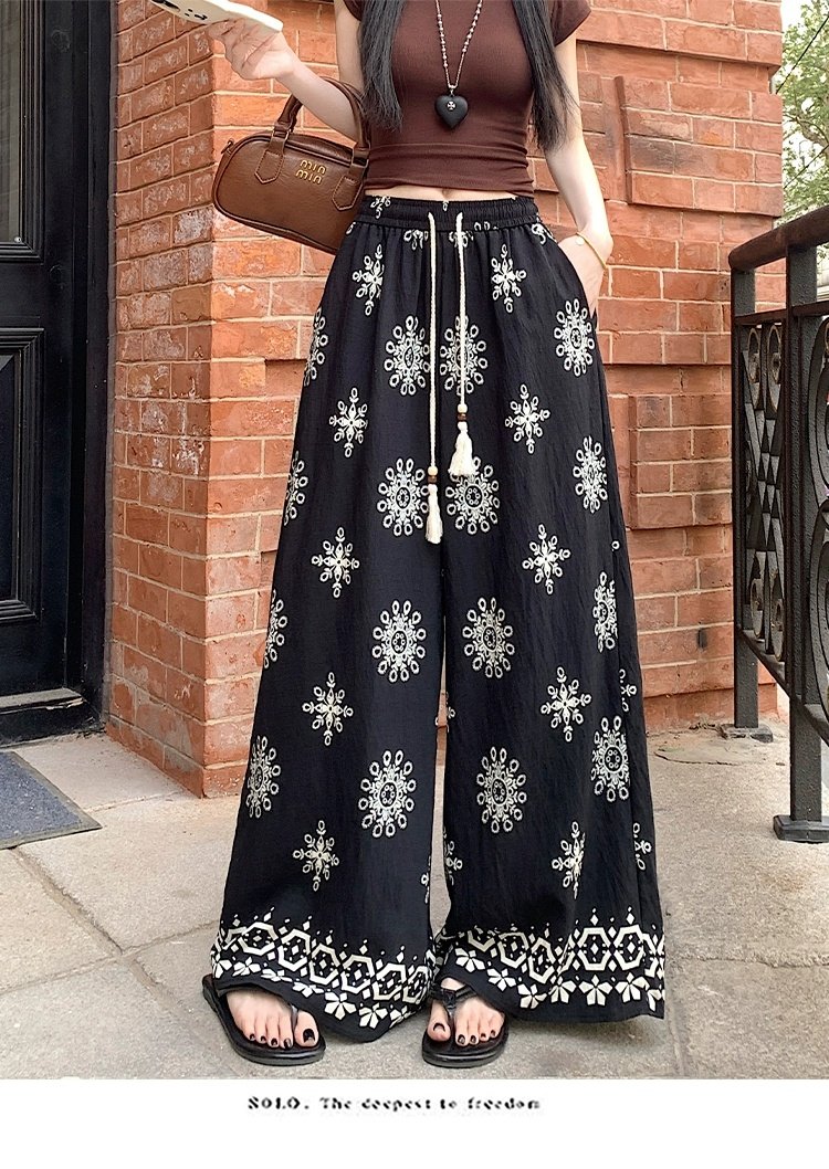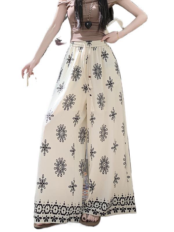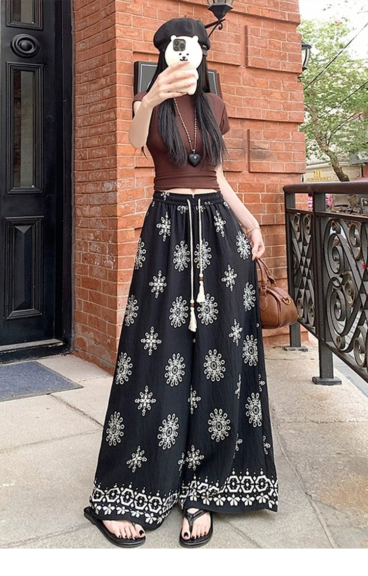 Широкие брюки в этническом стиле с цветочным принтом в стиле ретро, юбка для женщин, летние тонкие свободные утягивающие прямые универсальные повседневные брюки с высокой талией