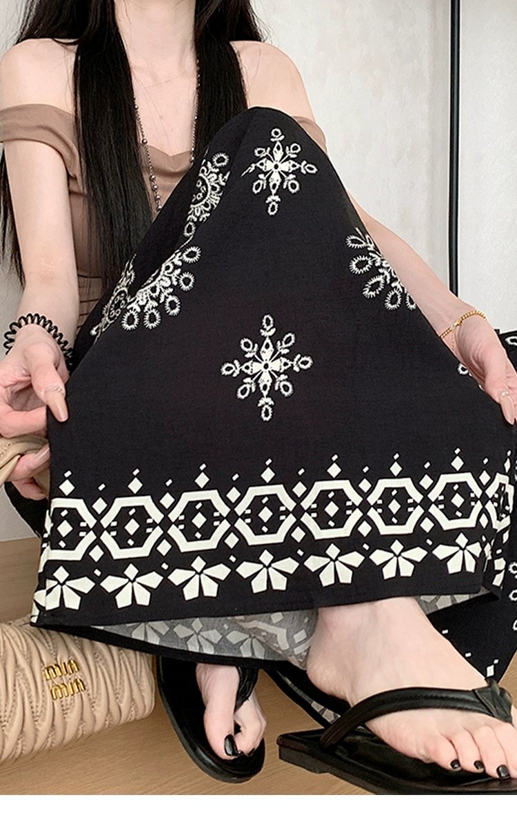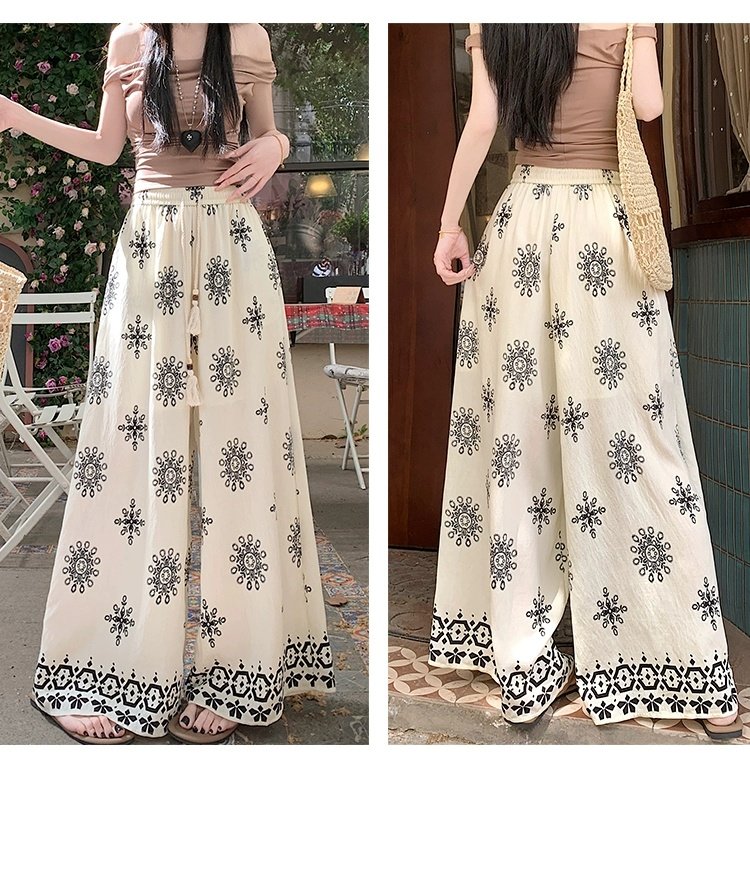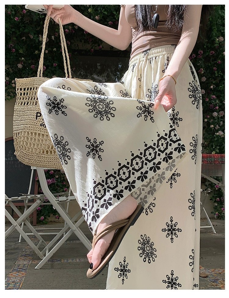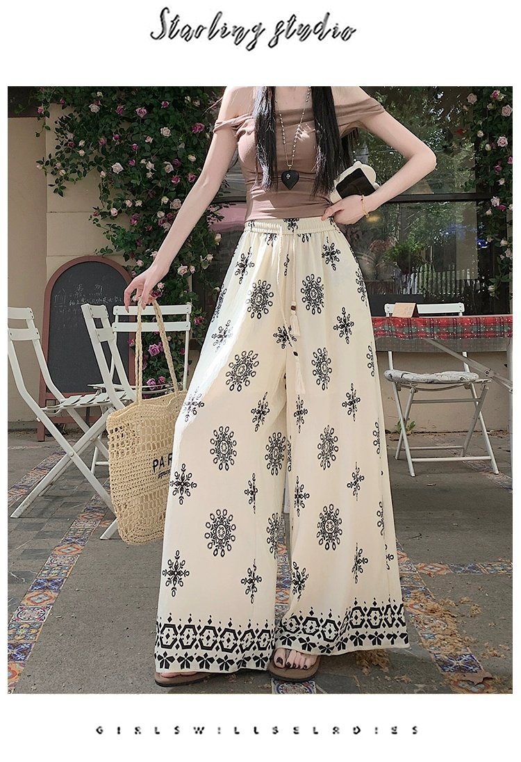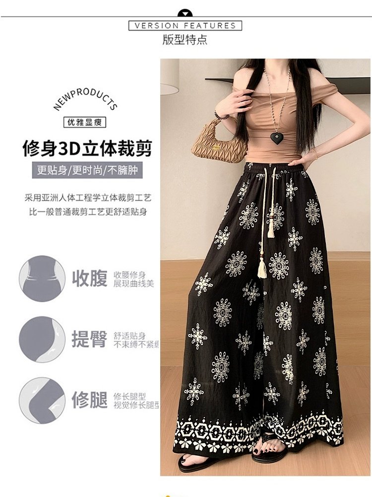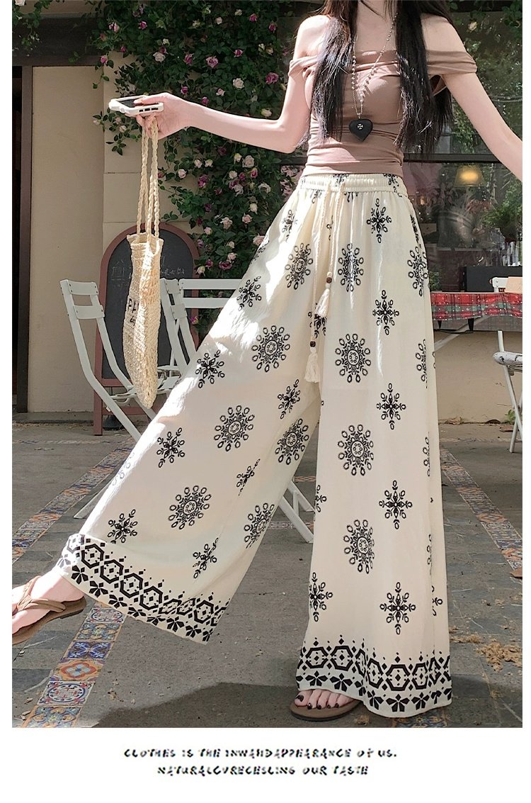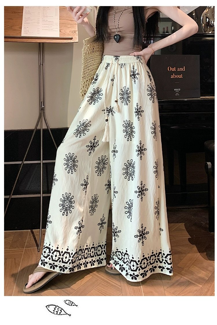 Широкие брюки в этническом стиле с цветочным принтом в стиле ретро, юбка для женщин, летние тонкие свободные утягивающие прямые универсальные повседневные брюки с высокой талией