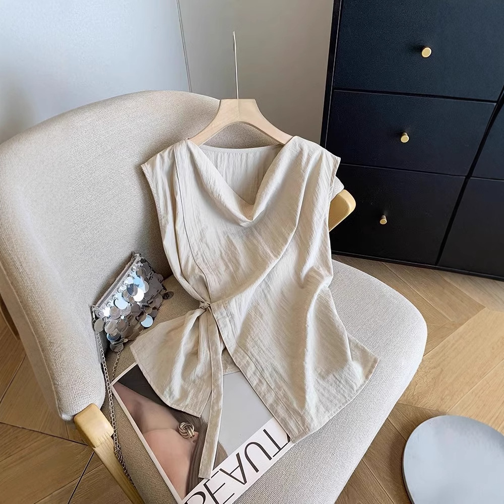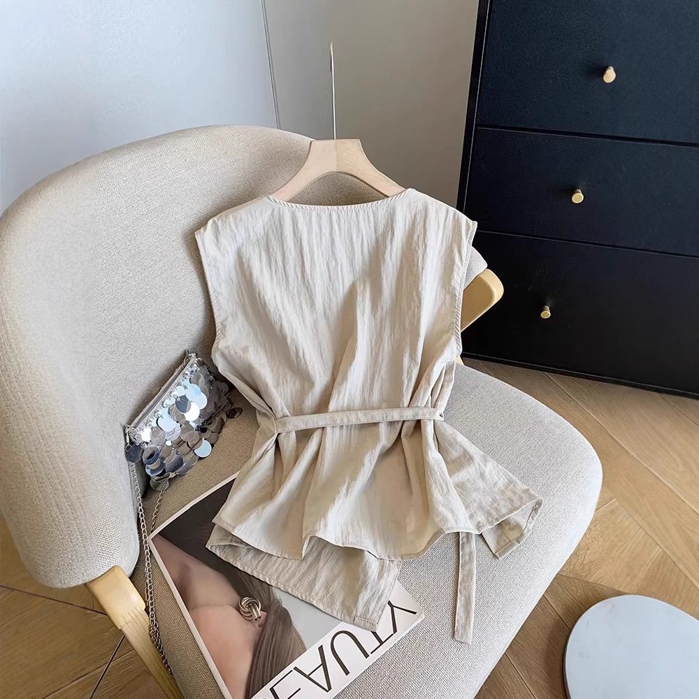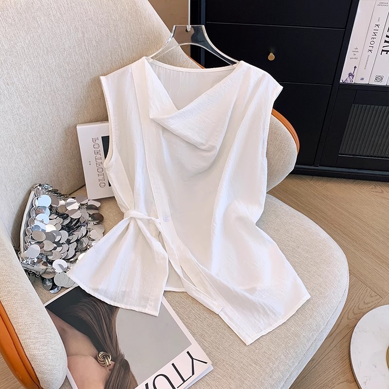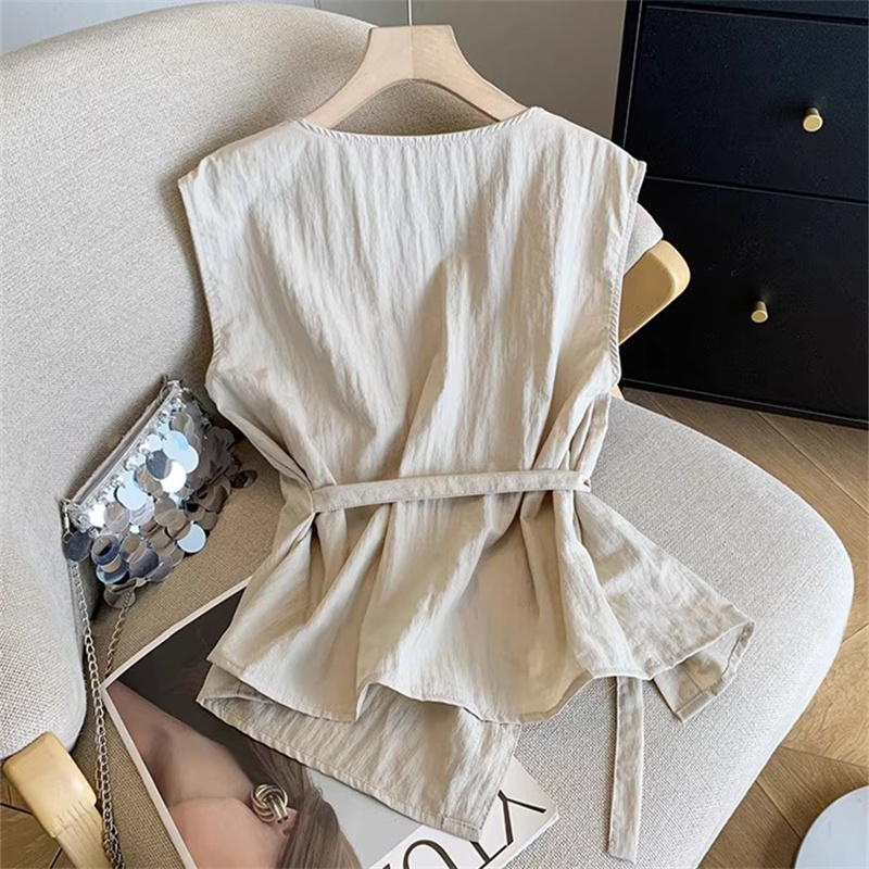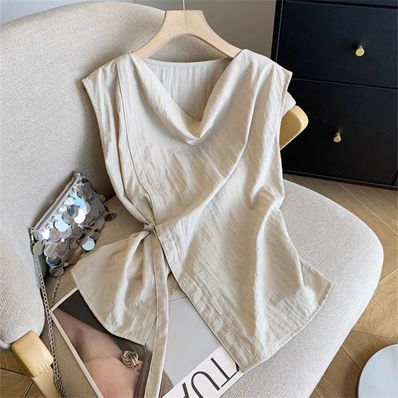 Нежный дизайн во французском стиле с разрезом и расклешенным воротником, женская рубашка без рукавов, летний топ-жилет с завышенной талией для миниатюрных размеров.