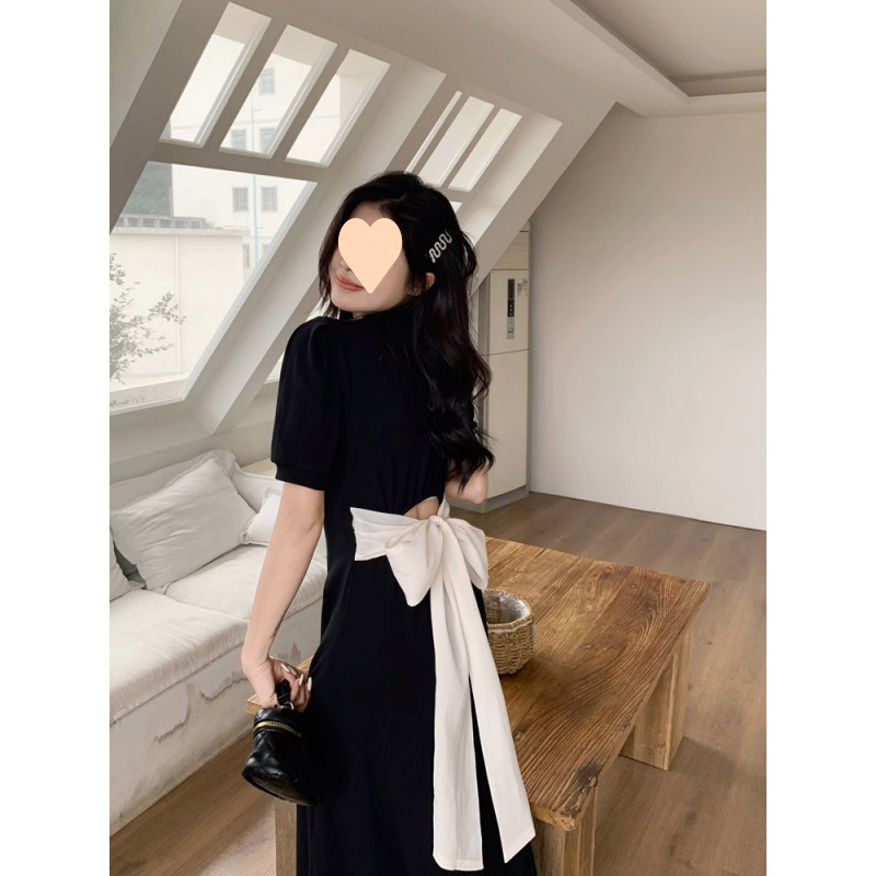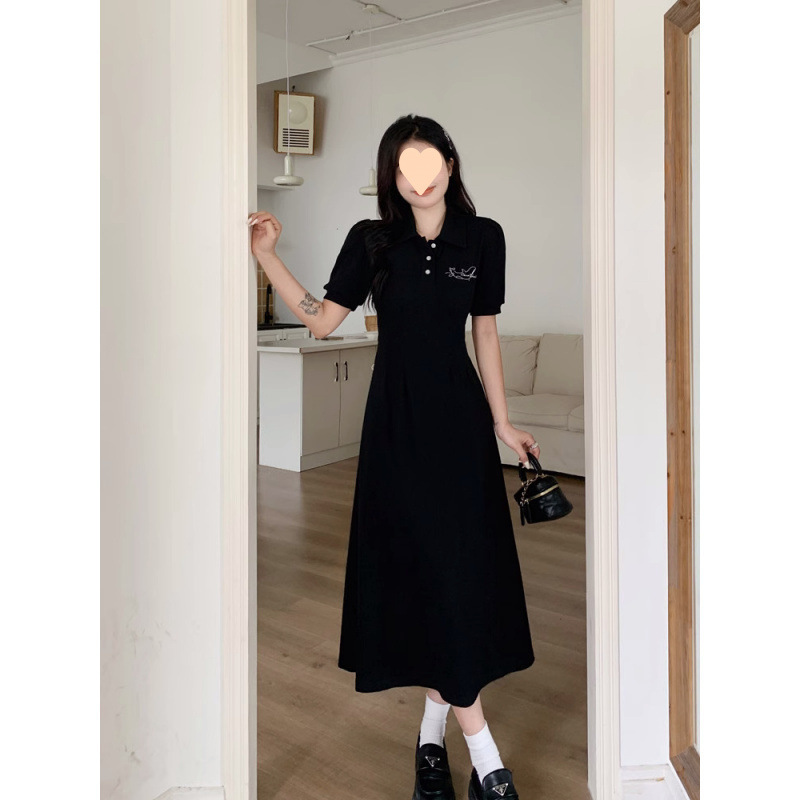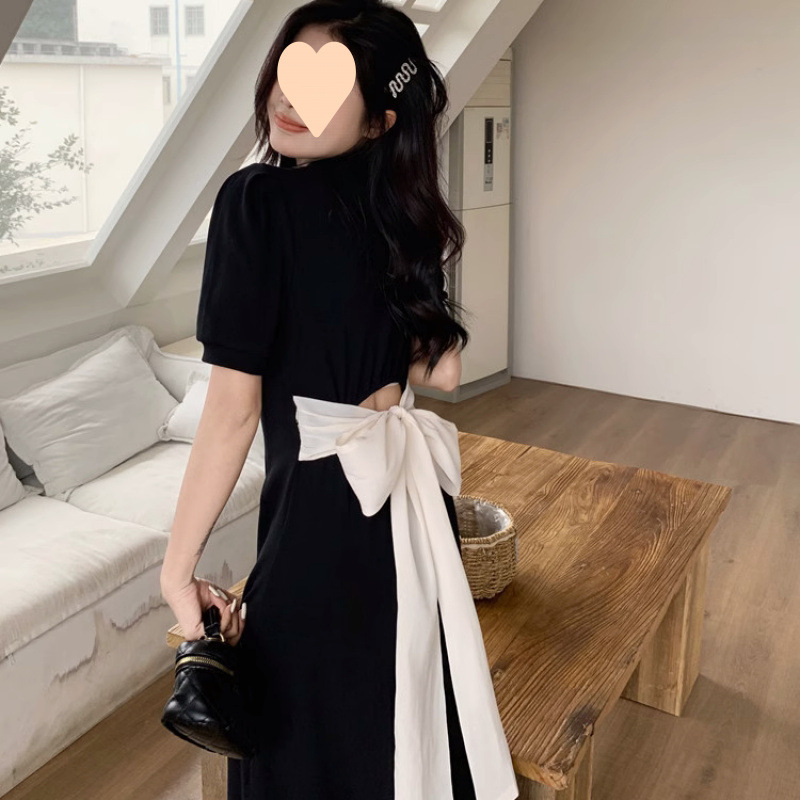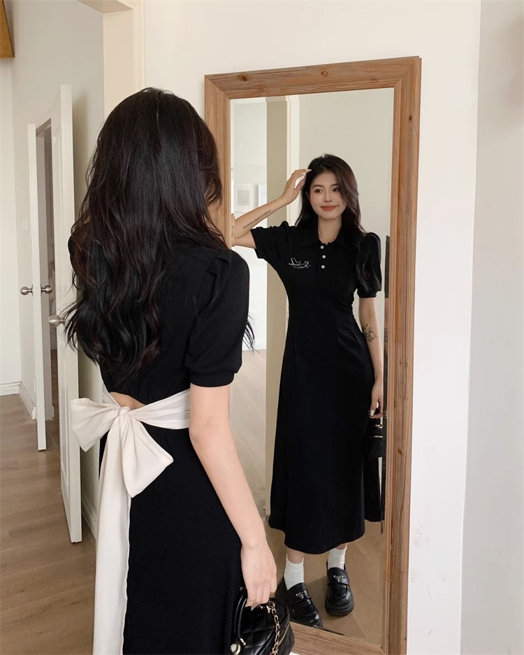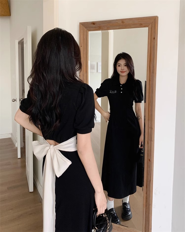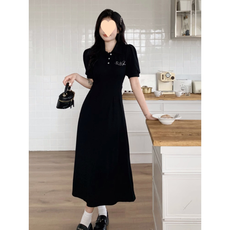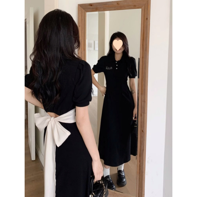 Платье-поло больших размеров для женщин летом, черная длинная юбка с бантом в стиле Хепберн, утягивающая талию, черная длинная юбка
