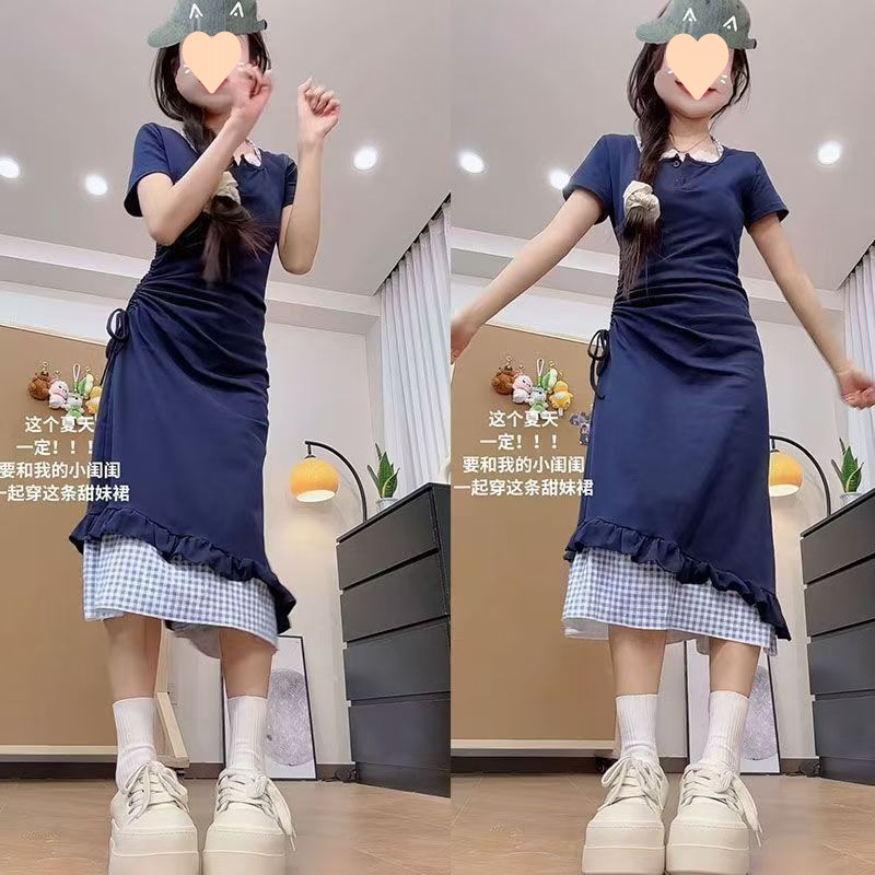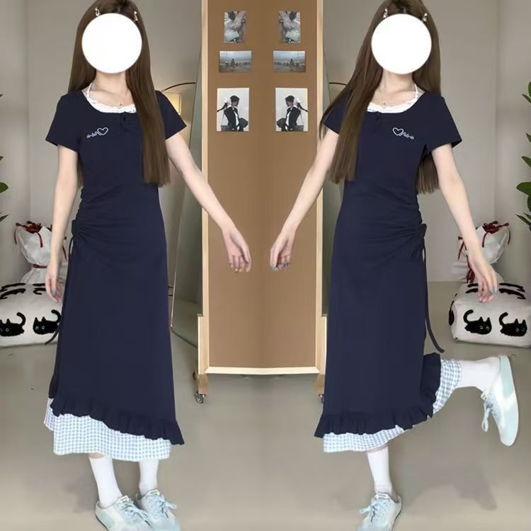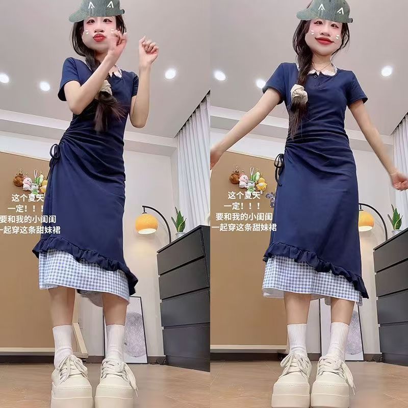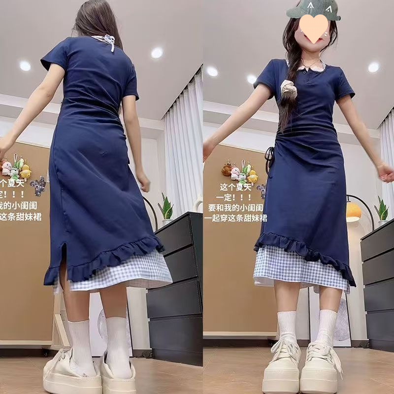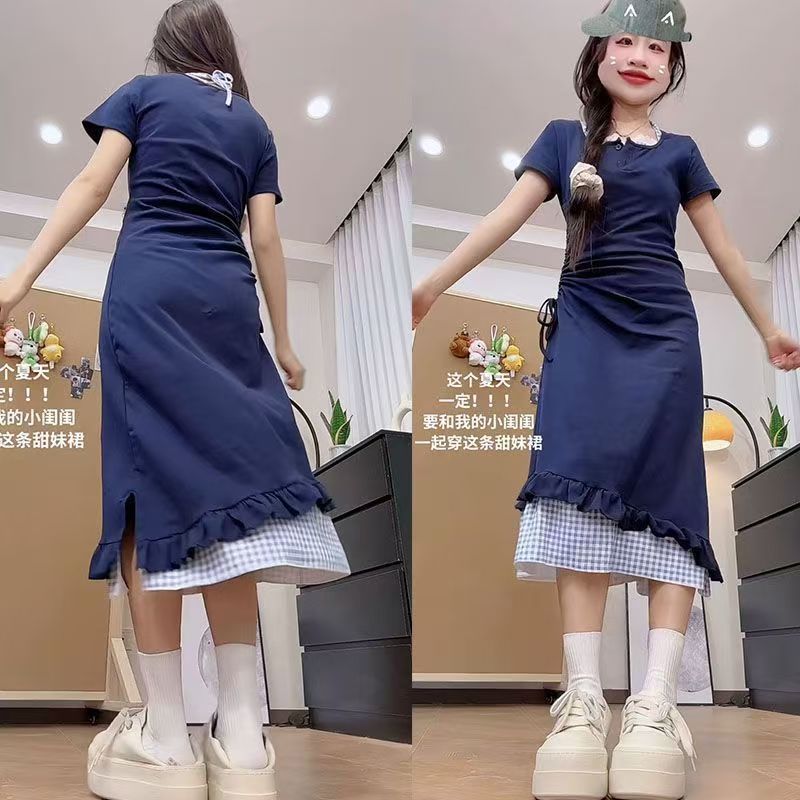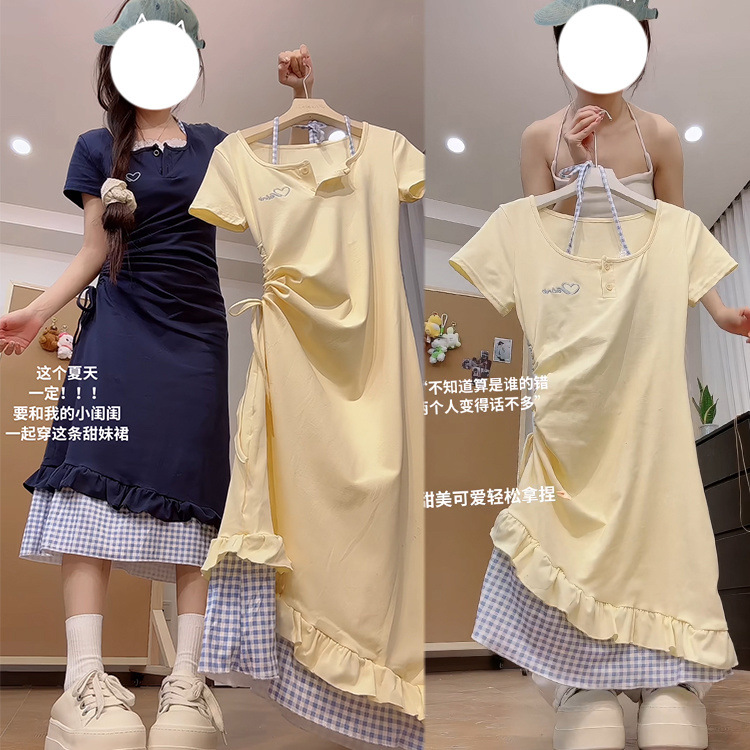 Корейское платье на подтяжках с воротником-стойкой, новое летнее платье Douyin, популярный стиль, длинная юбка из двух частей с плиссированной талией