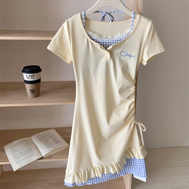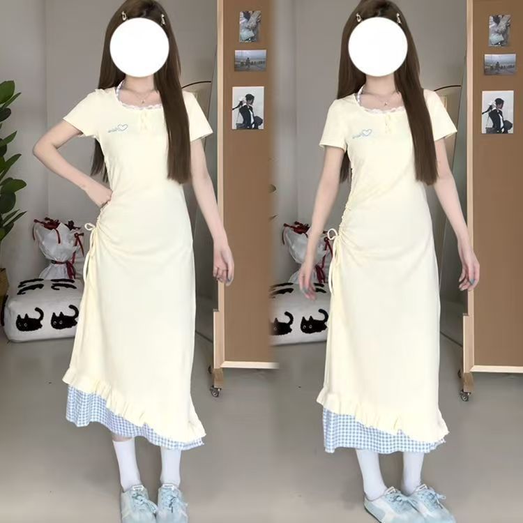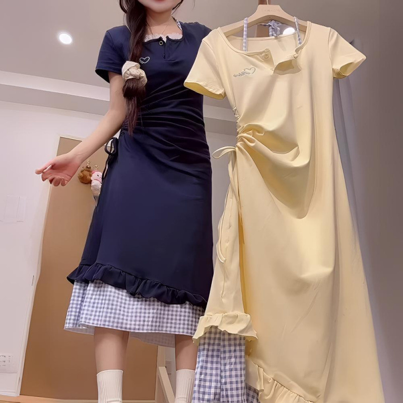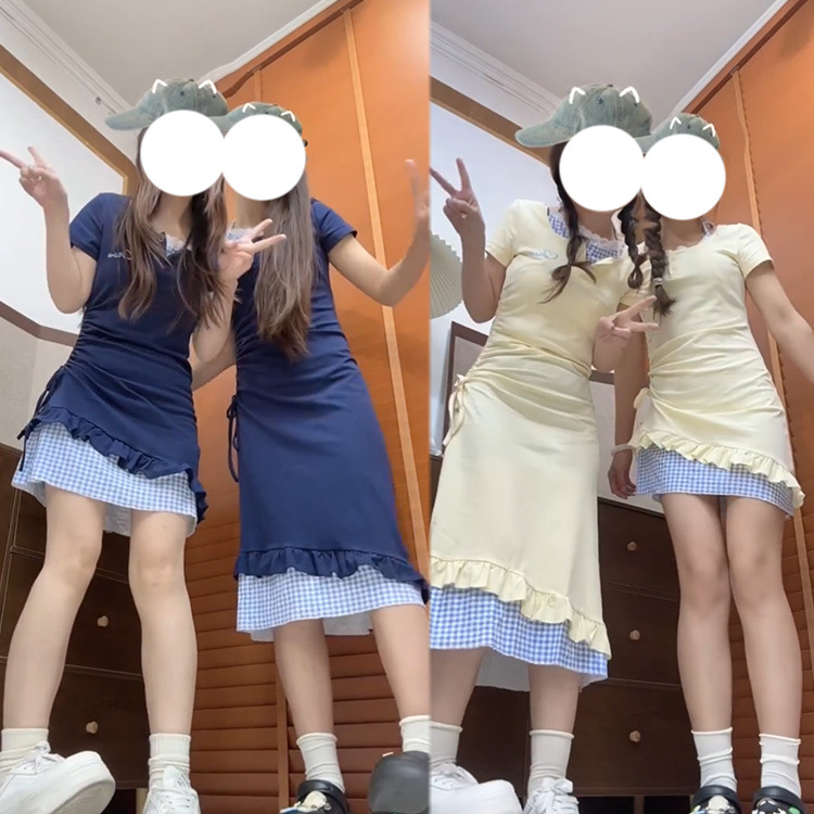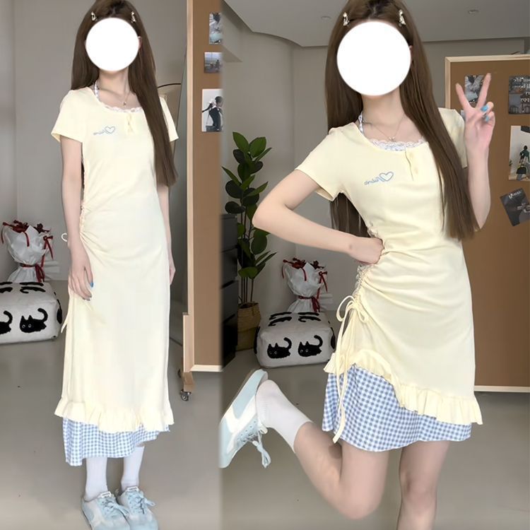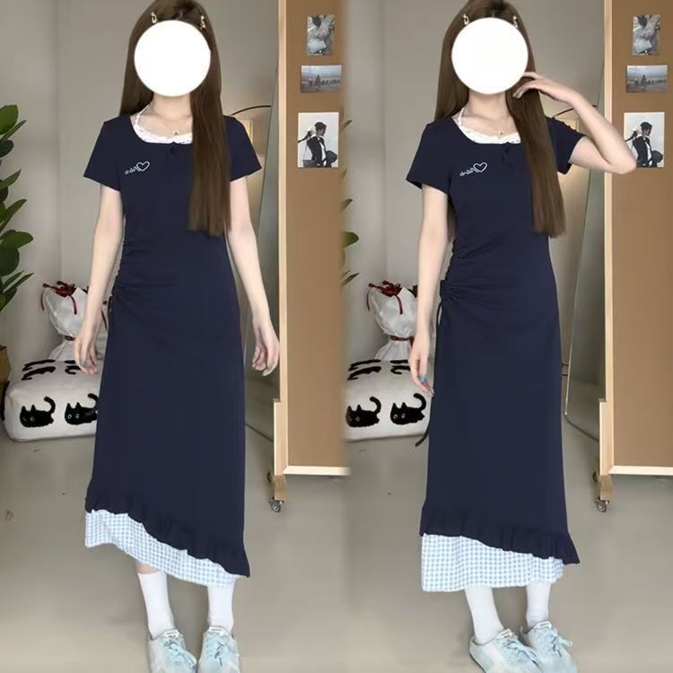 Корейское платье на подтяжках с воротником-стойкой, новое летнее платье Douyin, популярный стиль, длинная юбка из двух частей с плиссированной талией