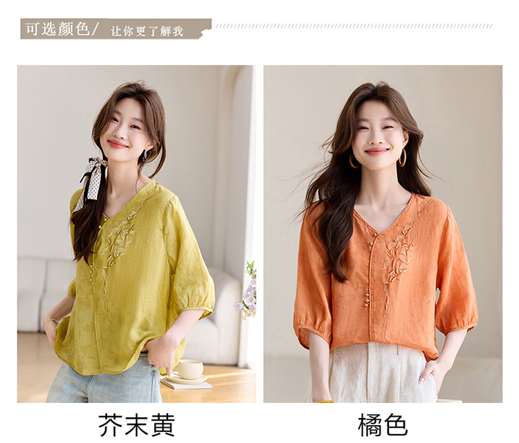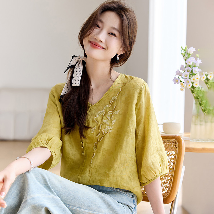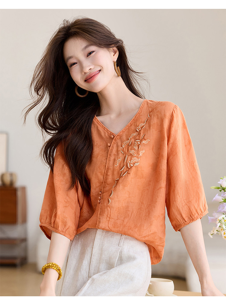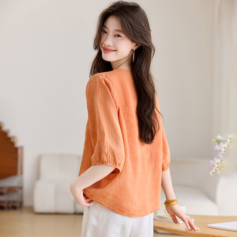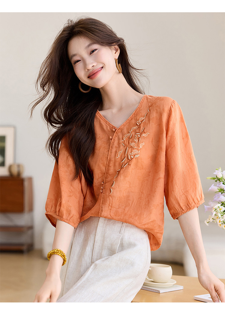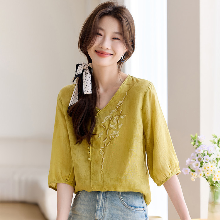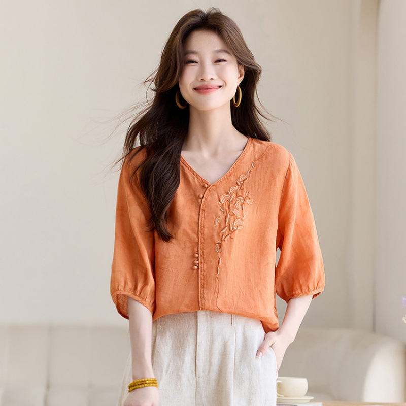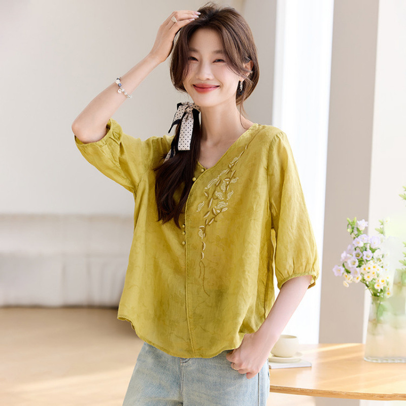 Женская летняя рубашка с V-образным вырезом и короткими рукавами, новая модель 2025 года, свободного кроя в ретро-стиле, в западном стиле.