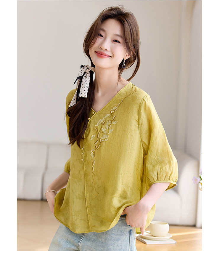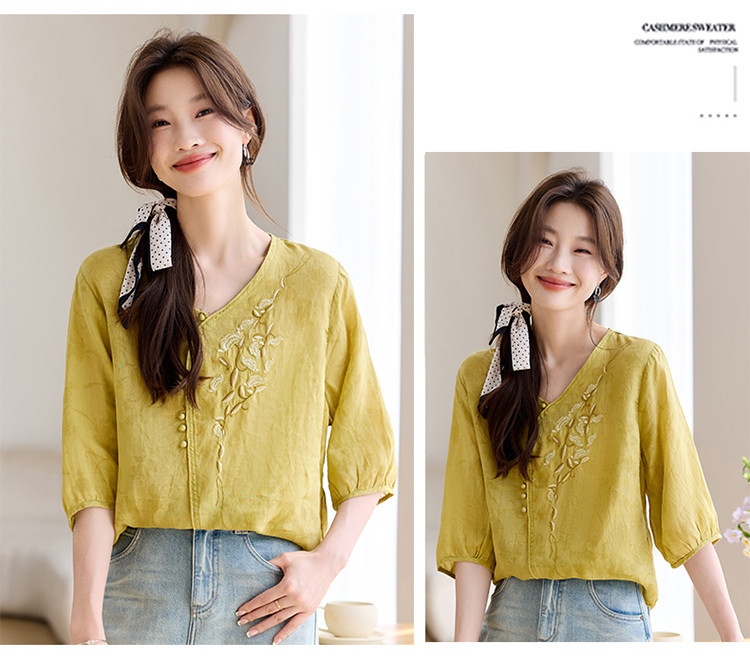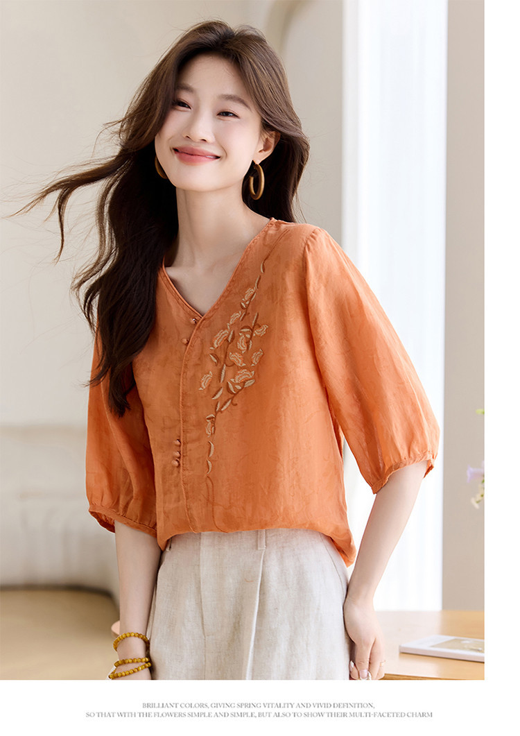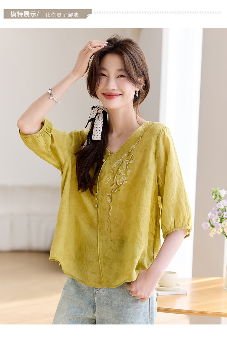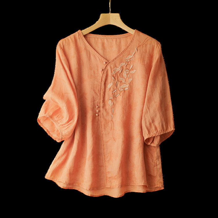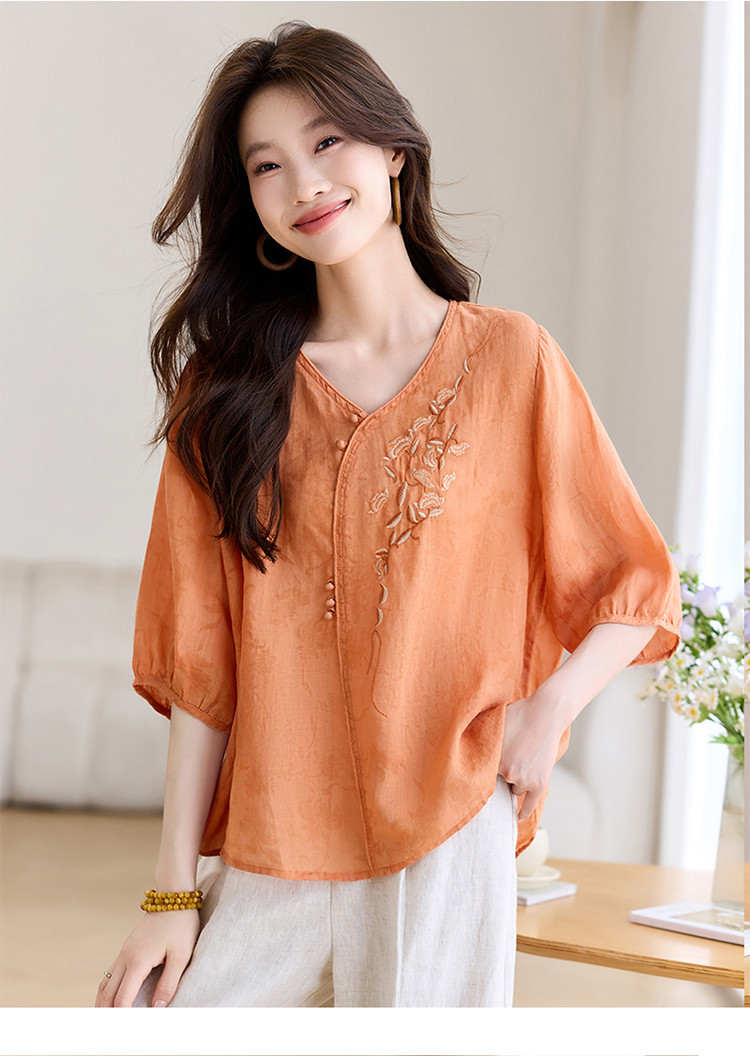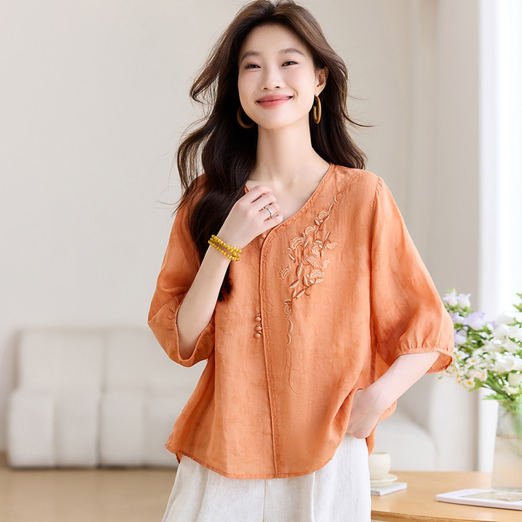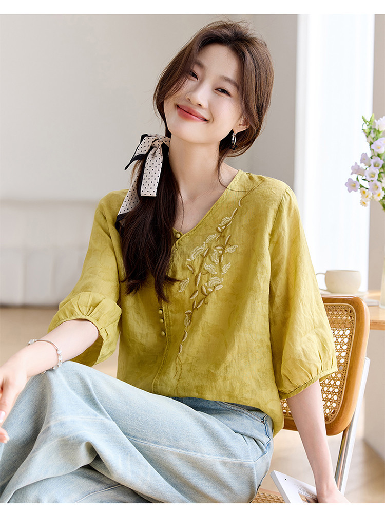 Женская летняя рубашка с V-образным вырезом и короткими рукавами, новая модель 2025 года, свободного кроя в ретро-стиле, в западном стиле.
